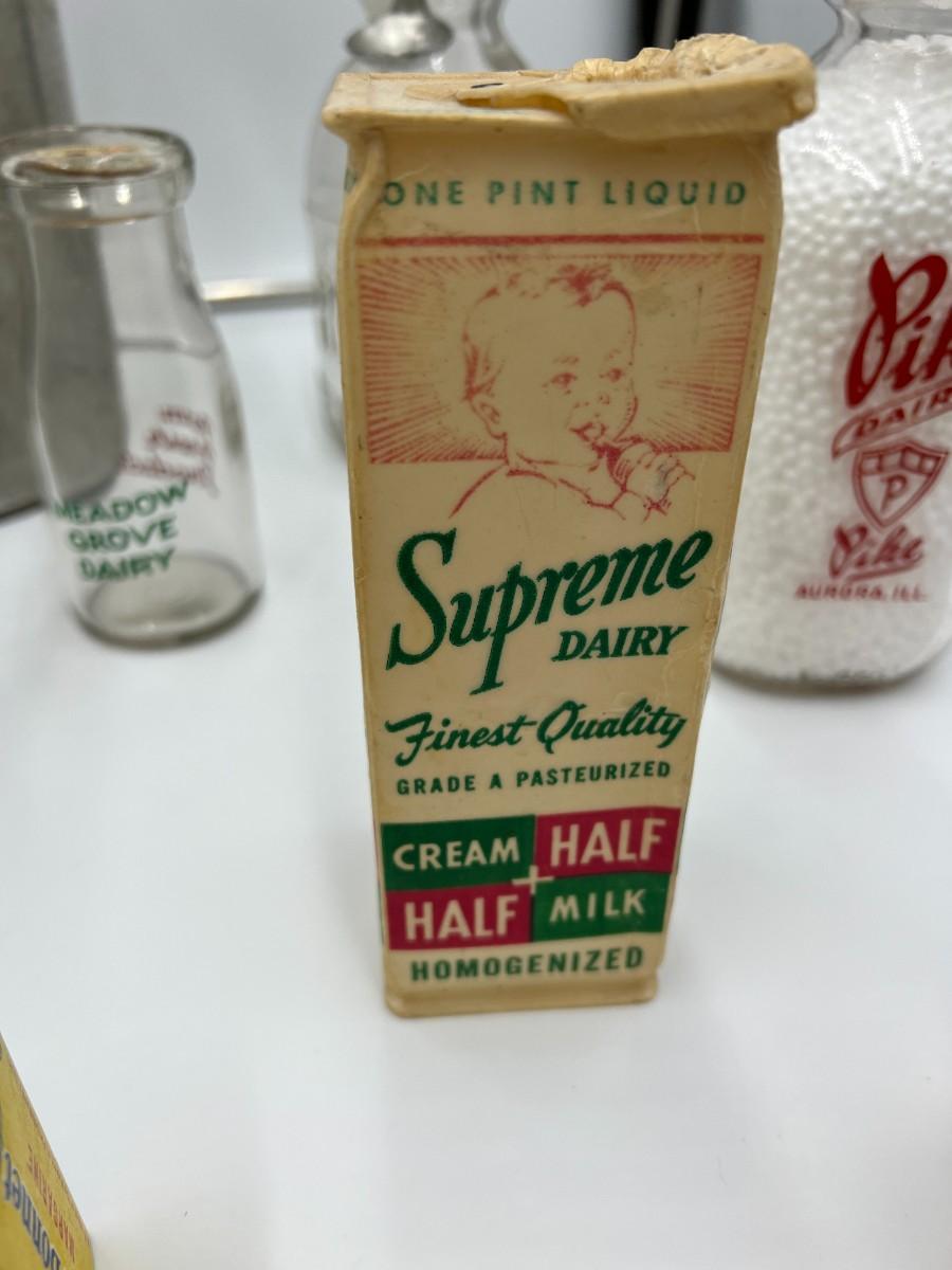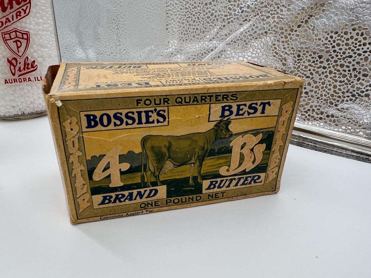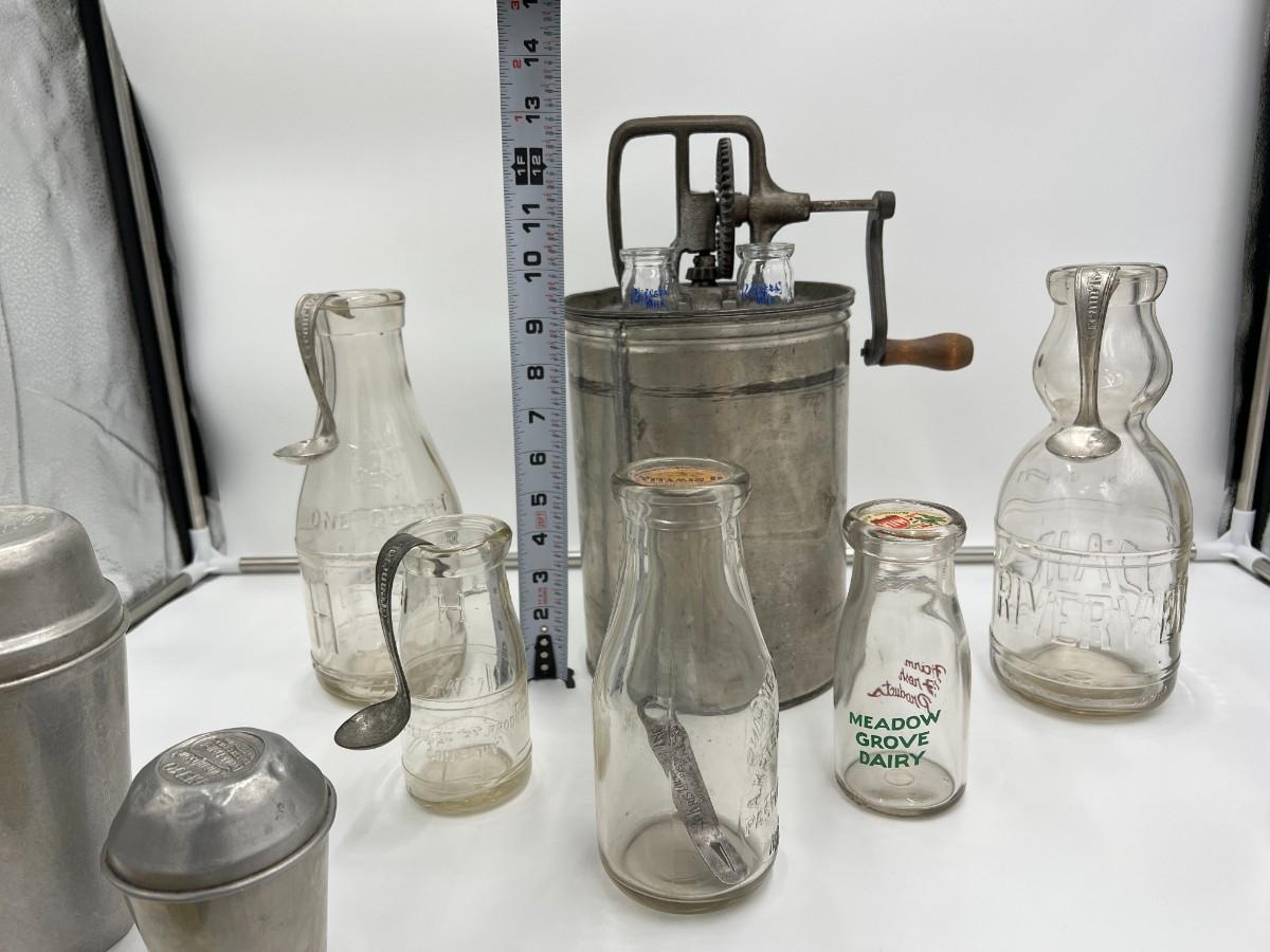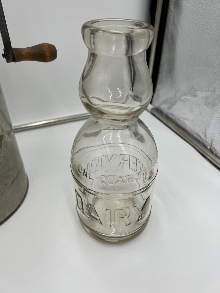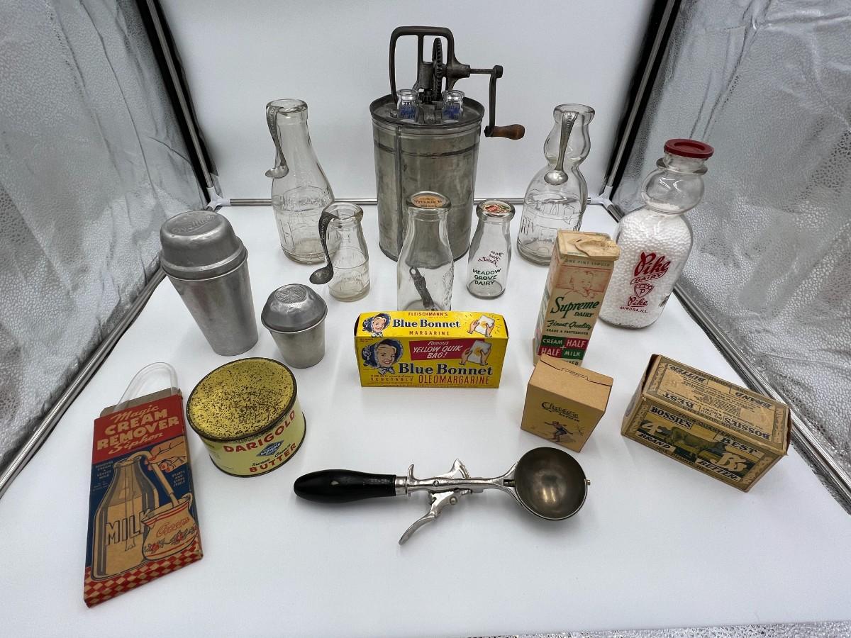 Fantastic lot of rare dairy collectibles and ephemera. Lot includes; antique Hollywood Western Dairy Products Half Pint bottle, Supreme Dairy Tacoma WA Cream Half and Half Milk carton, Rossers Milk Bessemer Alabama Rosser Farm Creamer bottle, Kristoferson Dairy Seattle WA embossed milk bottle with cap and bottle opener, Riverview Dairy Bubble Top 1 Quart Milk Bottle, Pike Dairy Bubble Top 1 Quart glass milk bottle, rare vintage Chase's Ice Cream paper box container from Provo Utah One Half Pint, Antique cream top spoons, Darigold Sweet Cream Butter Tin Can 1 Pound, 1950s Blue Bonnet Margarine Box, Bossie's Best Butter Box, and a Tin and Cast Iron butter churn with hand crank.