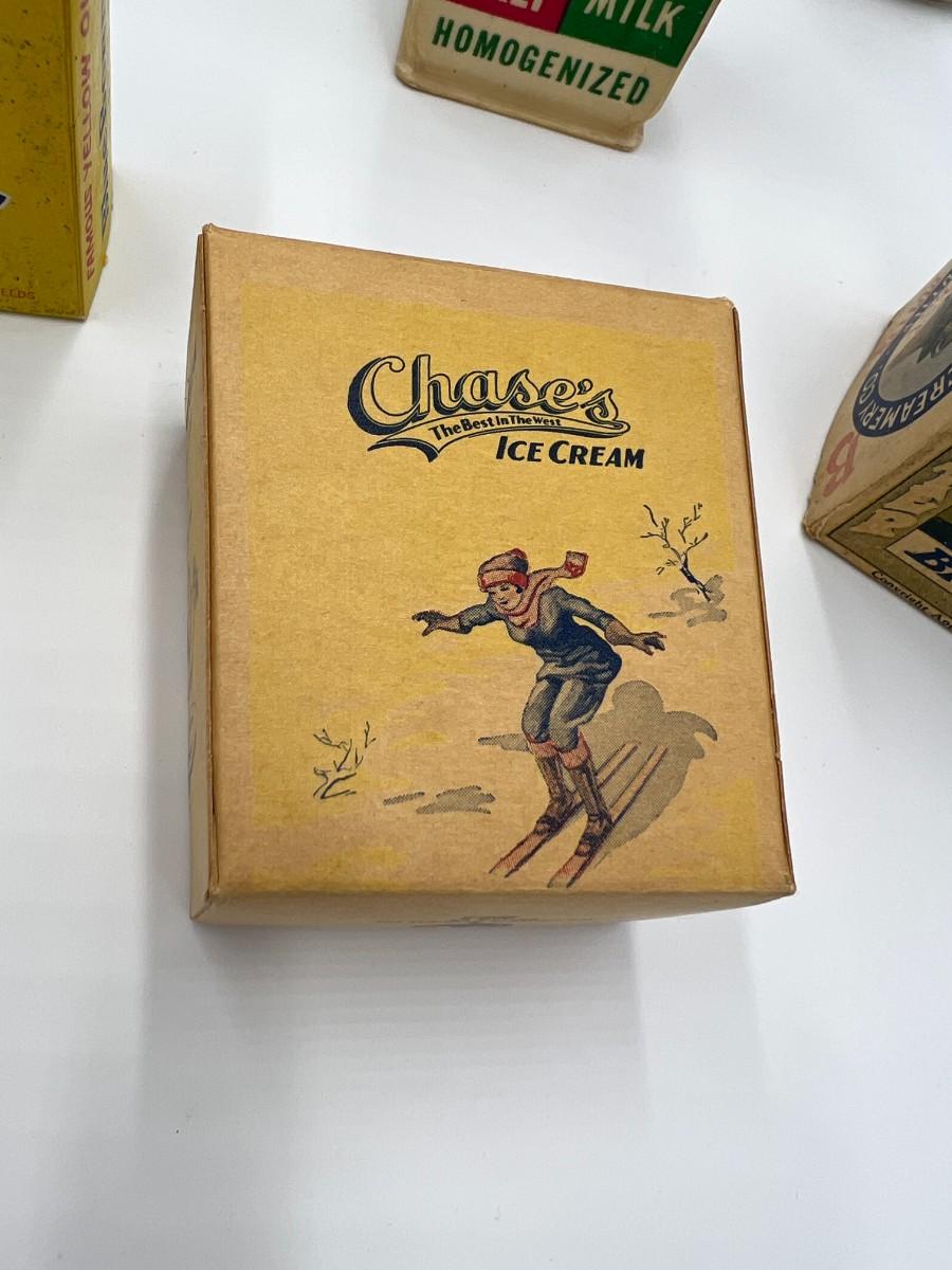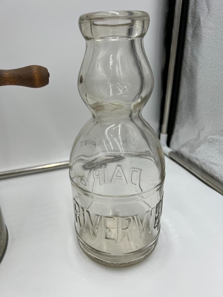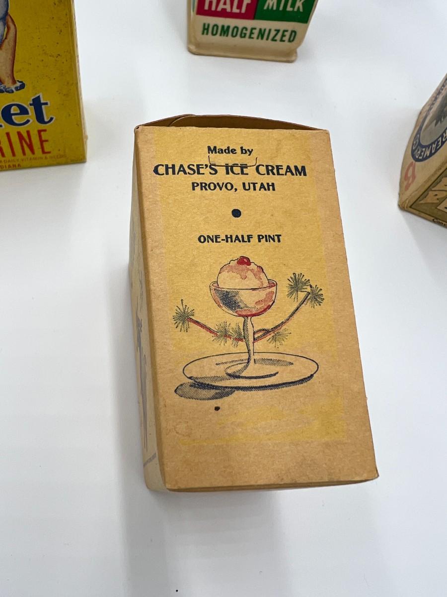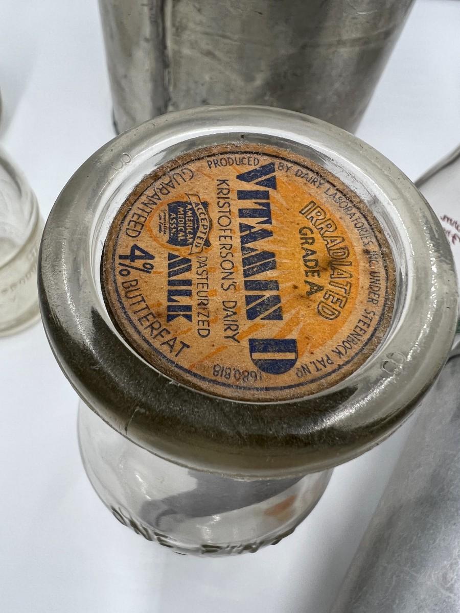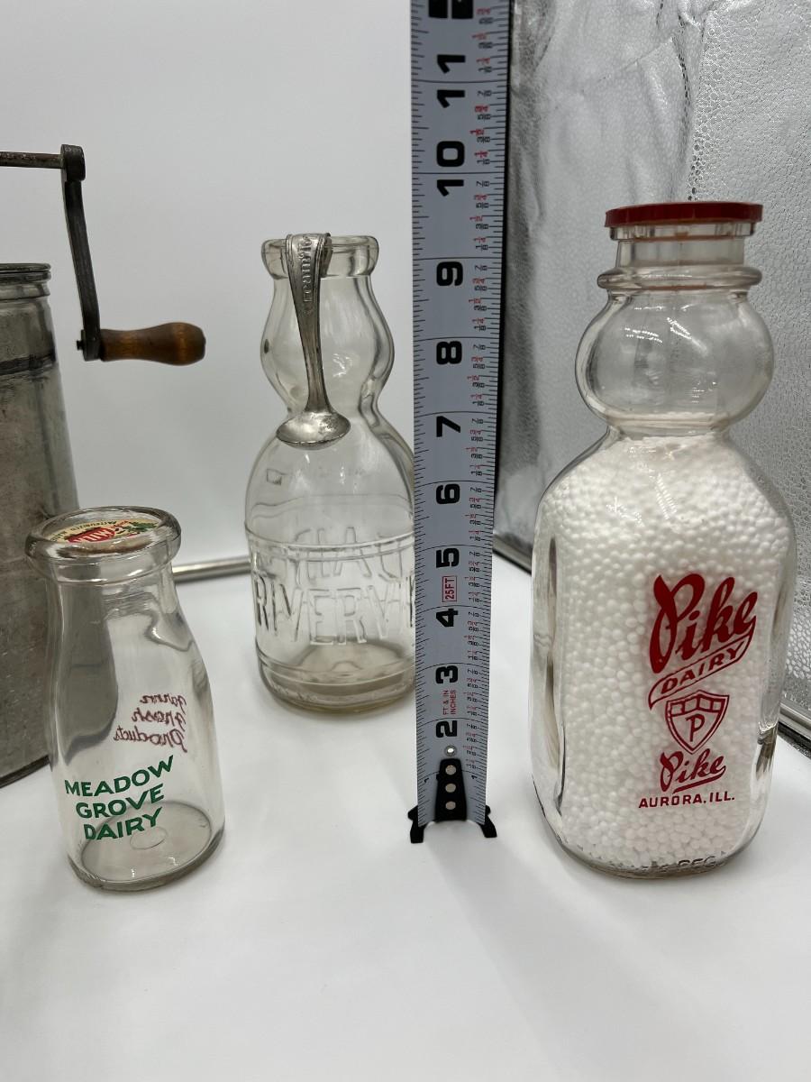 Fantastic lot of rare dairy collectibles and ephemera. Lot includes; antique Hollywood Western Dairy Products Half Pint bottle, Supreme Dairy Tacoma WA Cream Half and Half Milk carton, Rossers Milk Bessemer Alabama Rosser Farm Creamer bottle, Kristoferson Dairy Seattle WA embossed milk bottle with cap and bottle opener, Riverview Dairy Bubble Top 1 Quart Milk Bottle, Pike Dairy Bubble Top 1 Quart glass milk bottle, rare vintage Chase's Ice Cream paper box container from Provo Utah One Half Pint, Antique cream top spoons, Darigold Sweet Cream Butter Tin Can 1 Pound, 1950s Blue Bonnet Margarine Box, Bossie's Best Butter Box, and a Tin and Cast Iron butter churn with hand crank.