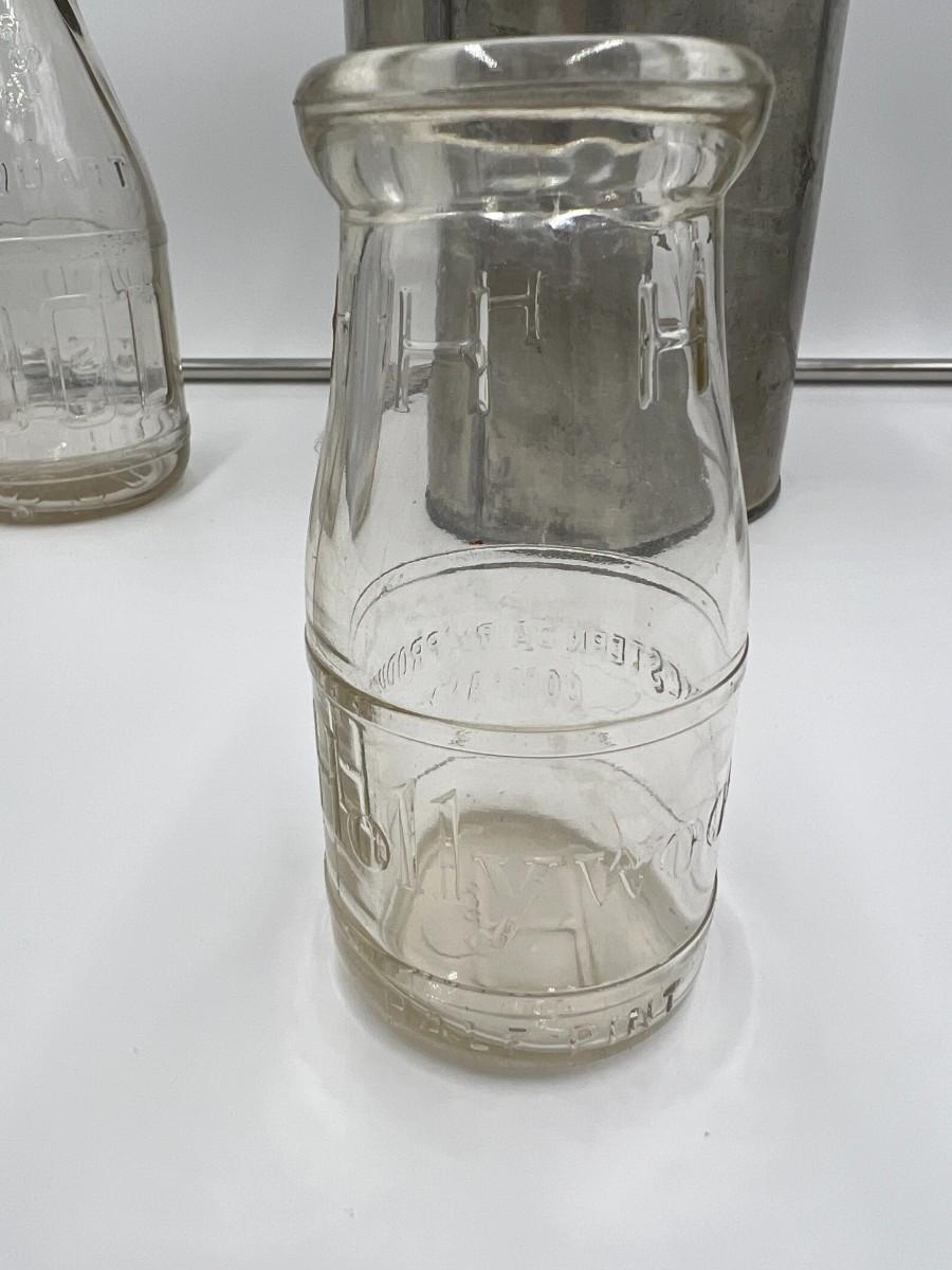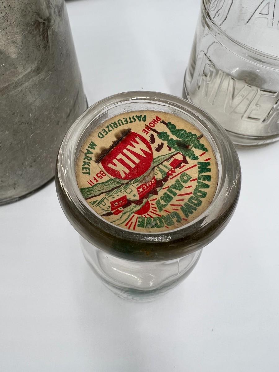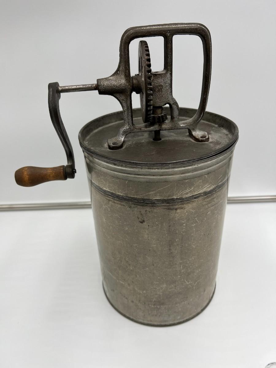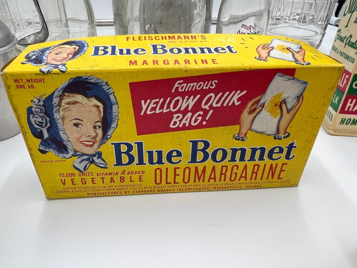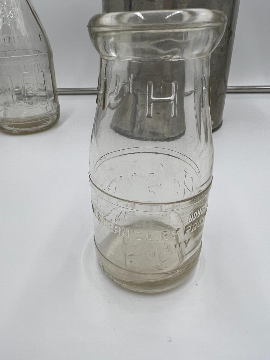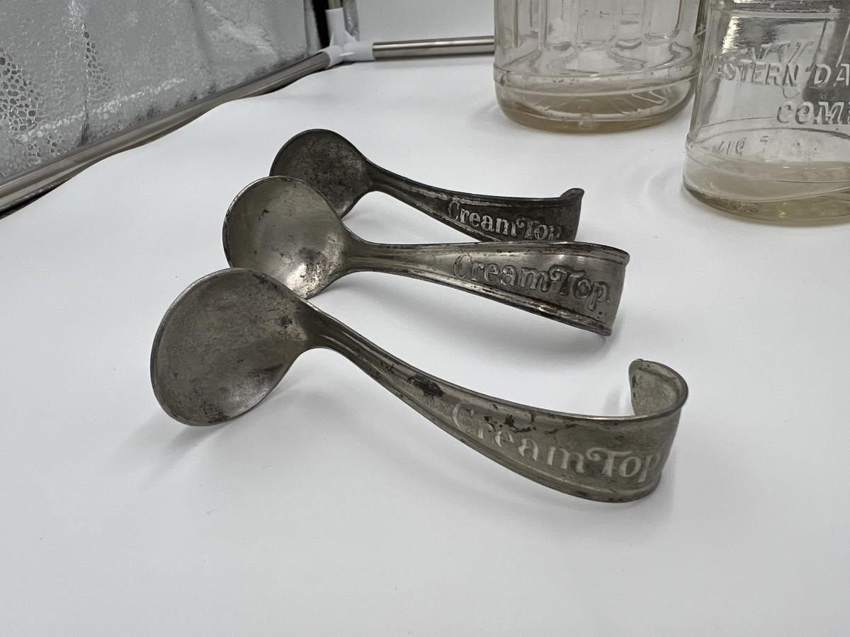 Fantastic lot of rare dairy collectibles and ephemera. Lot includes; antique Hollywood Western Dairy Products Half Pint bottle, Supreme Dairy Tacoma WA Cream Half and Half Milk carton, Rossers Milk Bessemer Alabama Rosser Farm Creamer bottle, Kristoferson Dairy Seattle WA embossed milk bottle with cap and bottle opener, Riverview Dairy Bubble Top 1 Quart Milk Bottle, Pike Dairy Bubble Top 1 Quart glass milk bottle, rare vintage Chase's Ice Cream paper box container from Provo Utah One Half Pint, Antique cream top spoons, Darigold Sweet Cream Butter Tin Can 1 Pound, 1950s Blue Bonnet Margarine Box, Bossie's Best Butter Box, and a Tin and Cast Iron butter churn with hand crank.
