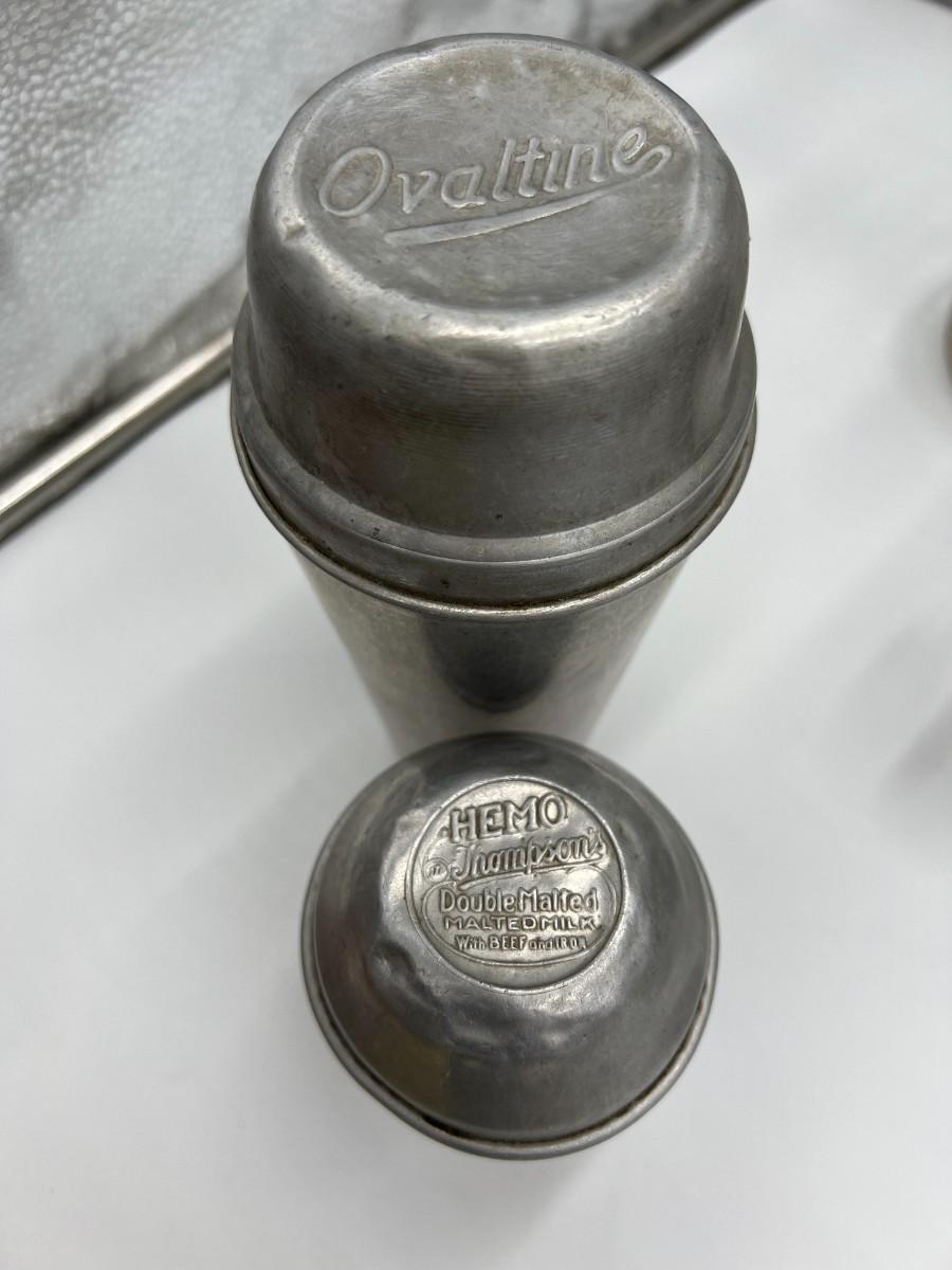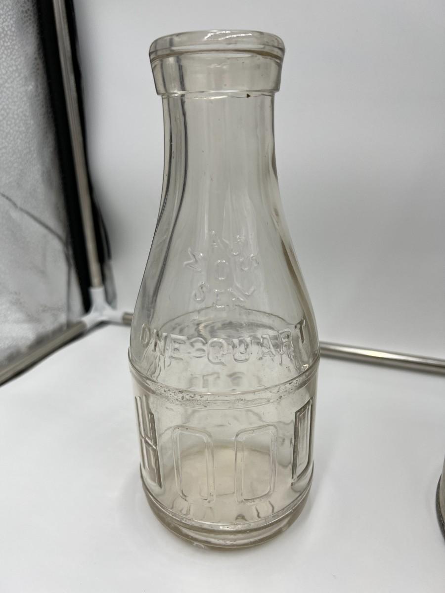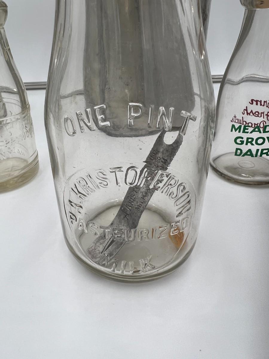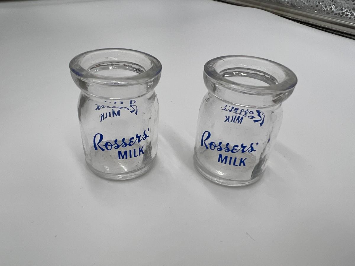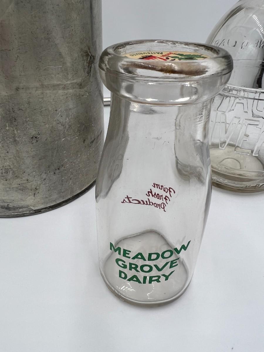 Fantastic lot of rare dairy collectibles and ephemera. Lot includes; antique Hollywood Western Dairy Products Half Pint bottle, Supreme Dairy Tacoma WA Cream Half and Half Milk carton, Rossers Milk Bessemer Alabama Rosser Farm Creamer bottle, Kristoferson Dairy Seattle WA embossed milk bottle with cap and bottle opener, Riverview Dairy Bubble Top 1 Quart Milk Bottle, Pike Dairy Bubble Top 1 Quart glass milk bottle, rare vintage Chase's Ice Cream paper box container from Provo Utah One Half Pint, Antique cream top spoons, Darigold Sweet Cream Butter Tin Can 1 Pound, 1950s Blue Bonnet Margarine Box, Bossie's Best Butter Box, and a Tin and Cast Iron butter churn with hand crank.
