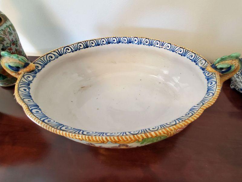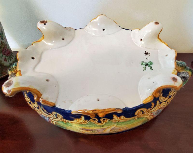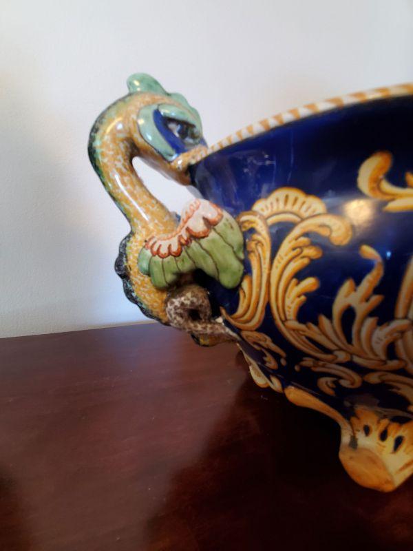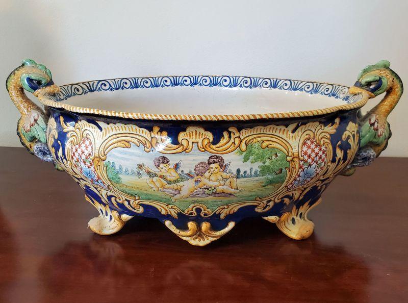 This antique jardiniere is in excellent condition, with no flaws that I can find. The Montagnon factory began producing earthenware faience pieces in Nevers, France in 1648 and continued production until the factory closed in 2015.. This piece probably dates from 1880. It is large, 20" side to side, 11 1/4" front to back and 6 1/2" deep.