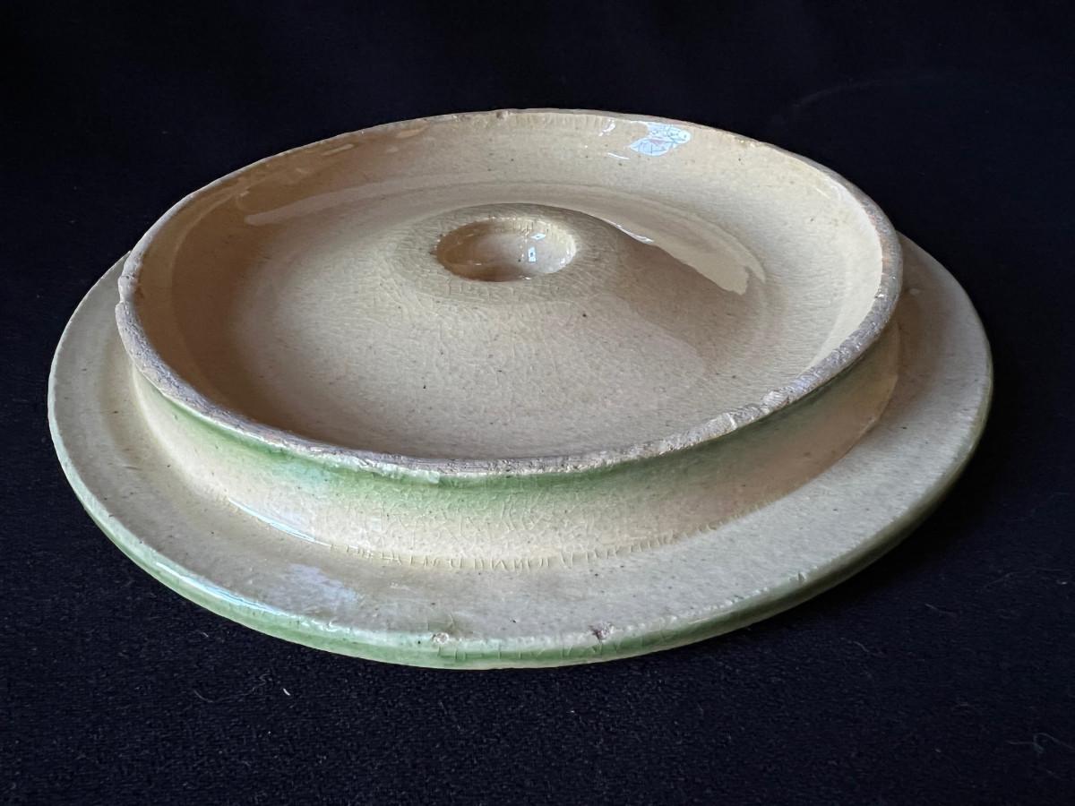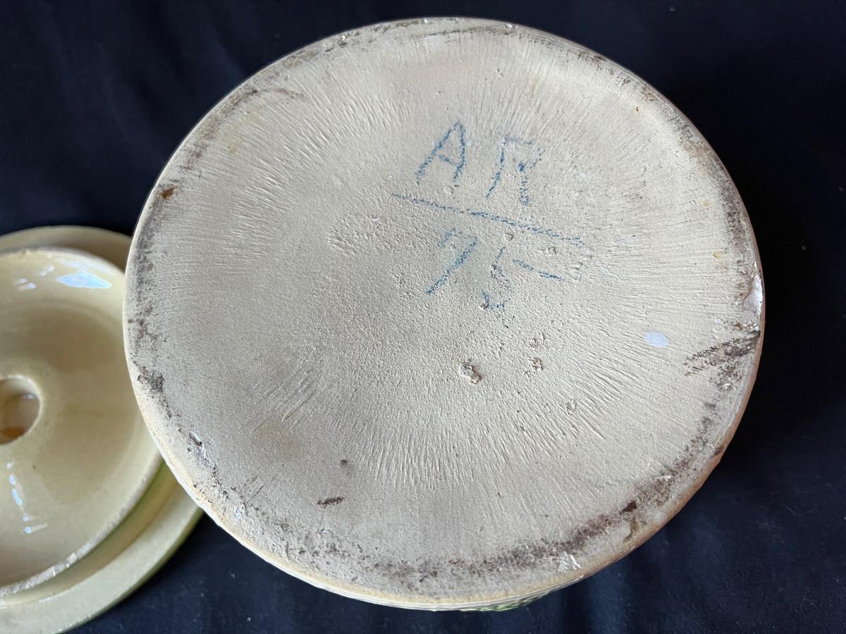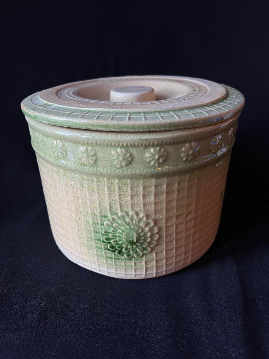 Antique Large Pottery Crock w lid in great condition. 8 1/2" diamter and 6" high. Lovely pattern and detailing. Only a couple of small chips to the inside of the lid - not visible with lid on.