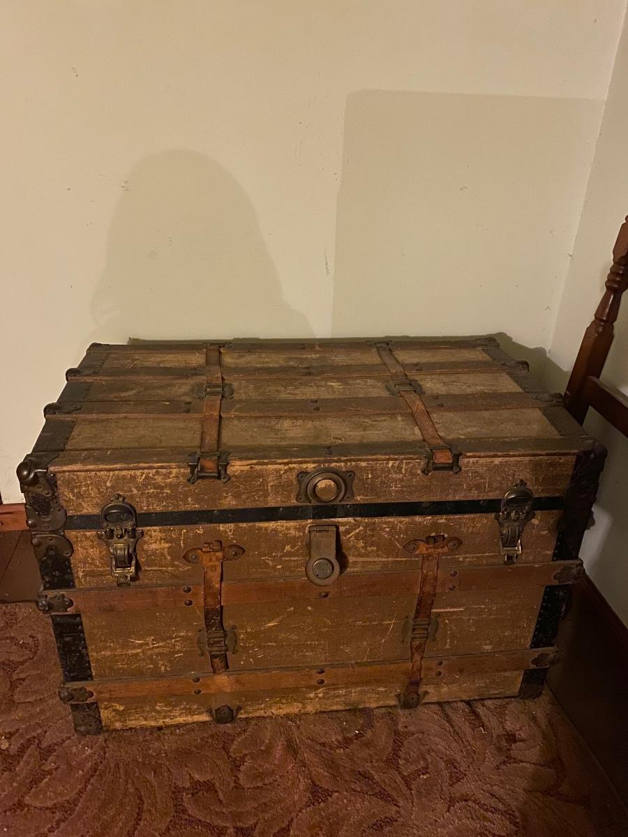 Large antique trunk - B. Approx 36-3/4w x 21d x 23-3/4h. We have another trunk a separate listing. In good antique condition