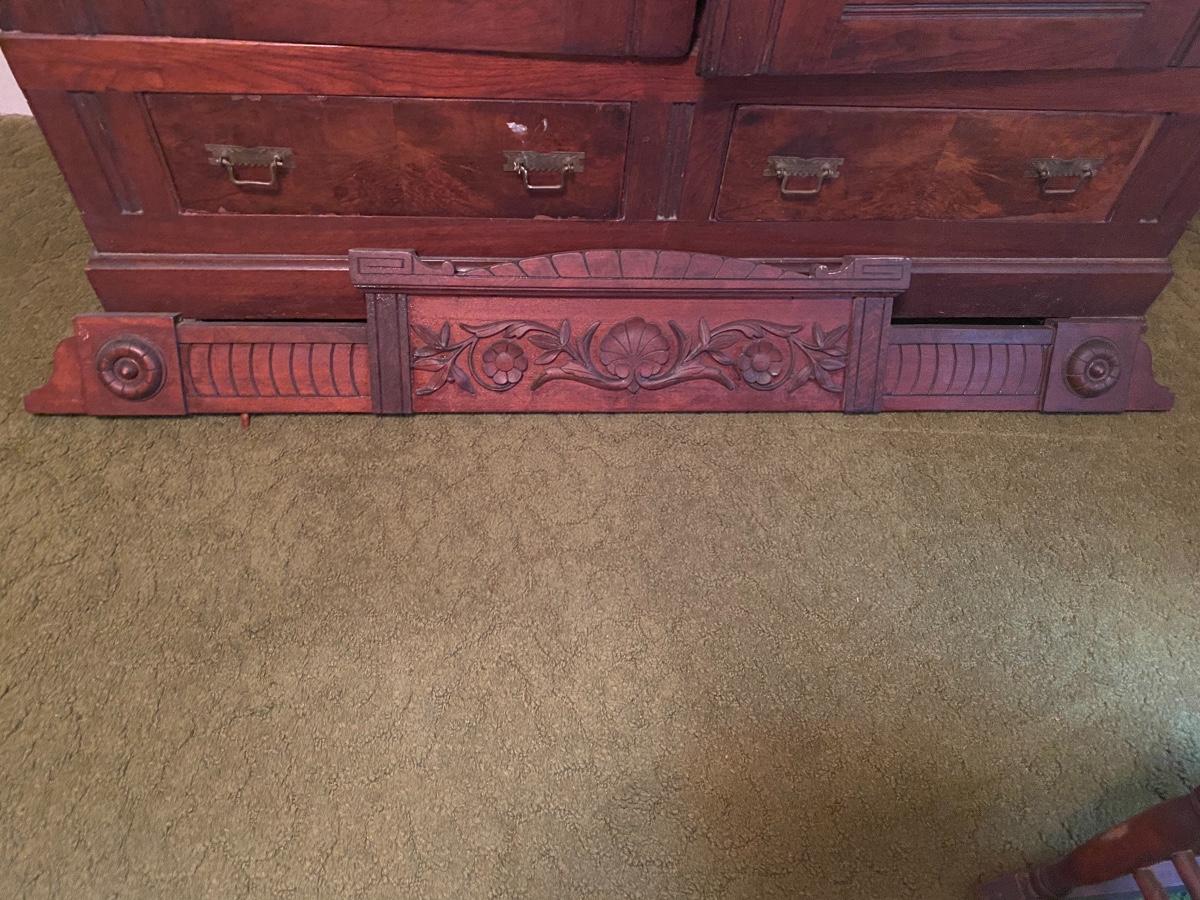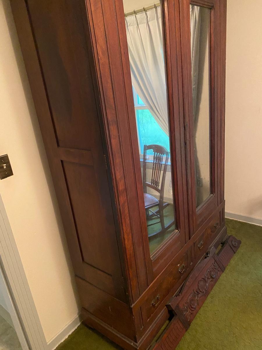 Gorgeous antique large walnut wardrobe/armoire with beveled mirror doors. Has a beautiful ornate header (it’s on the floor). Inside are two drawers, hanger rod and shelves. It has no screws or nails, and comes apart - sides, top & bottom). 101H x 55W x 19D. Very good used condition. This 1800s beauty is from the client's grandmother's home on Magazine St. in New Orleans. YOU MUST BRING A DOLLY, BLANKETS, AND HELP TO MOVE THIS.