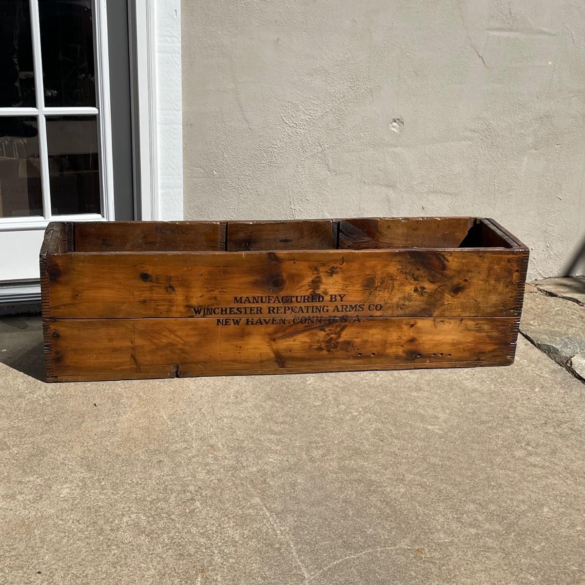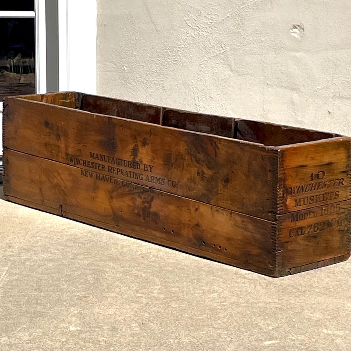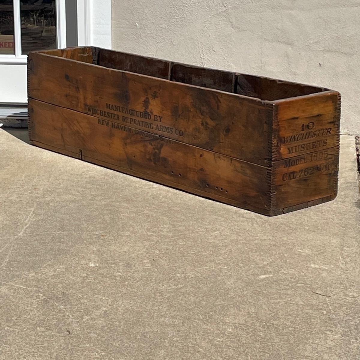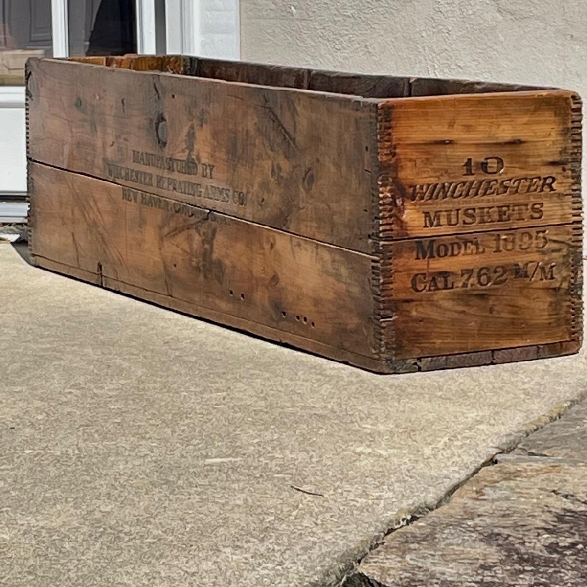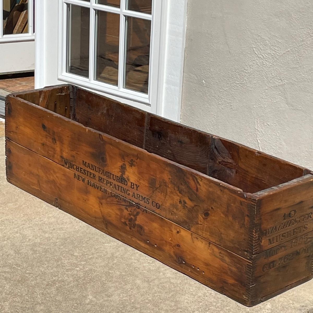 This old Winchester wooden musket crate is in excellent condition and a very rare antique find! This solid wood crate with dovetail features has a minor blemish that is a minor split in the wood on the base of the crate, see images. It measures 50” wide x 12” deep x 13.5” tall. Shipping available.