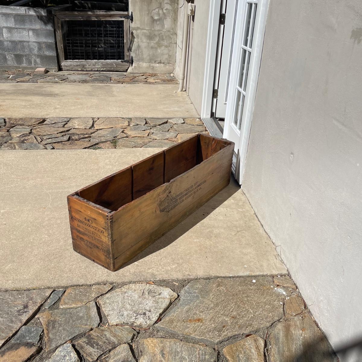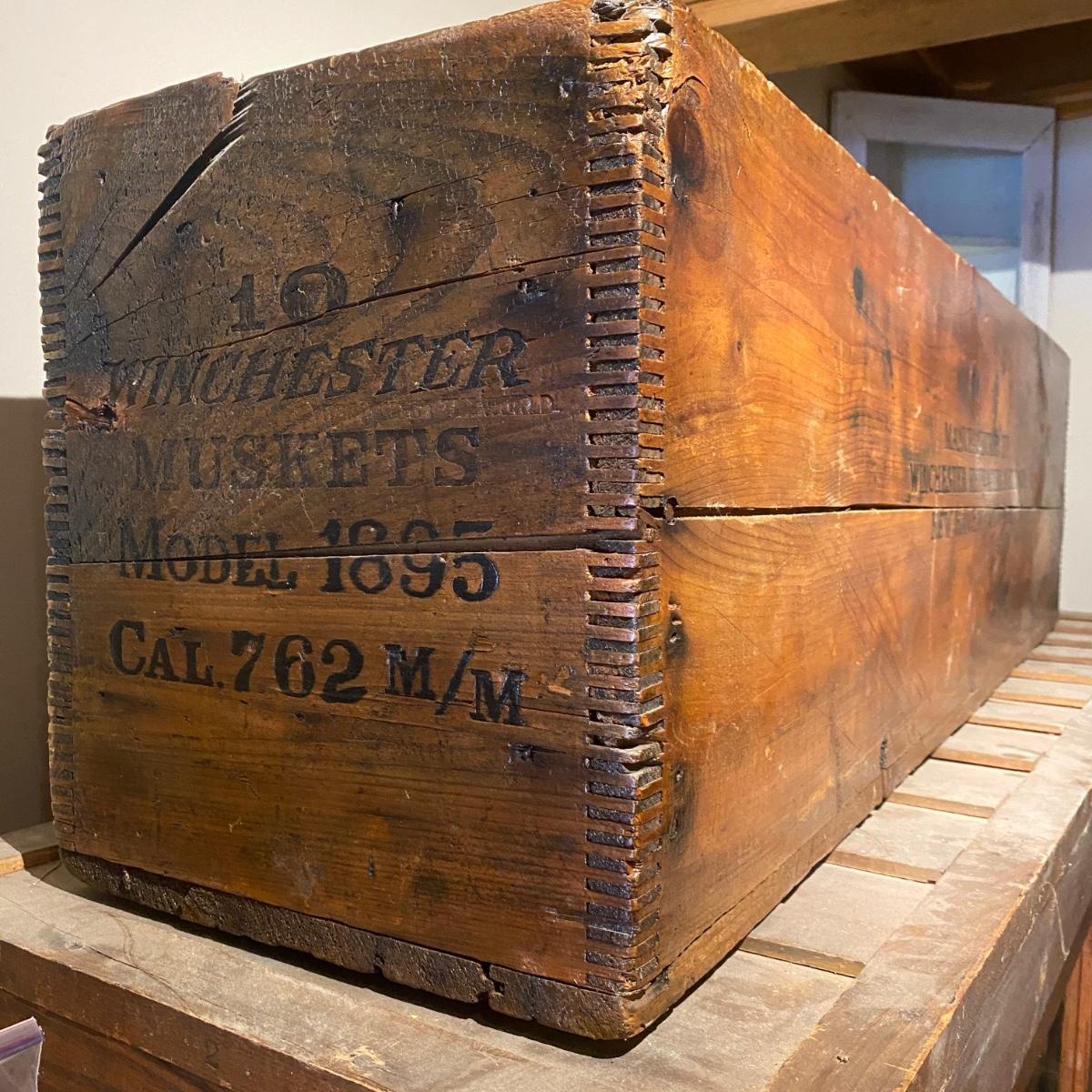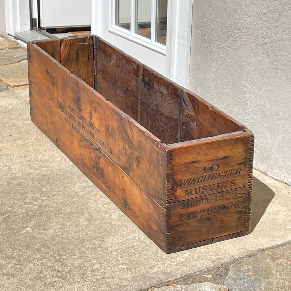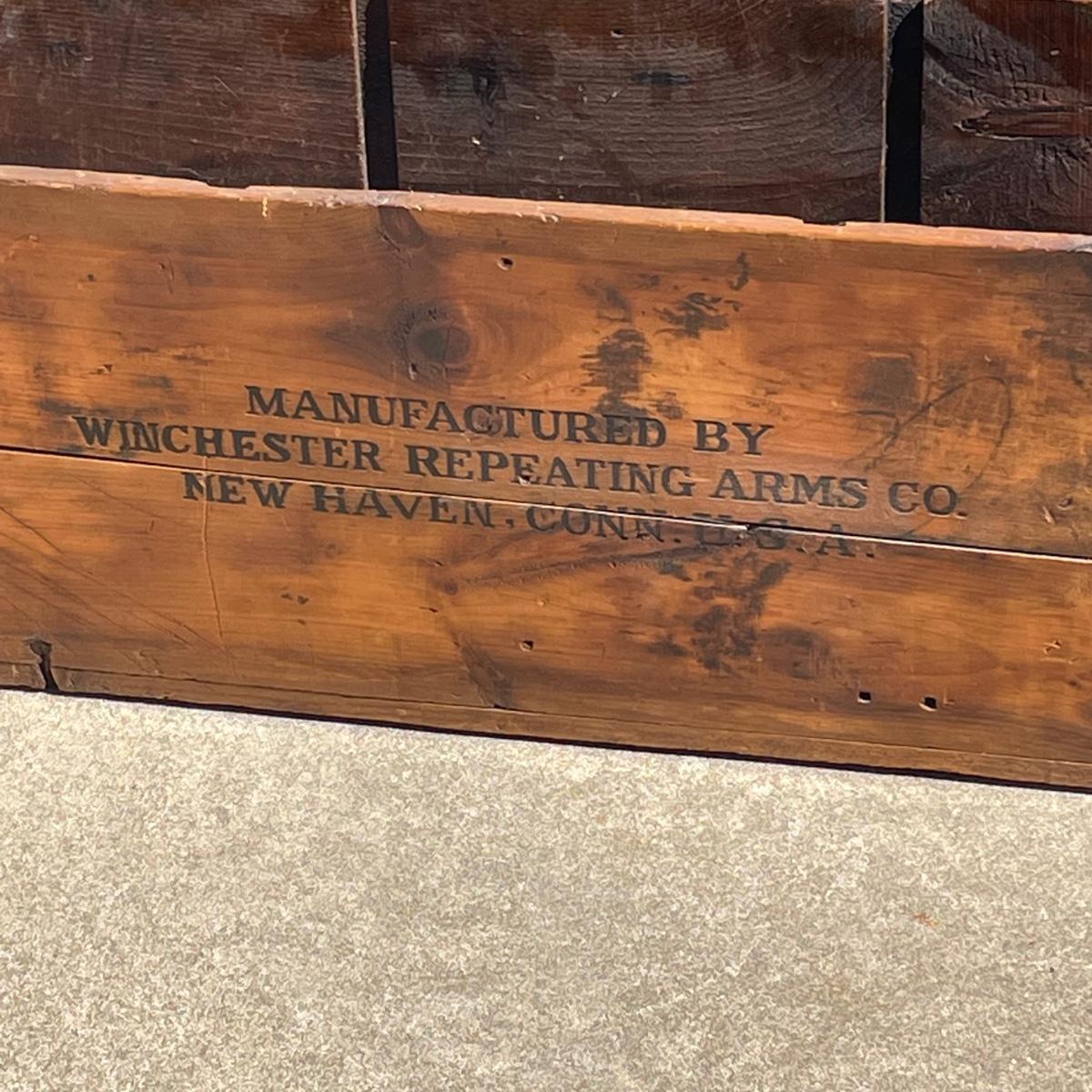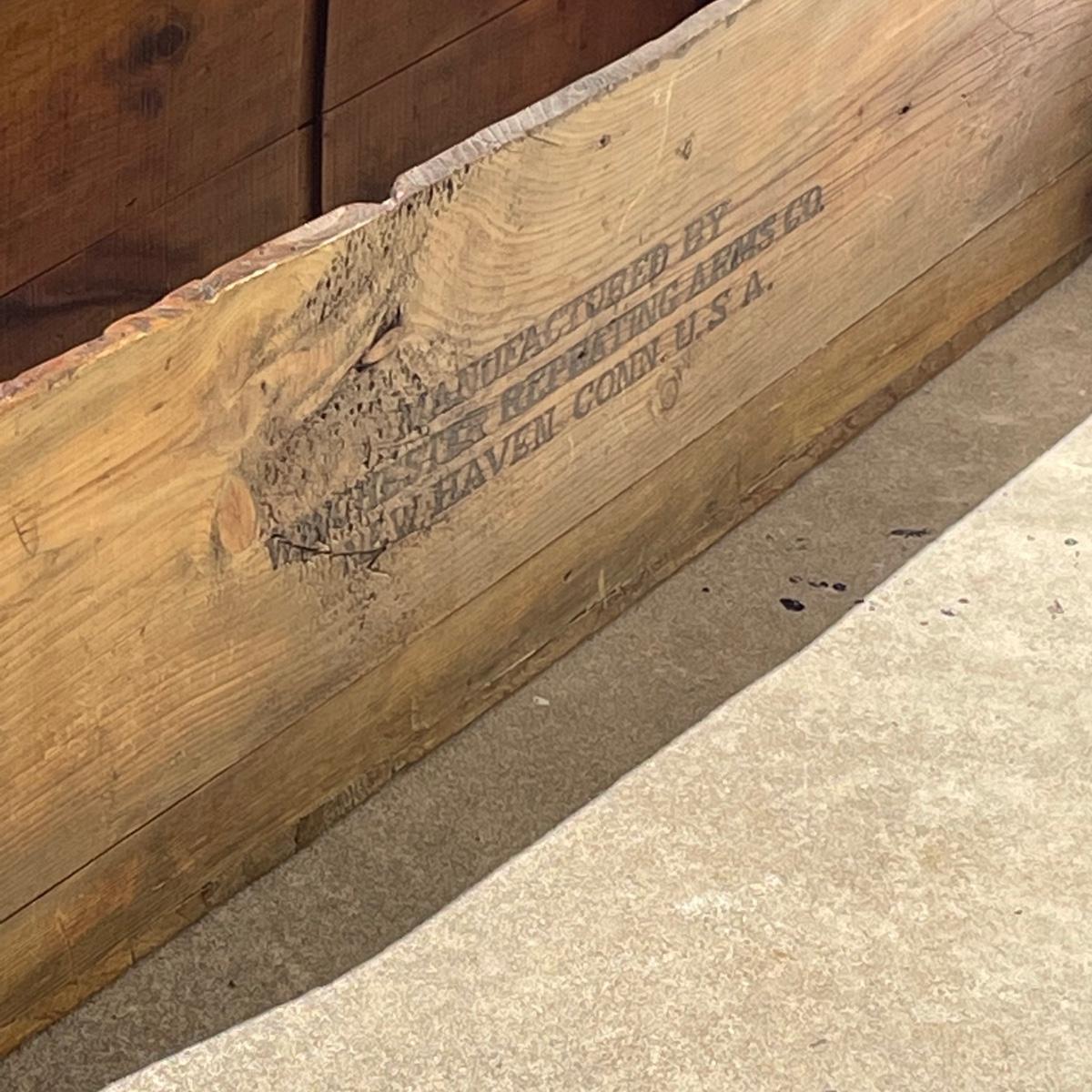 This old Winchester wooden musket crate is in excellent condition and a very rare antique find! This solid wood crate with dovetail features has a minor blemish that is a minor split in the wood on the base of the crate, see images. It measures 50” wide x 12” deep x 13.5” tall. Shipping available.
