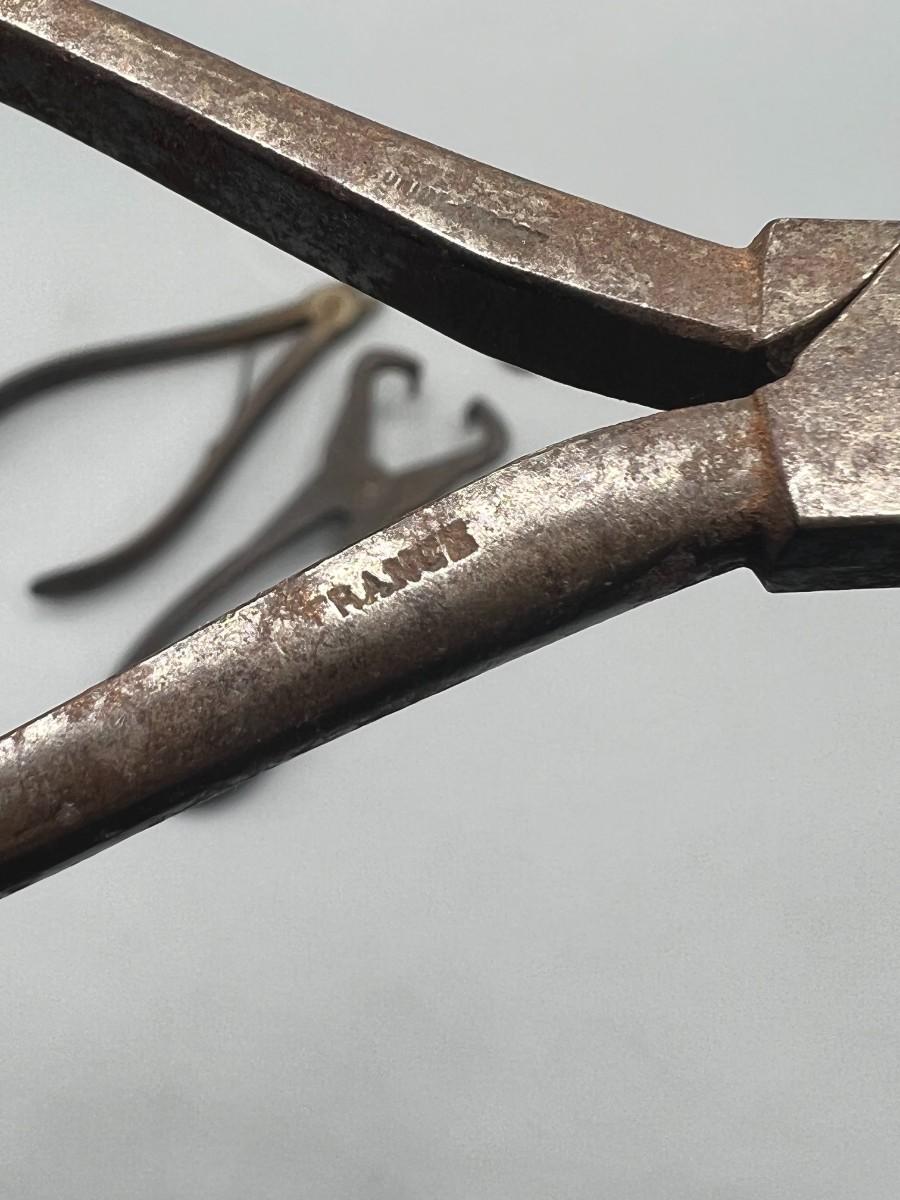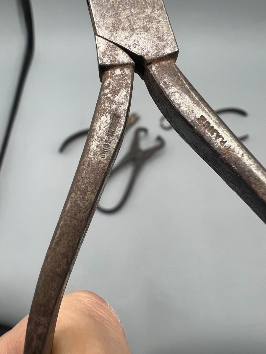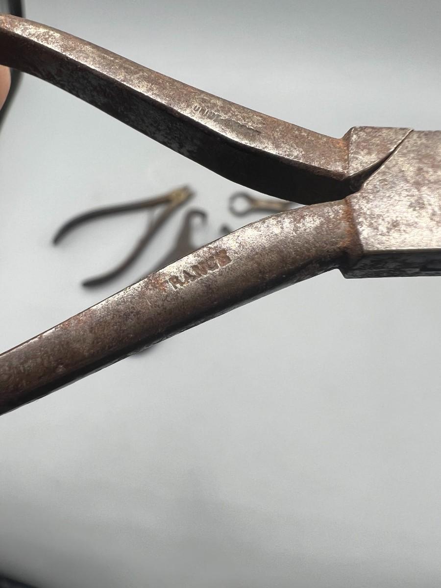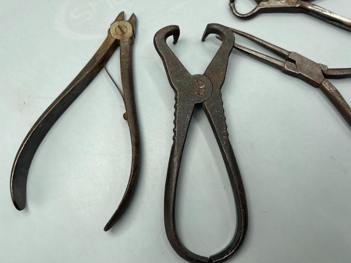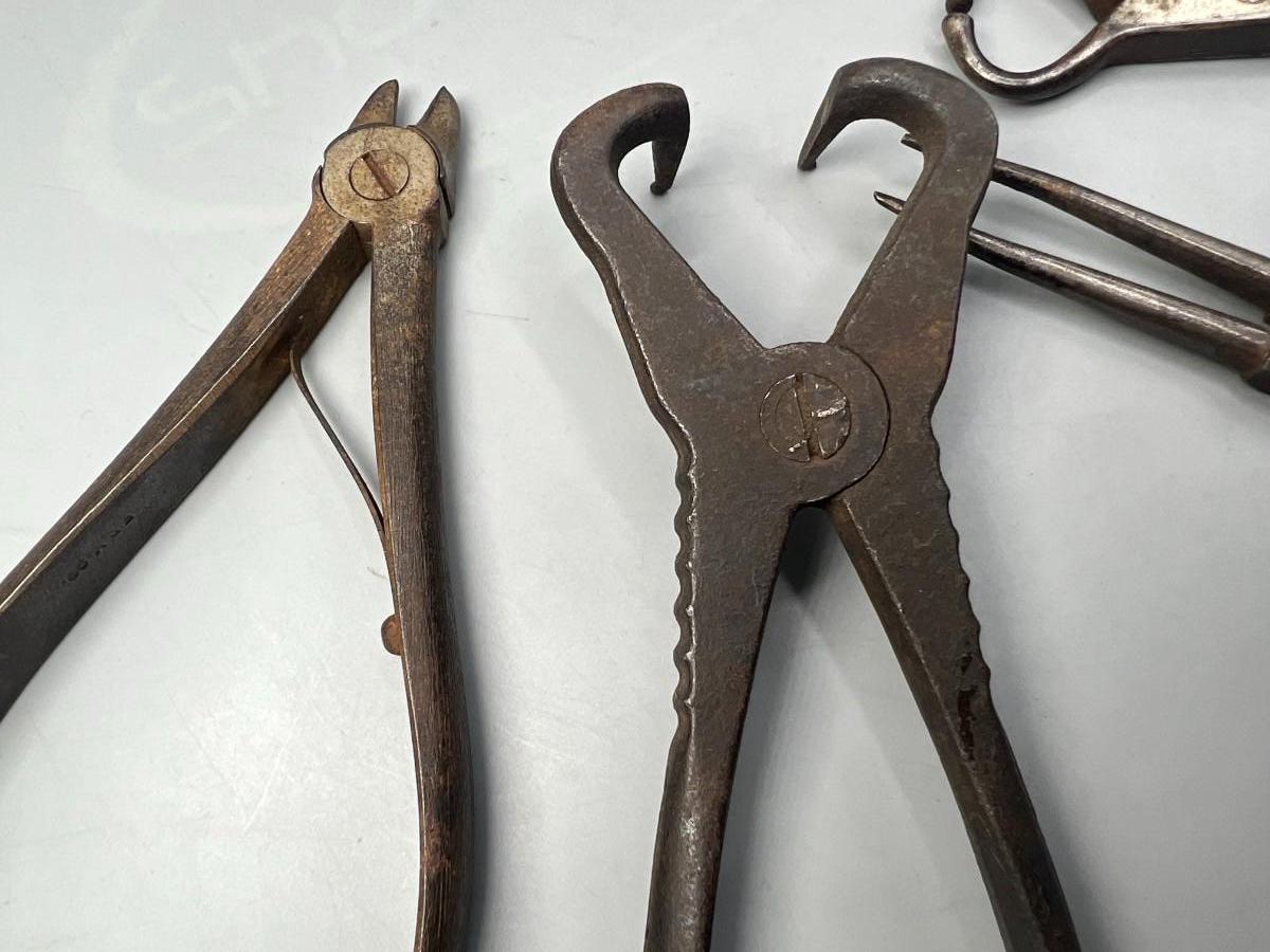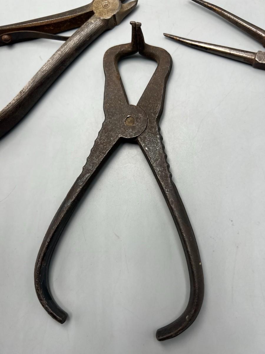 There is antique wear to the pliers, but there is no significant damage and is in overall good collectible condition. These tools come from a museum collection. Check pictures for more details and for sizing.