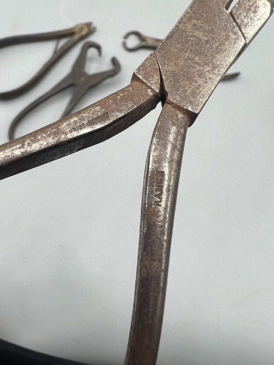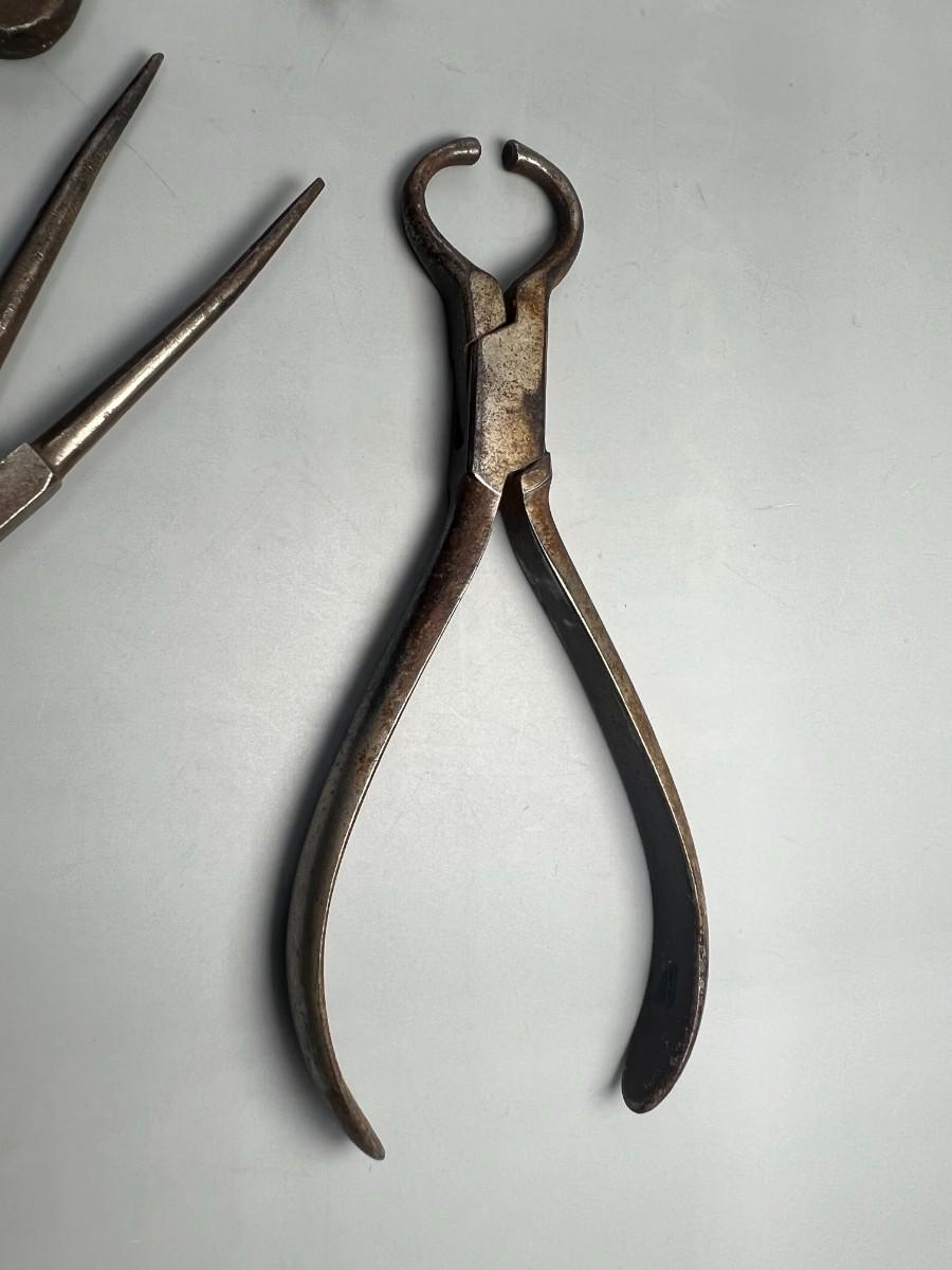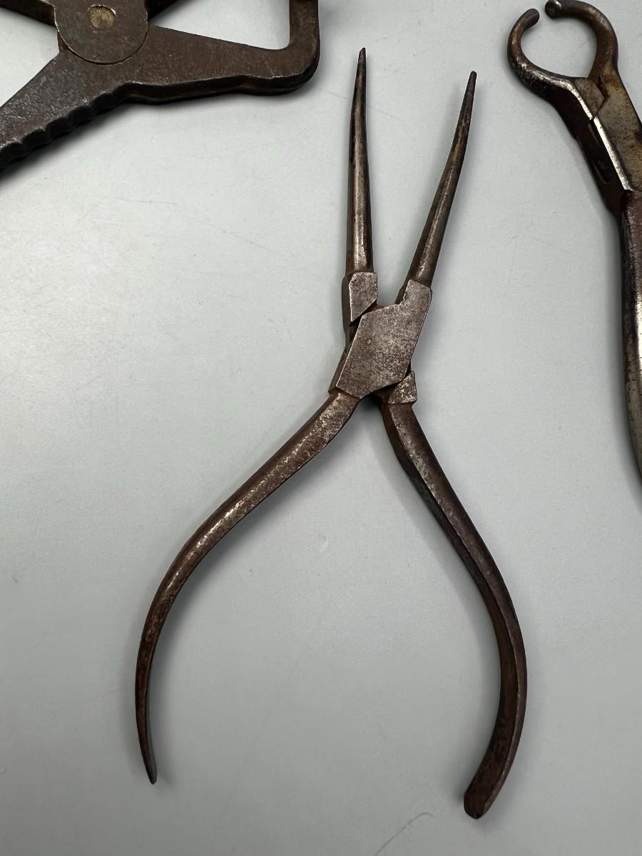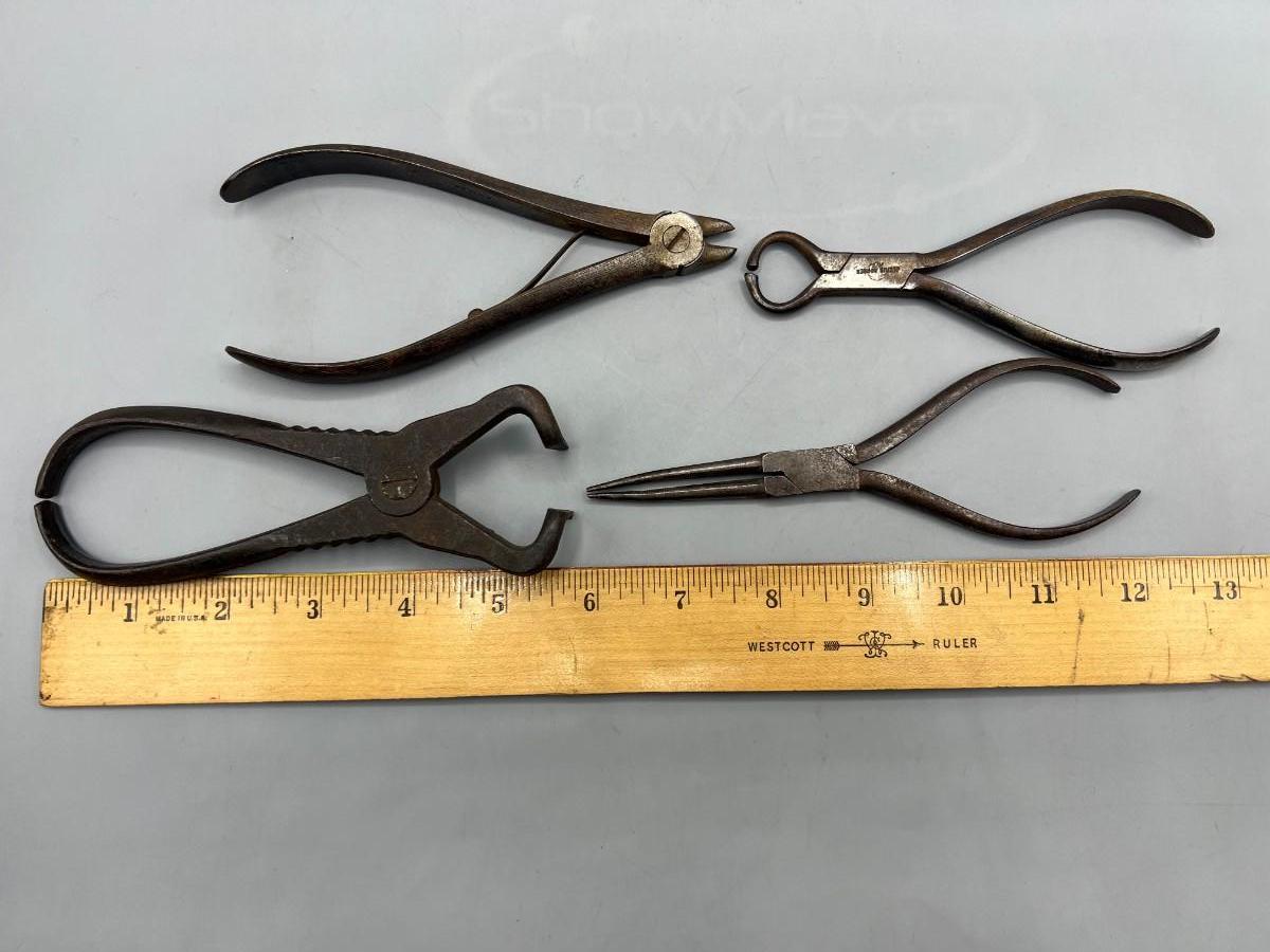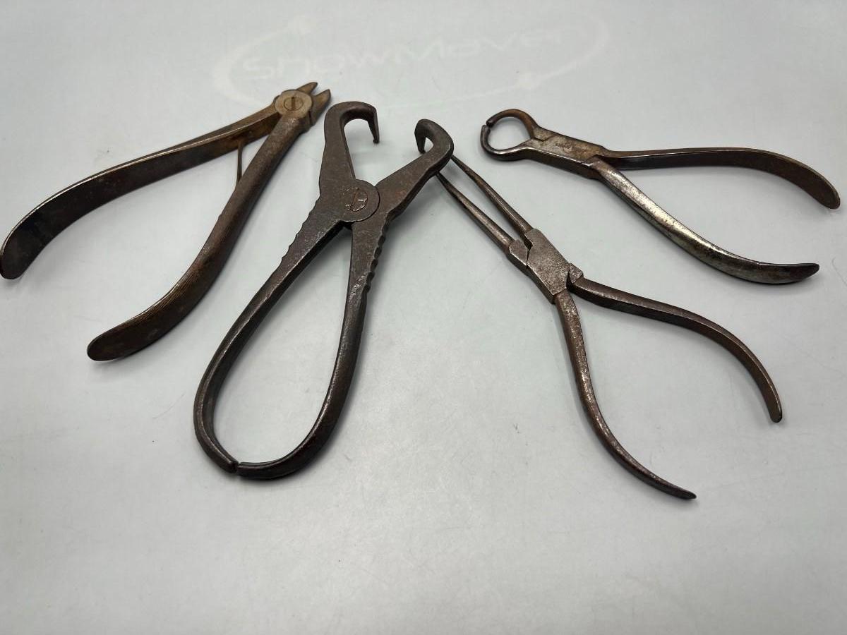 There is antique wear to the pliers, but there is no significant damage and is in overall good collectible condition. These tools come from a museum collection. Check pictures for more details and for sizing.