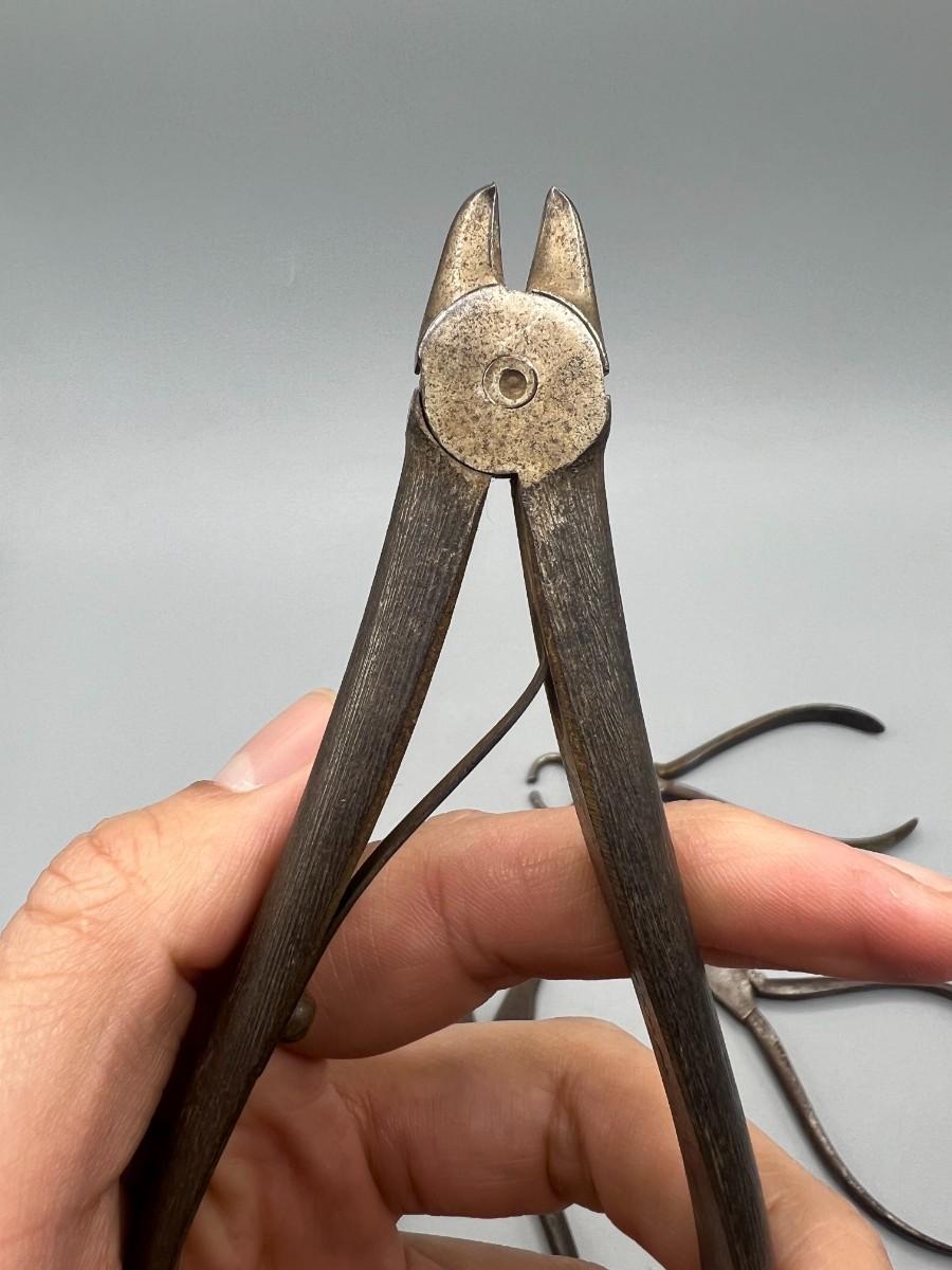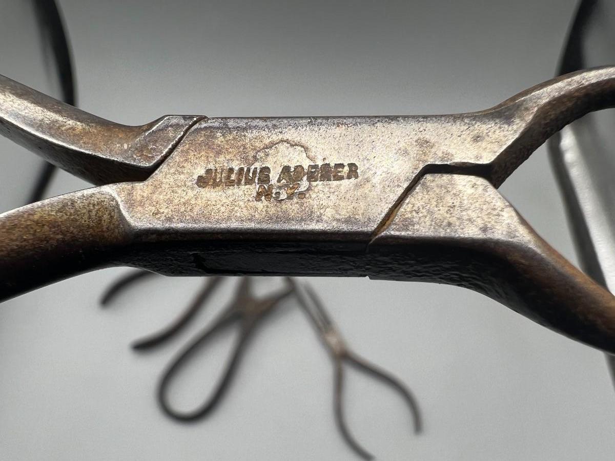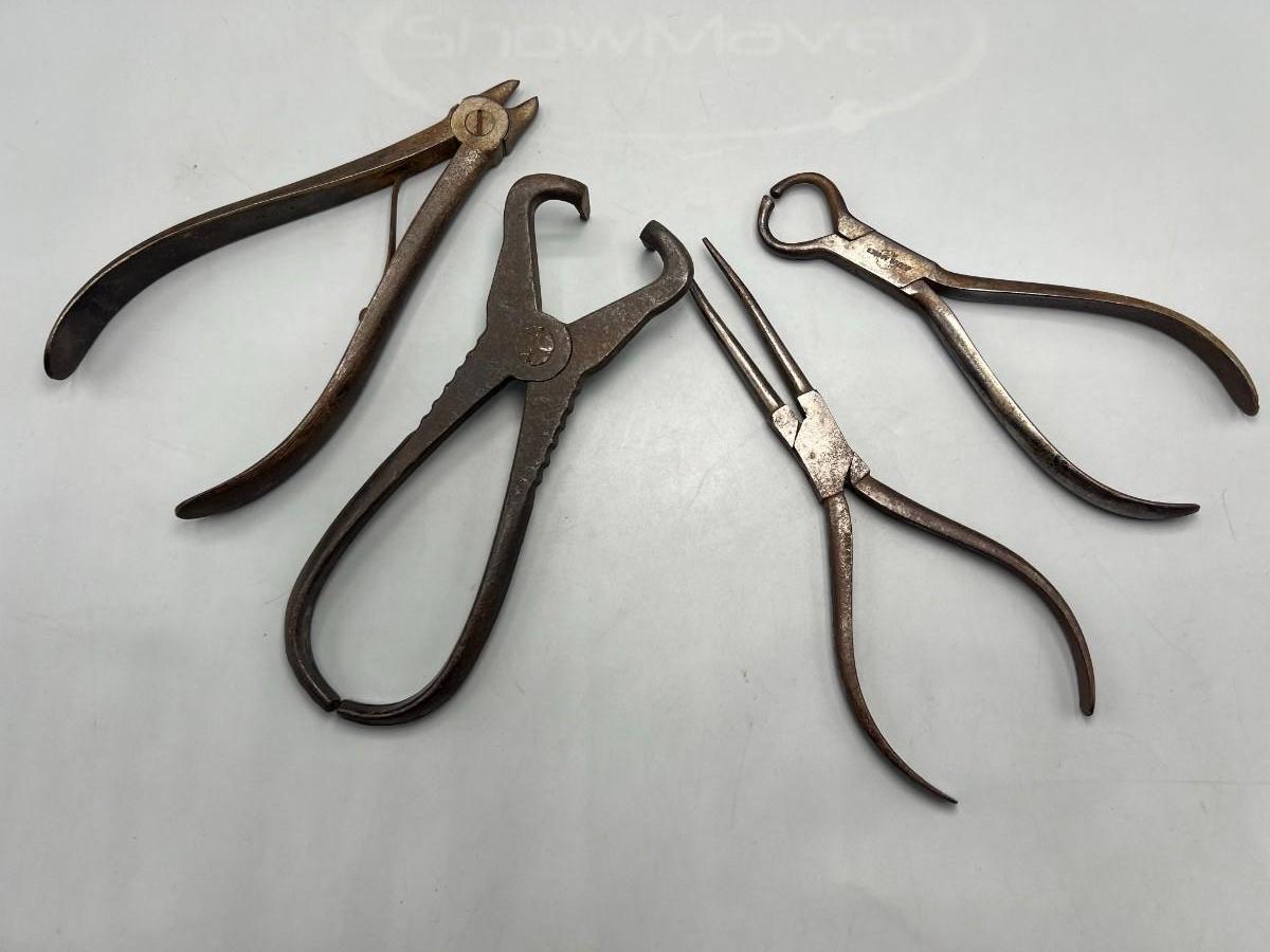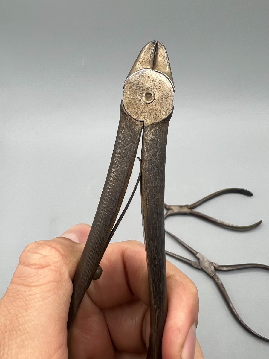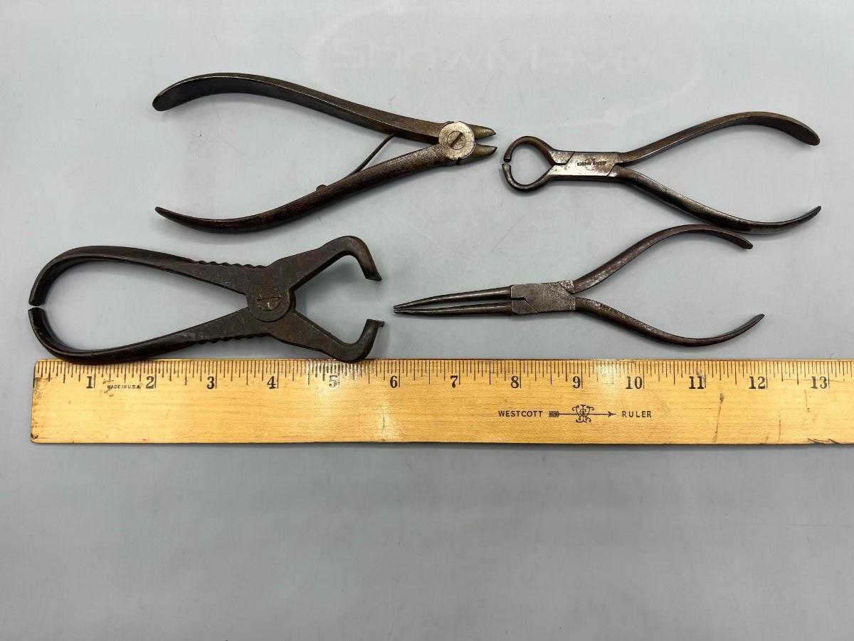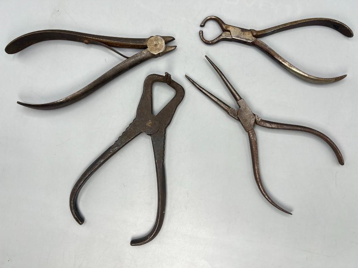 There is antique wear to the pliers, but there is no significant damage and is in overall good collectible condition. These tools come from a museum collection. Check pictures for more details and for sizing.