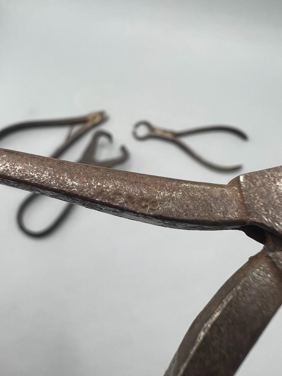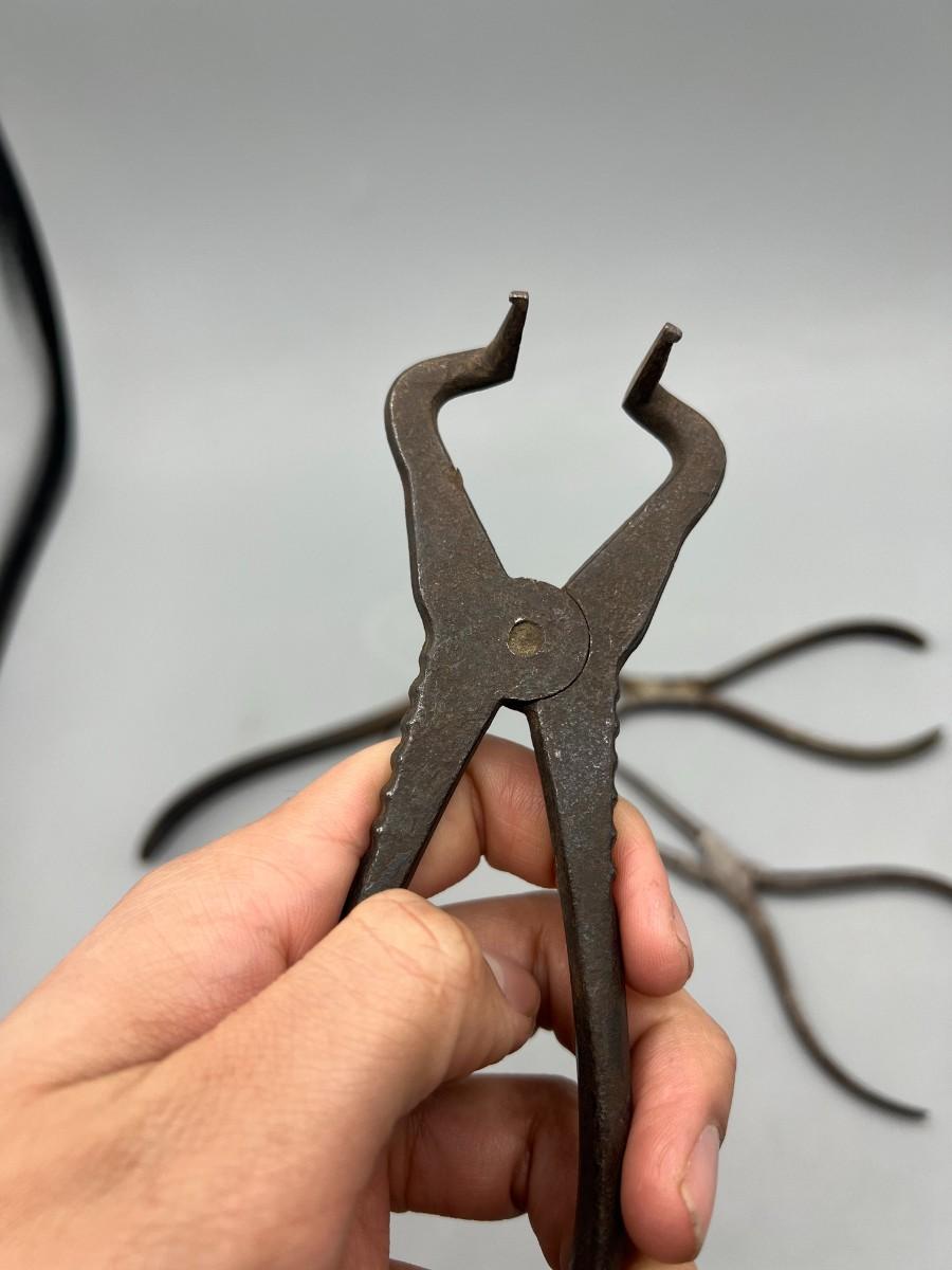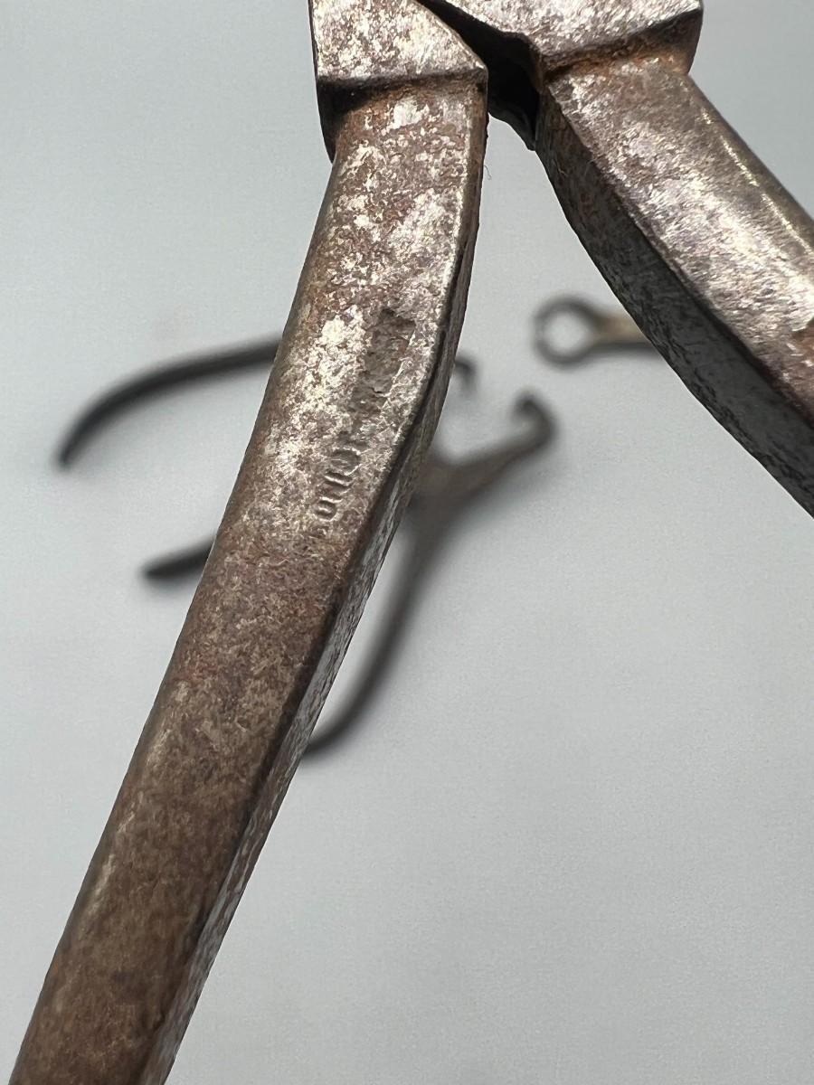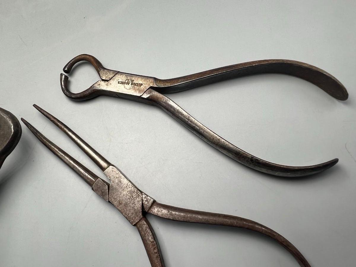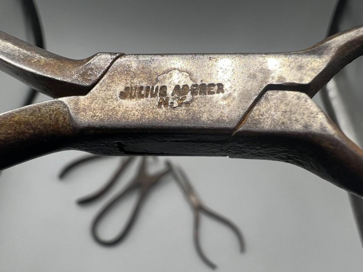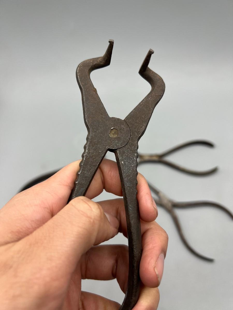 There is antique wear to the pliers, but there is no significant damage and is in overall good collectible condition. These tools come from a museum collection. Check pictures for more details and for sizing.