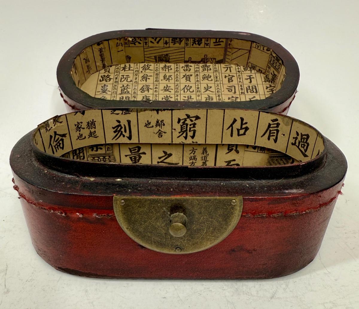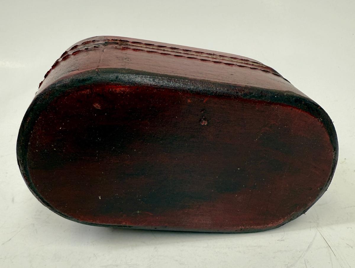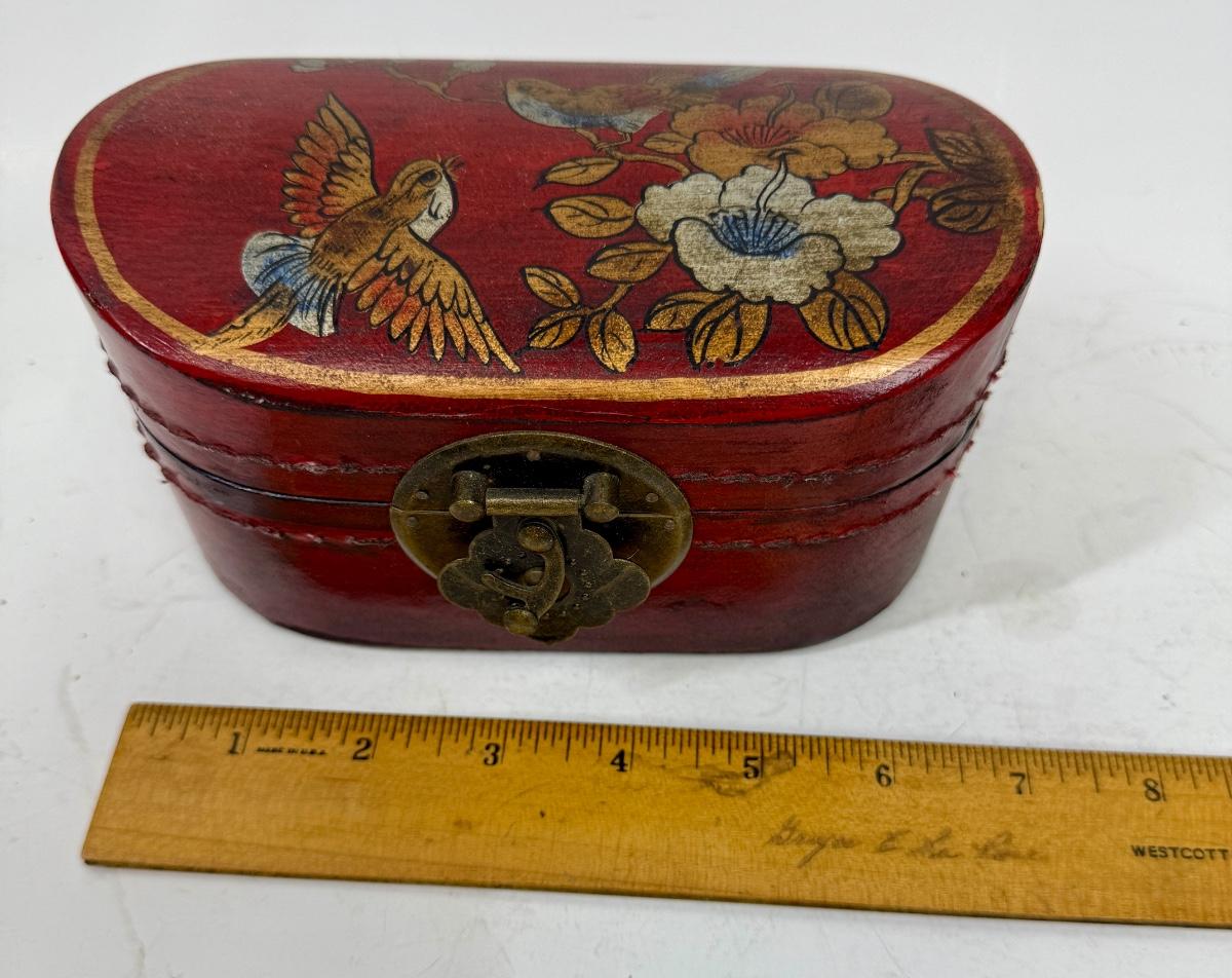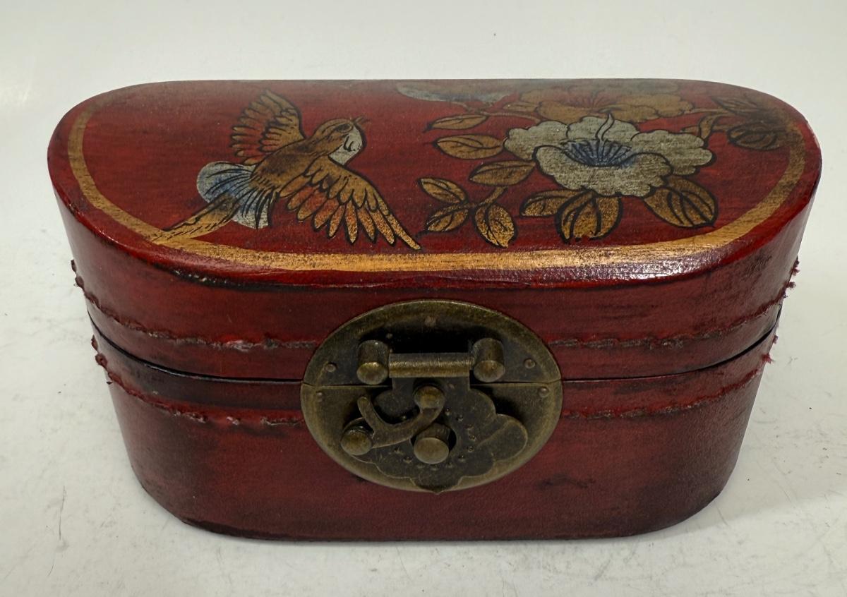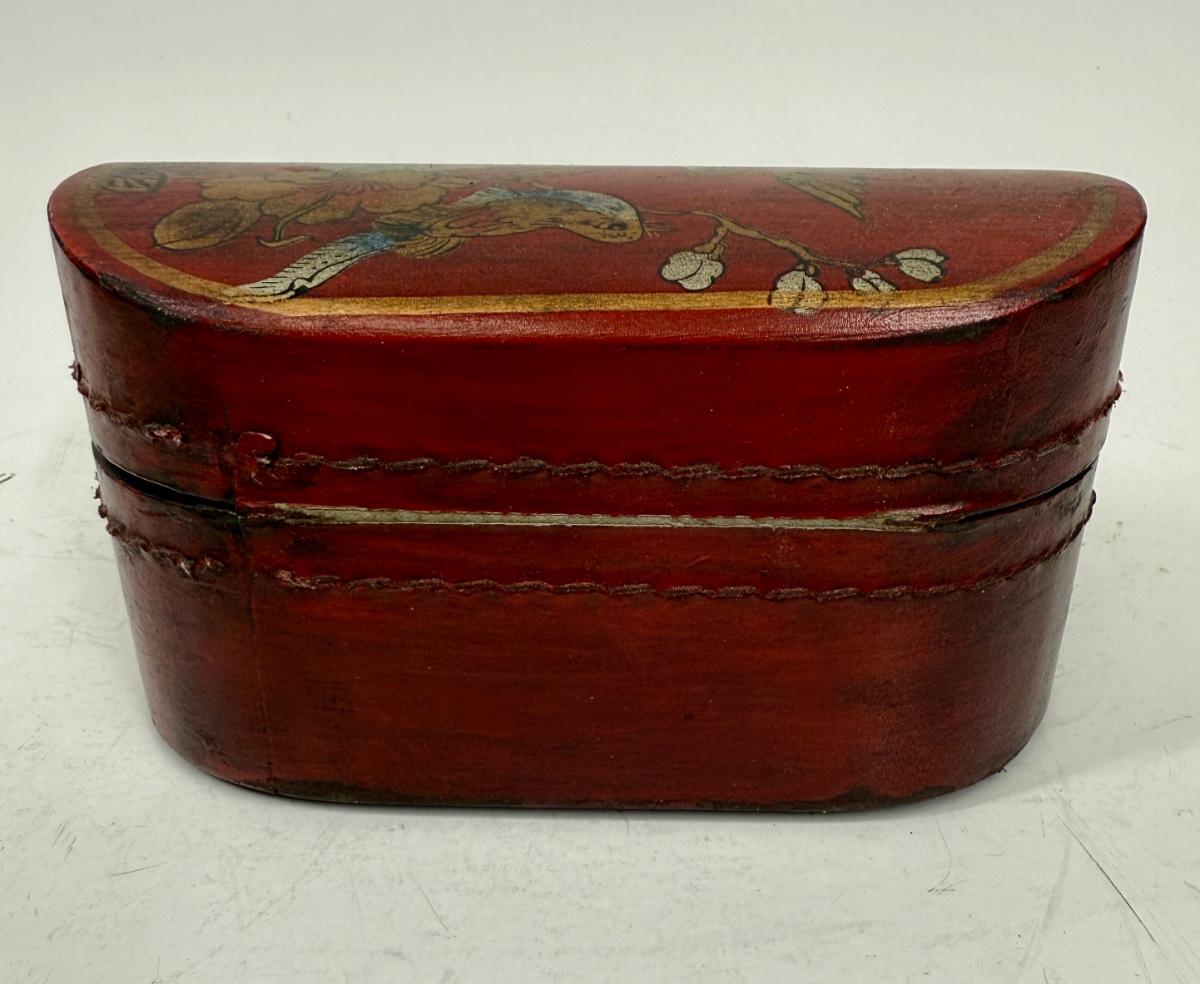 Antique Leather Bound Small Wooden Mahjong Tile Box with Bird & Flowers - no tiles