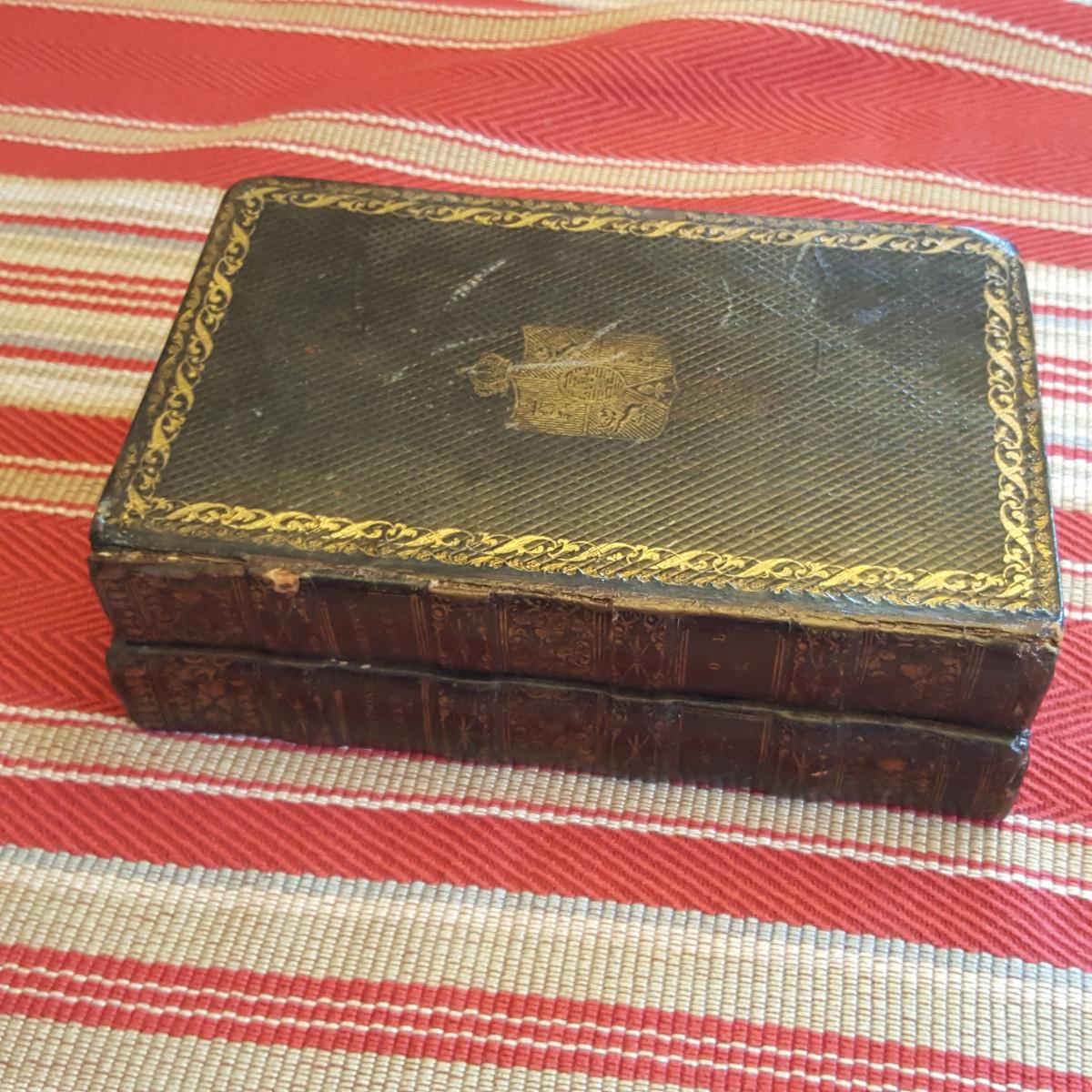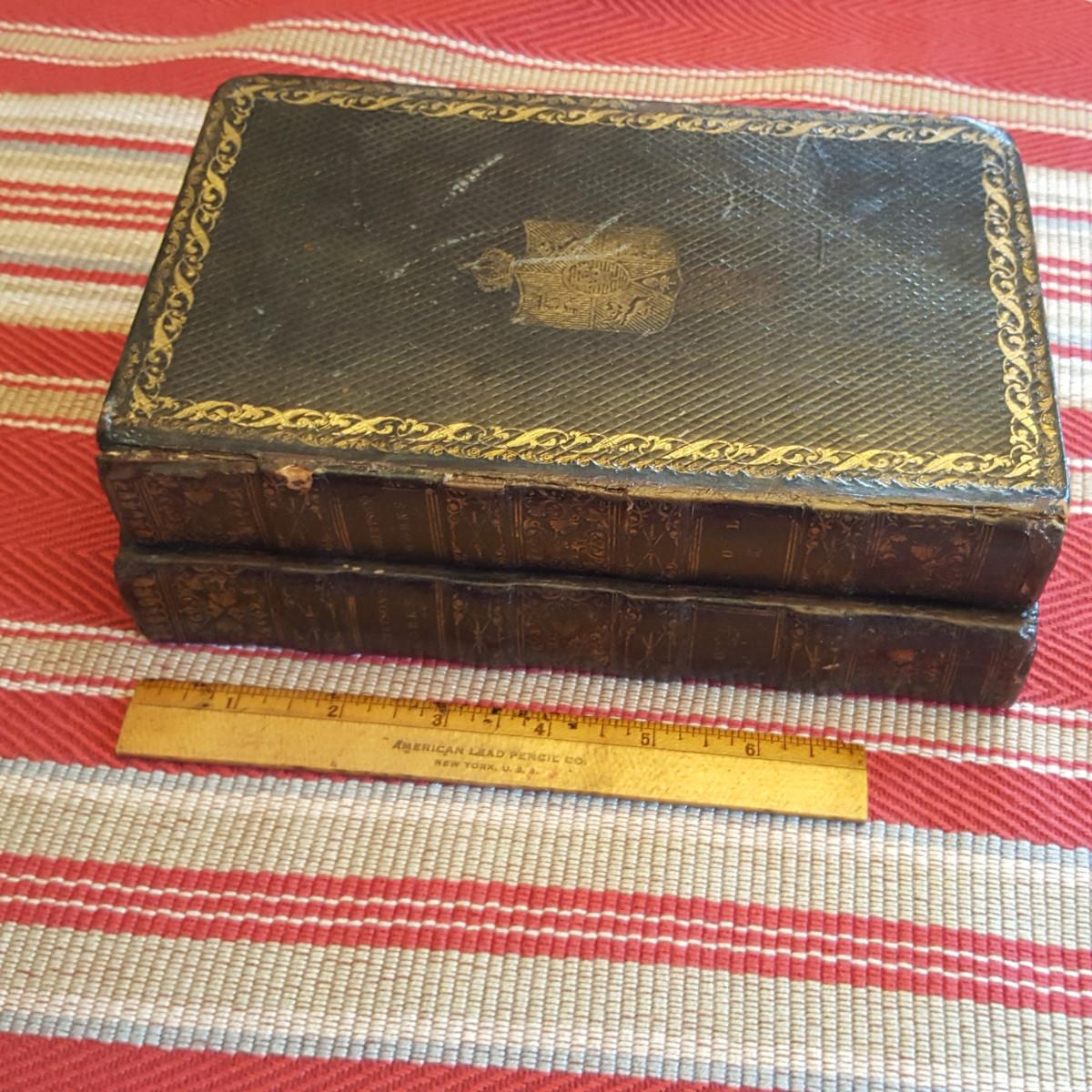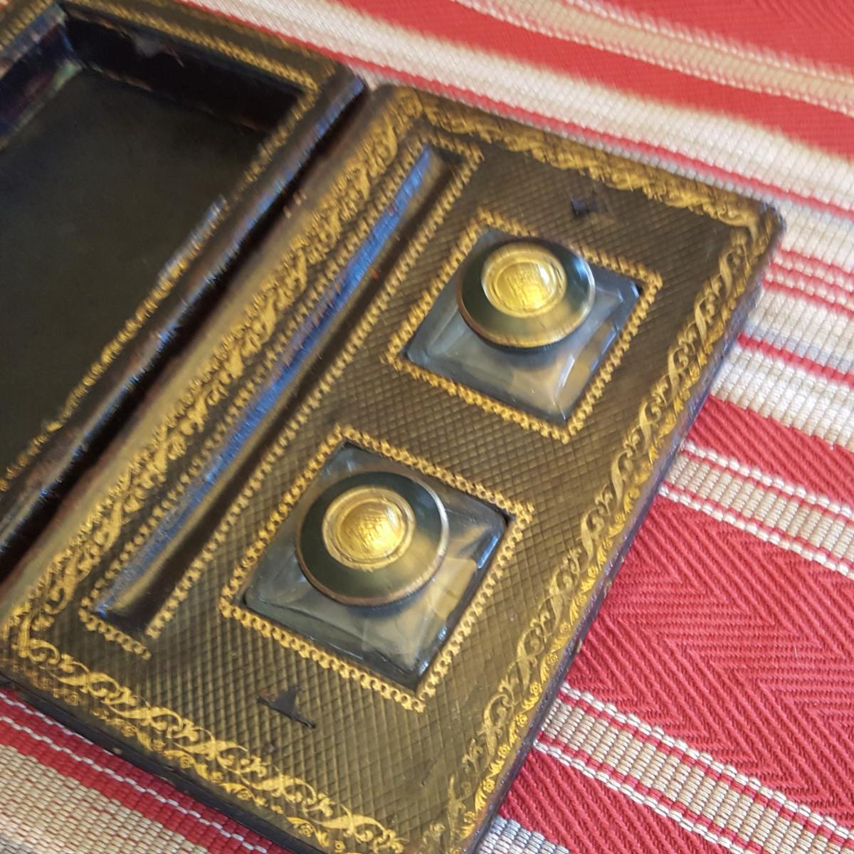 This auction lot is for a very unique Antique Leather Inkwell Set. Designed to set upon the desk and appear as a pair of stacked books. Shows as Robertson's Works, Volume 4 and 5. The inkwell measures about 8.5-inches X 5.5-inches X 2.5-inches tall. The top lifts off the bottom portion. The inkwell shows age and wear - but is a rare find. Where you gonna find another. Bid now and bid high!