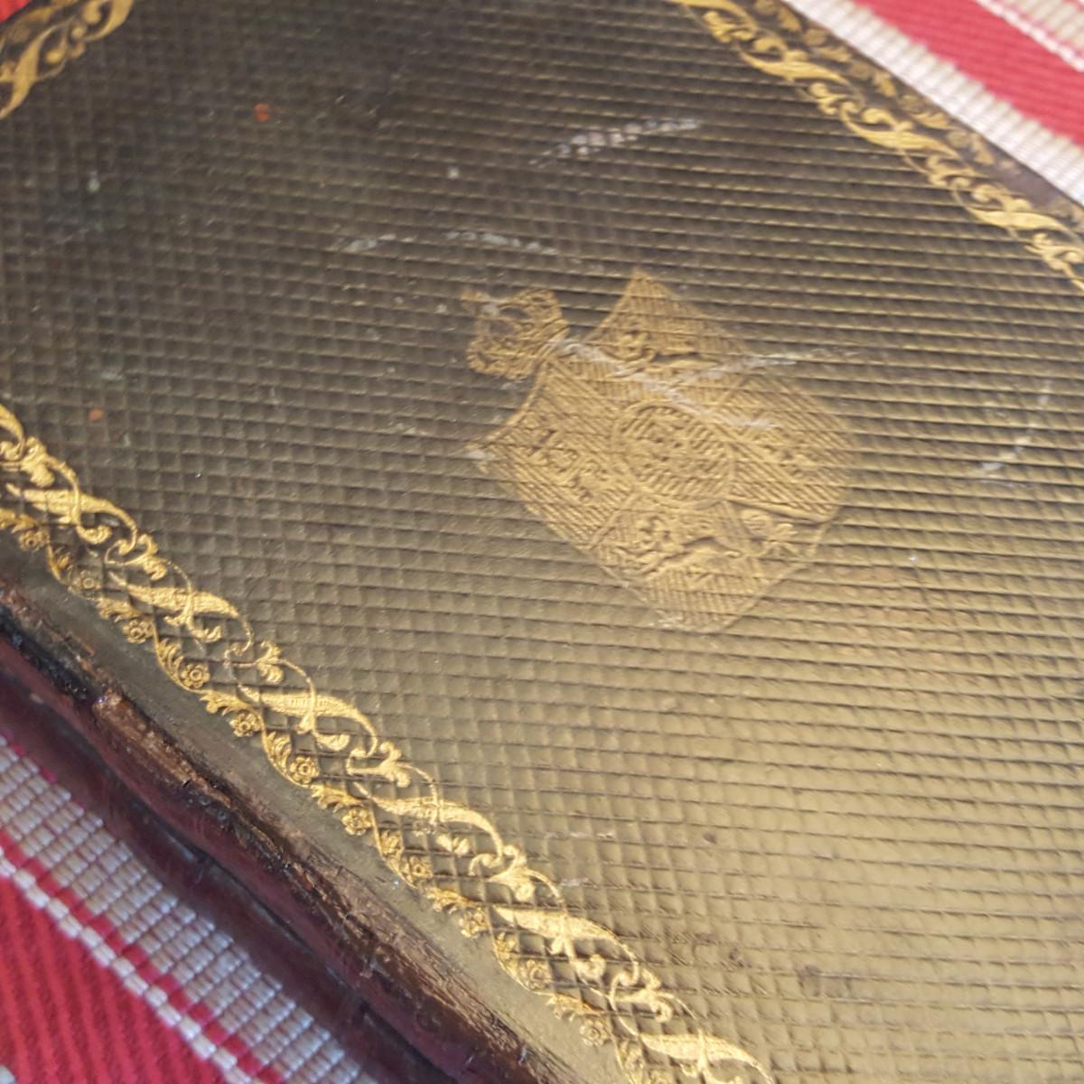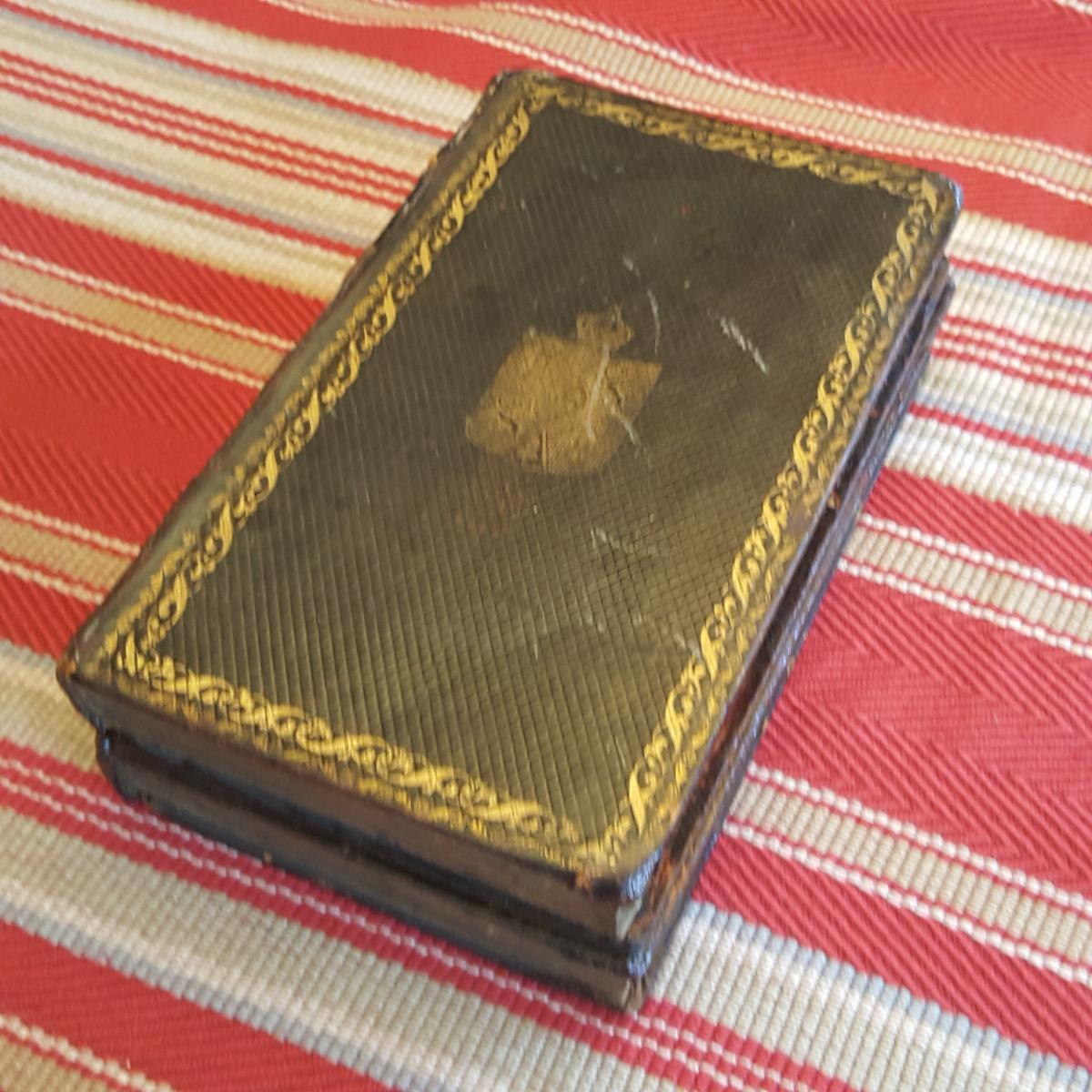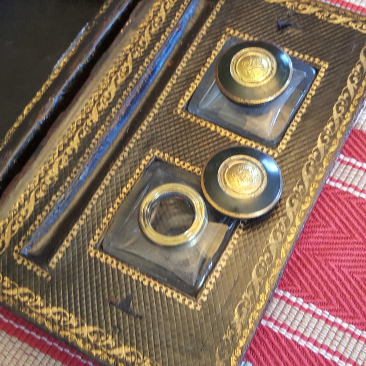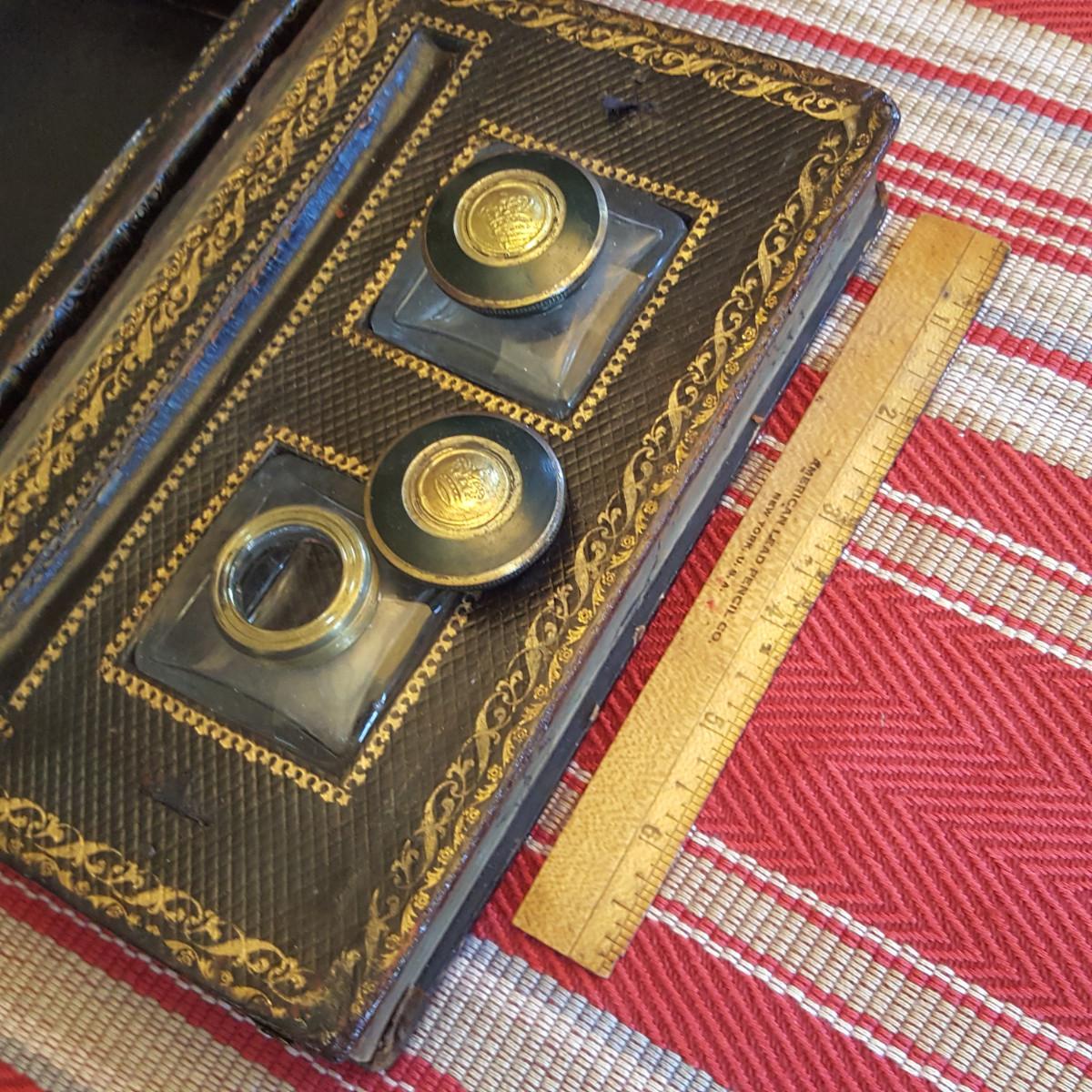 This auction lot is for a very unique Antique Leather Inkwell Set. Designed to set upon the desk and appear as a pair of stacked books. Shows as Robertson's Works, Volume 4 and 5. The inkwell measures about 8.5-inches X 5.5-inches X 2.5-inches tall. The top lifts off the bottom portion. The inkwell shows age and wear - but is a rare find. Where you gonna find another. Bid now and bid high!