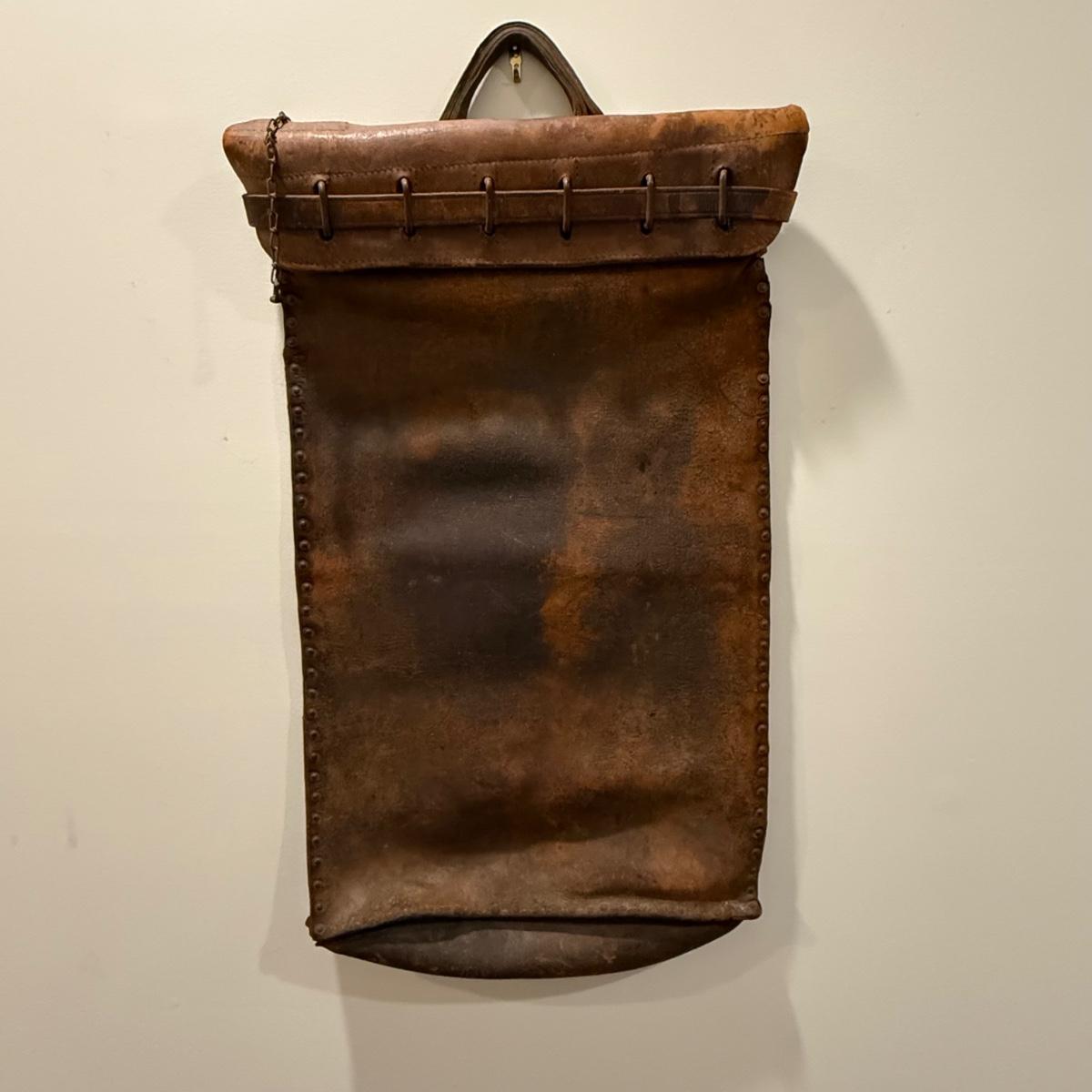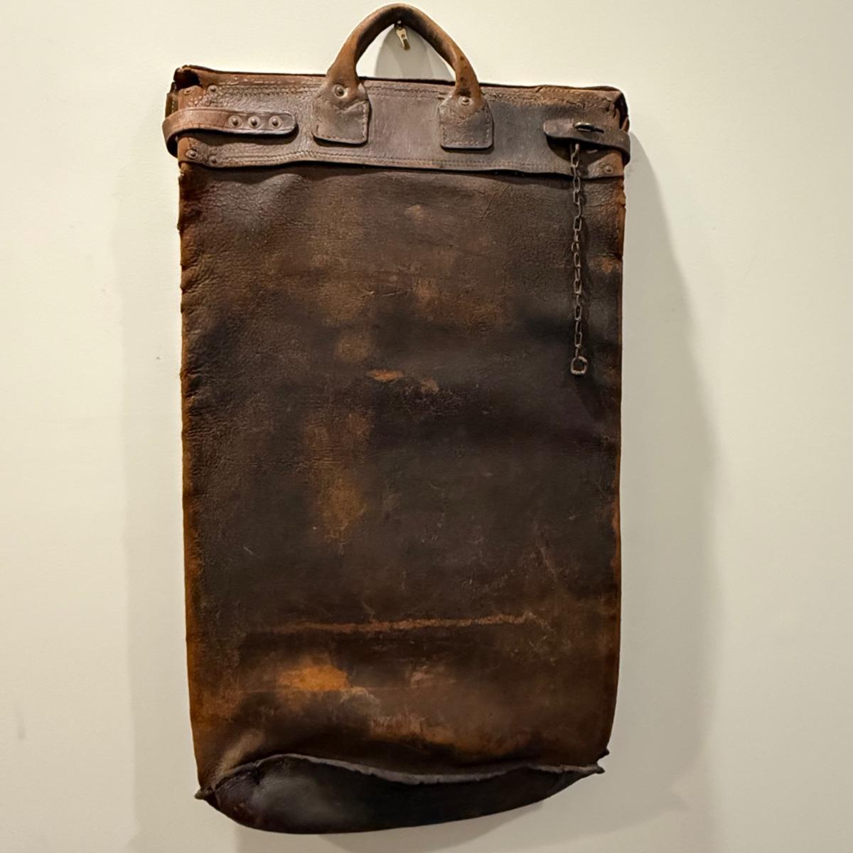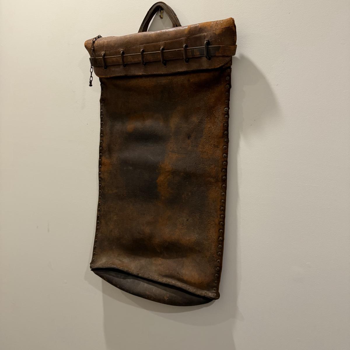 In this lot we have an antique leather mailbag. This piece of history is super neat, made out of thick leather and is clasped close with metal bars and long strap of leather that weaves through them. There is a handle at the top to carry or for an easy way to display it. This item measures 17.75” x 30”. This thing is old, worn, dusty and super cool. Shipping available.