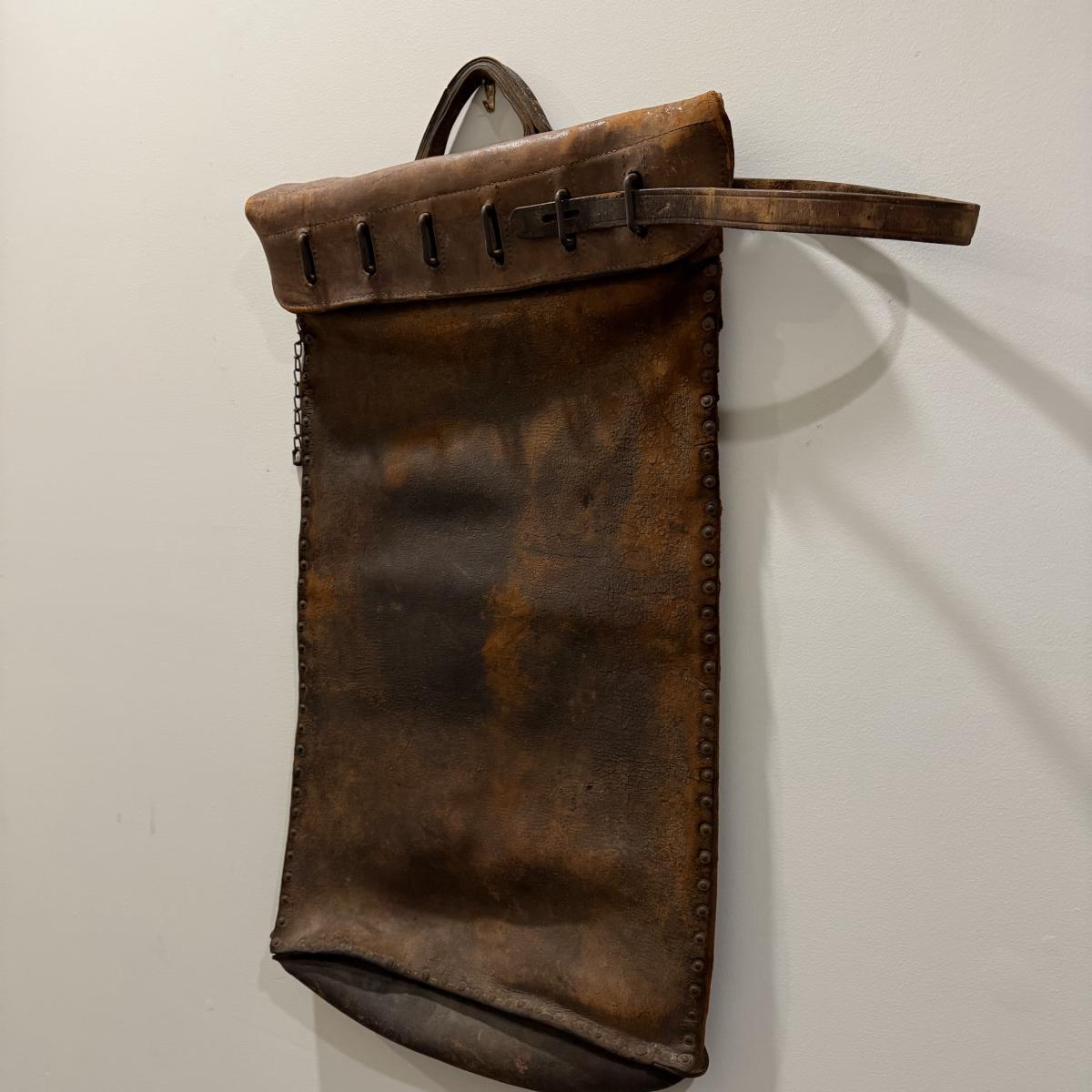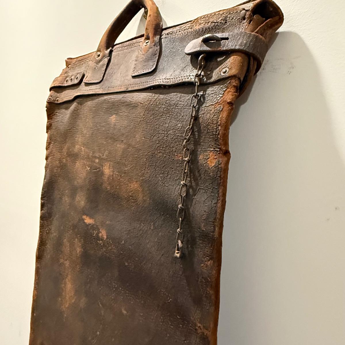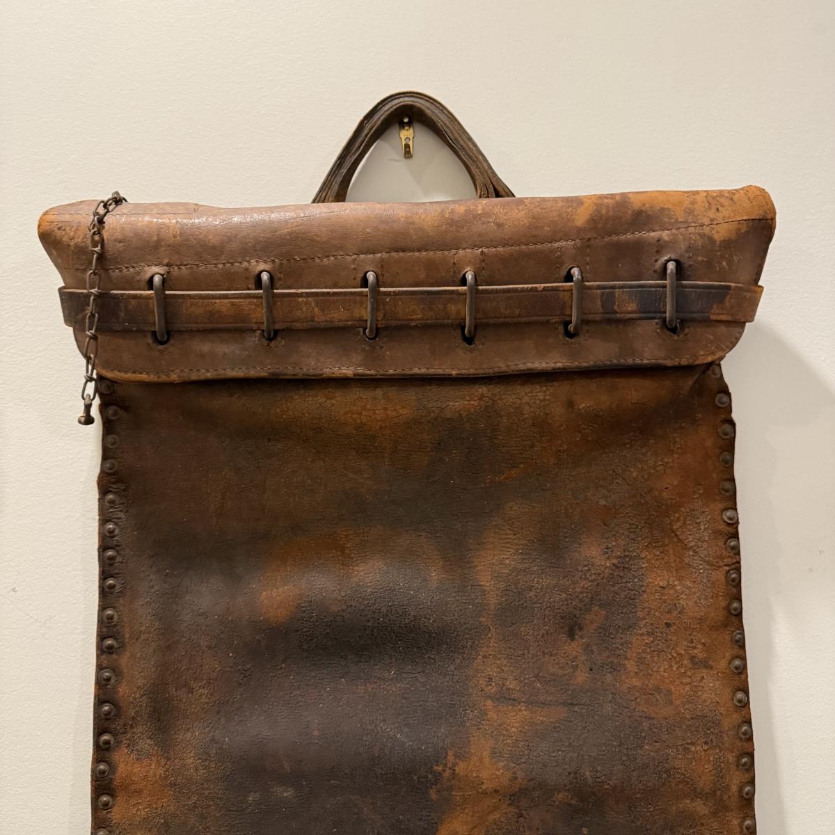 In this lot we have an antique leather mailbag. This piece of history is super neat, made out of thick leather and is clasped close with metal bars and long strap of leather that weaves through them. There is a handle at the top to carry or for an easy way to display it. This item measures 17.75” x 30”. This thing is old, worn, dusty and super cool. Shipping available.