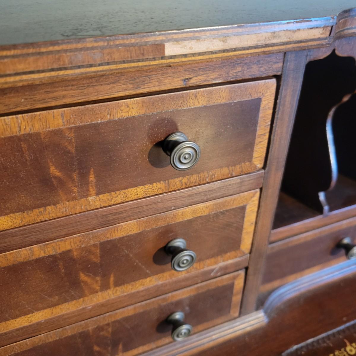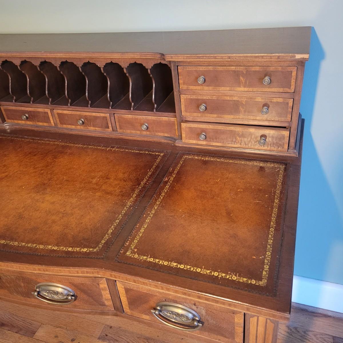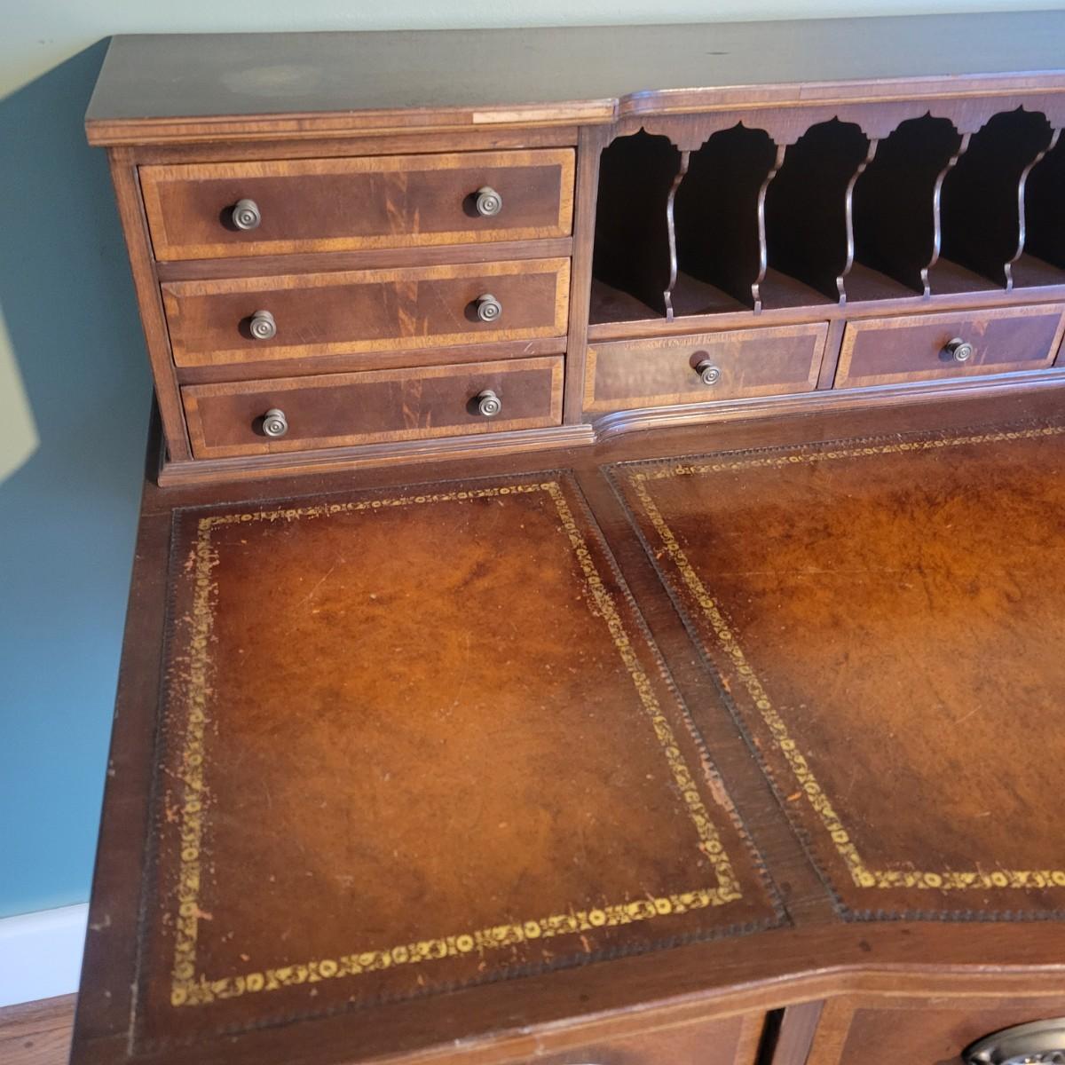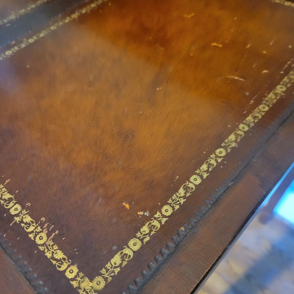 An antique leather top writing desk in good condition with some scratches on the leather, a water mark on its top surface and a few missing pieces of inlay. This beautiful piece features veneered and inlaid wood with brass hardware that has an oak leaf pattern. The smaller drawers are mortise and pin joints and the larger drawers are dovetailed. Measures approximately 42" x 23" x 37.5". Local pickup only