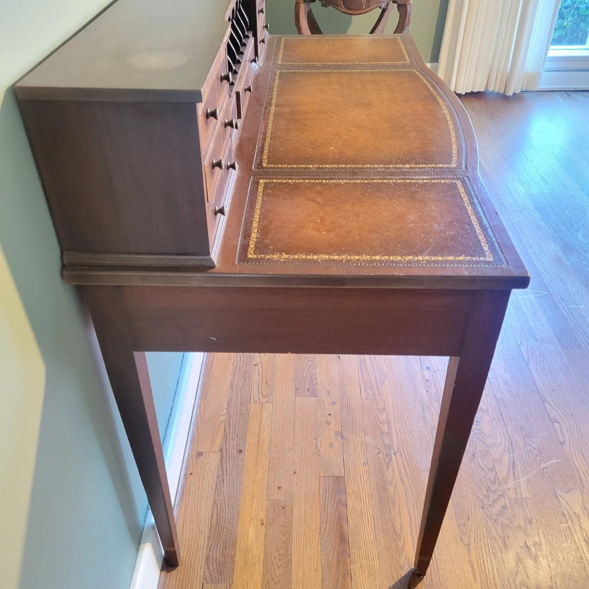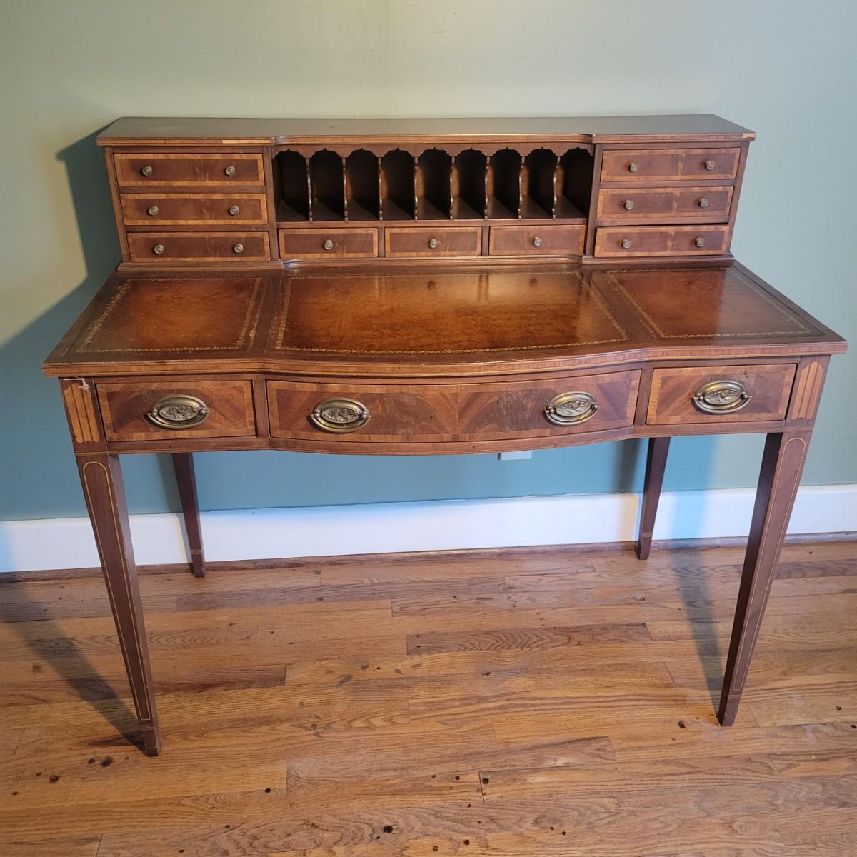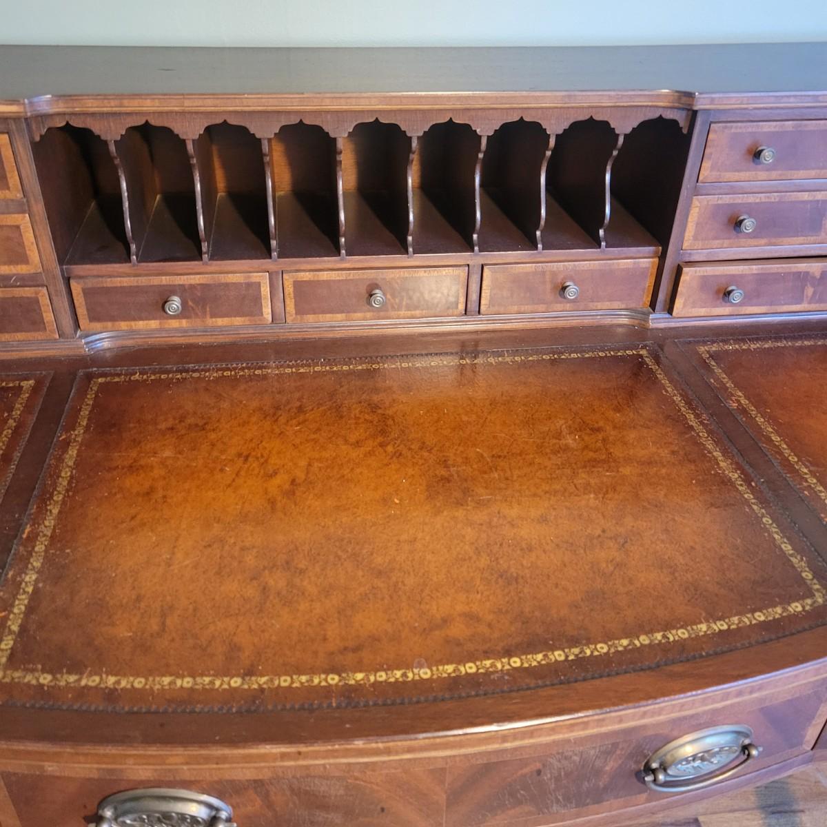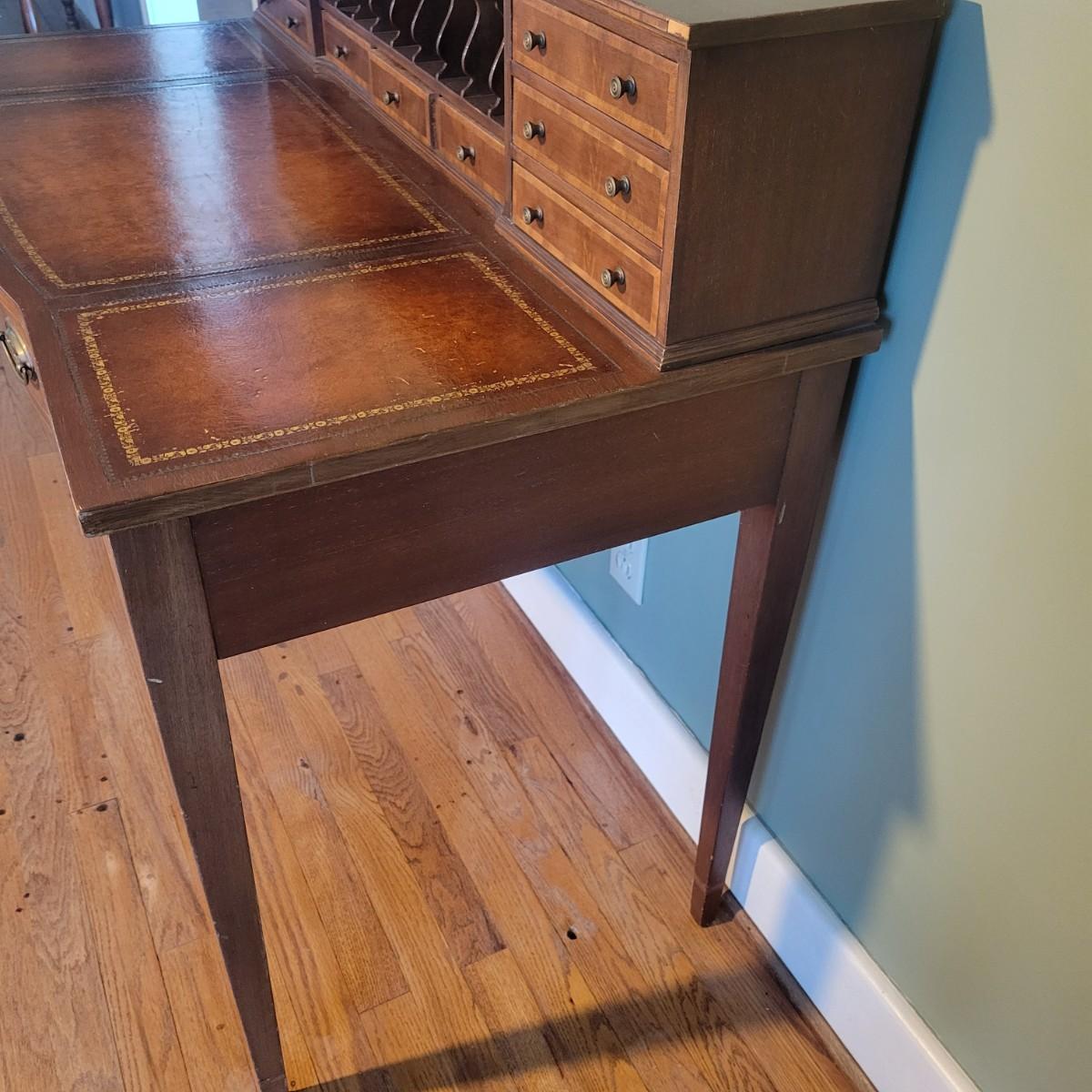 An antique leather top writing desk in good condition with some scratches on the leather, a water mark on its top surface and a few missing pieces of inlay. This beautiful piece features veneered and inlaid wood with brass hardware that has an oak leaf pattern. The smaller drawers are mortise and pin joints and the larger drawers are dovetailed. Measures approximately 42" x 23" x 37.5". Local pickup only