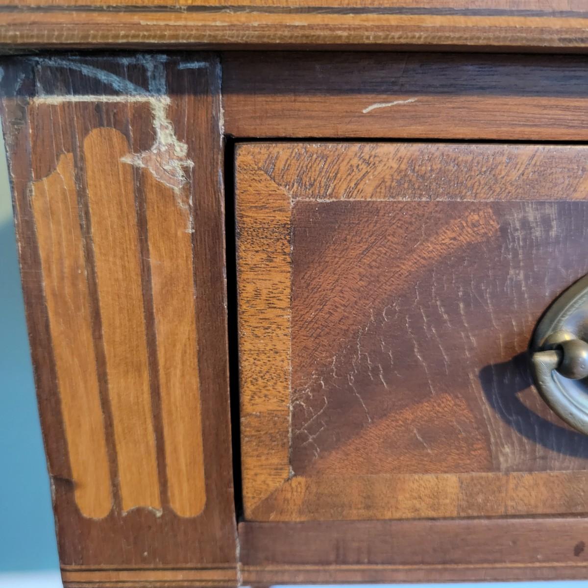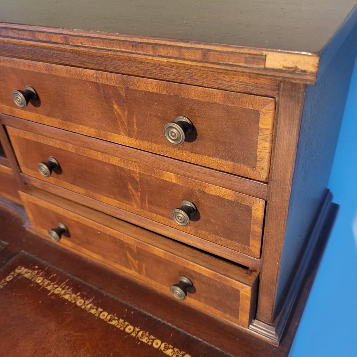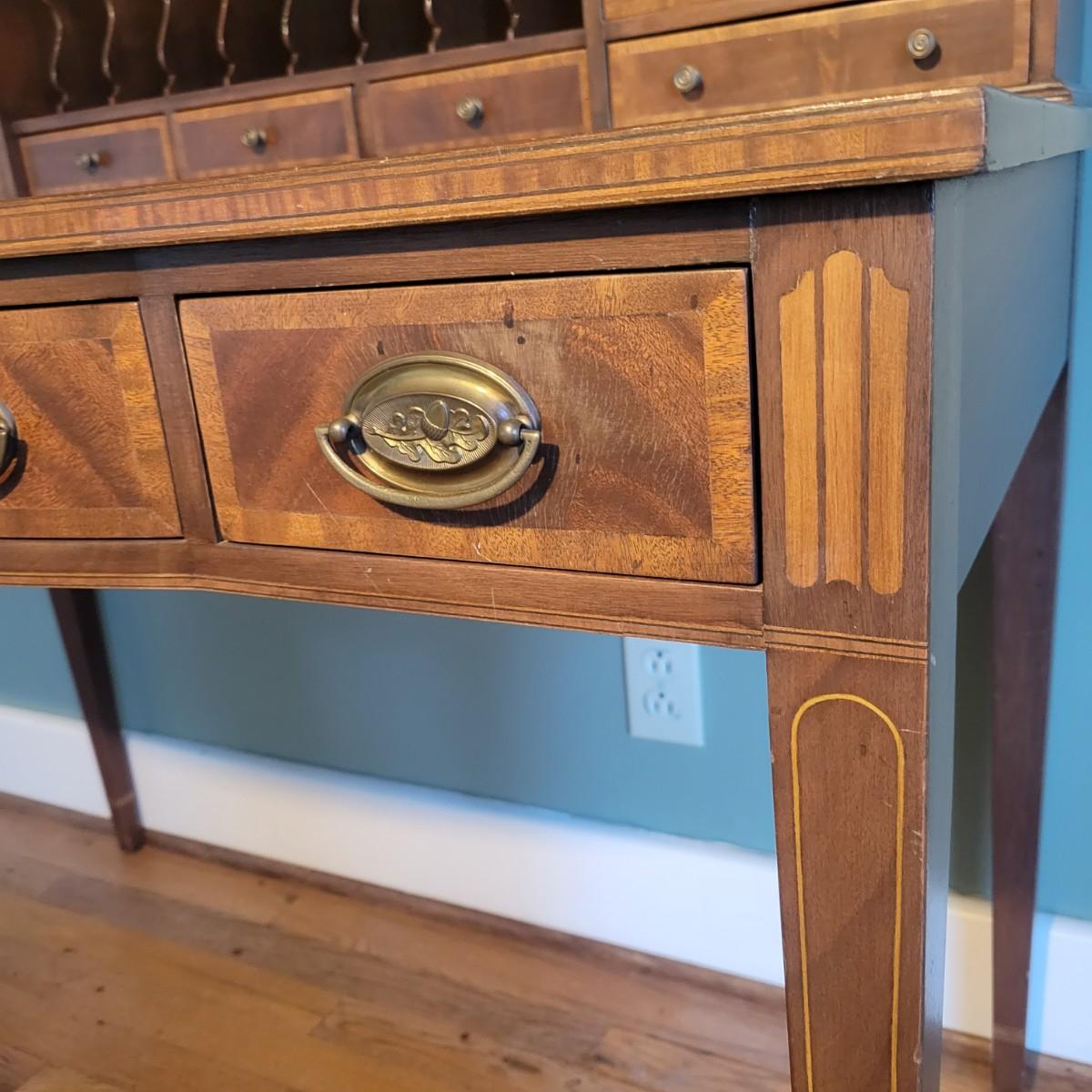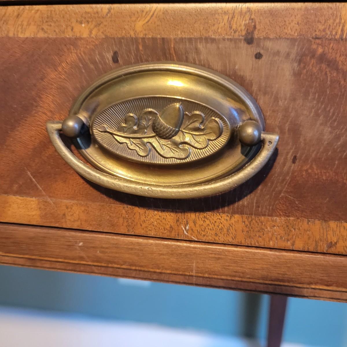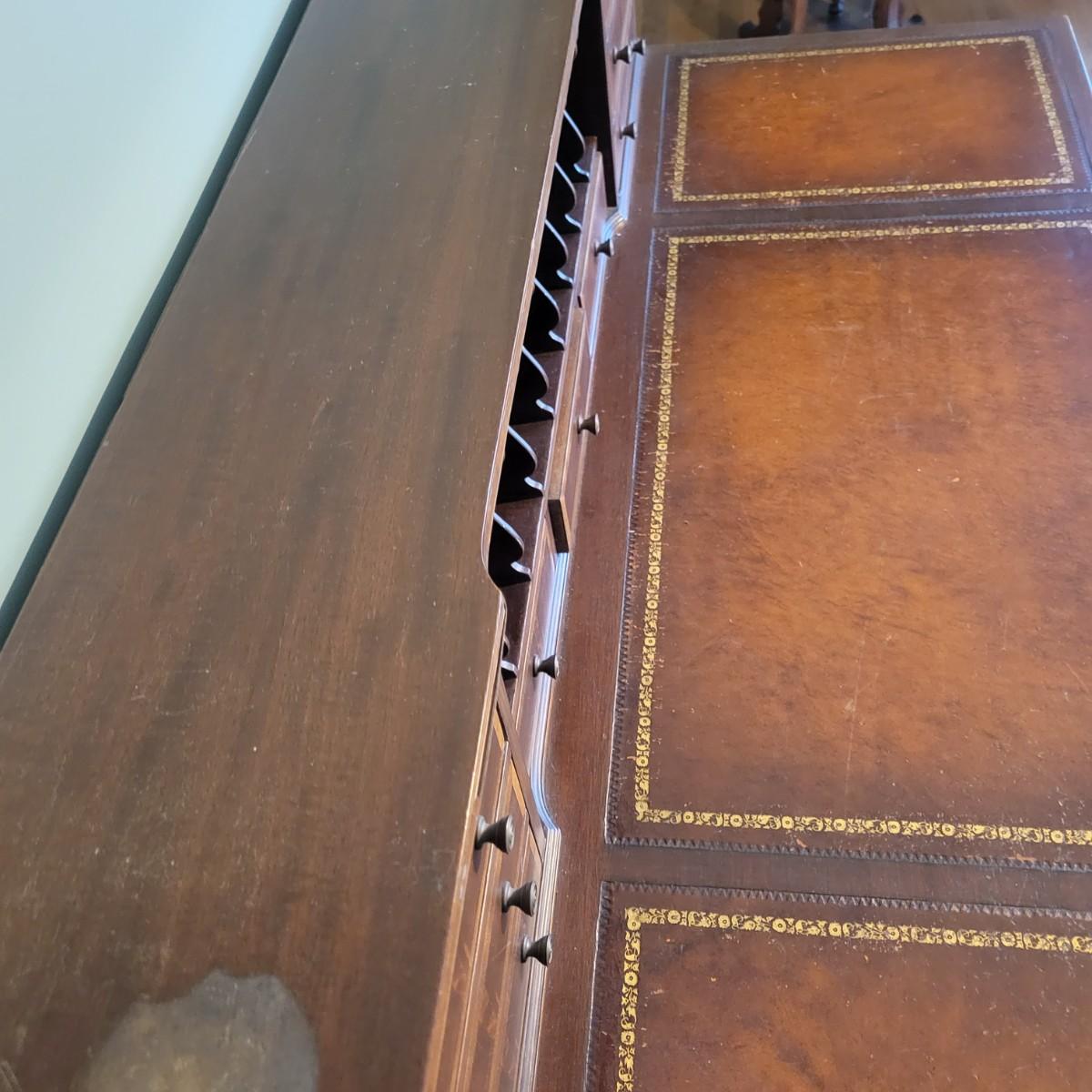 An antique leather top writing desk in good condition with some scratches on the leather, a water mark on its top surface and a few missing pieces of inlay. This beautiful piece features veneered and inlaid wood with brass hardware that has an oak leaf pattern. The smaller drawers are mortise and pin joints and the larger drawers are dovetailed. Measures approximately 42" x 23" x 37.5". Local pickup only