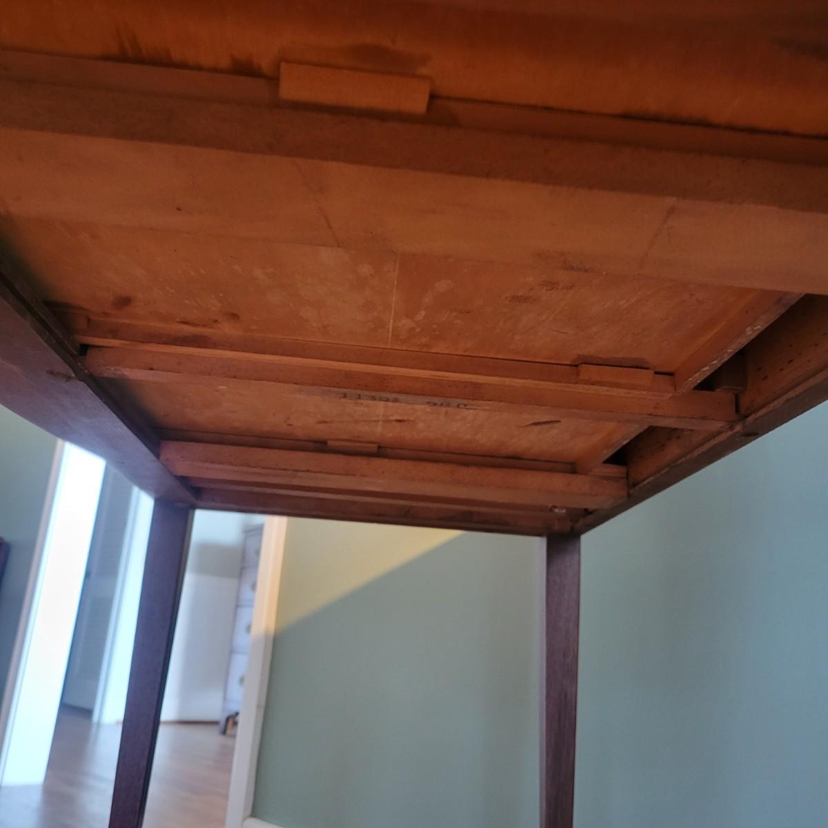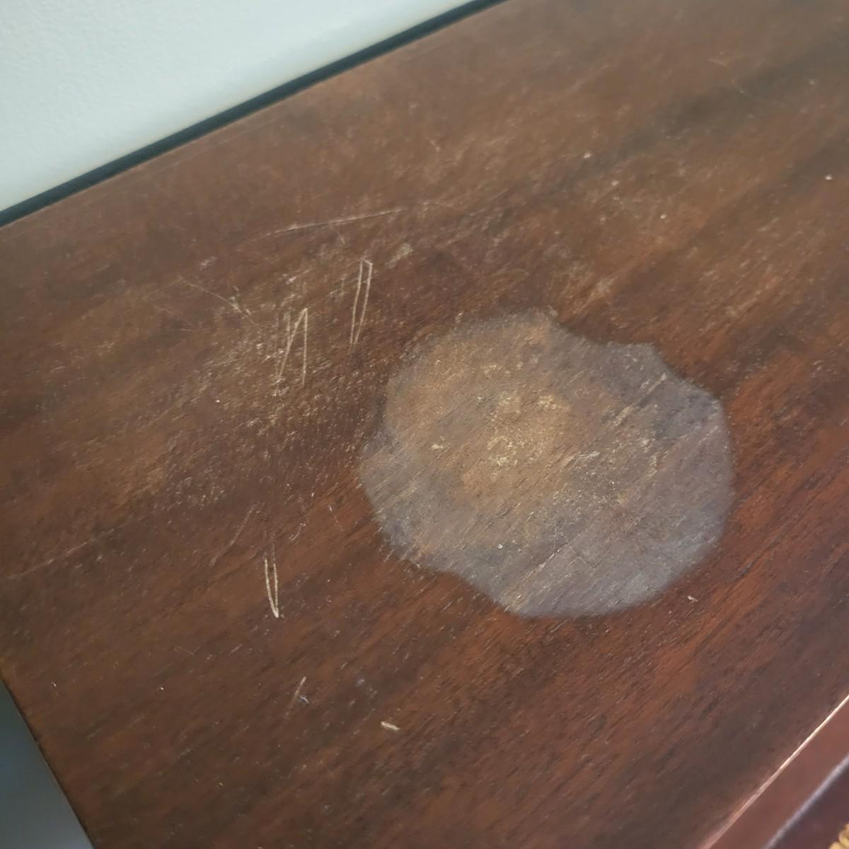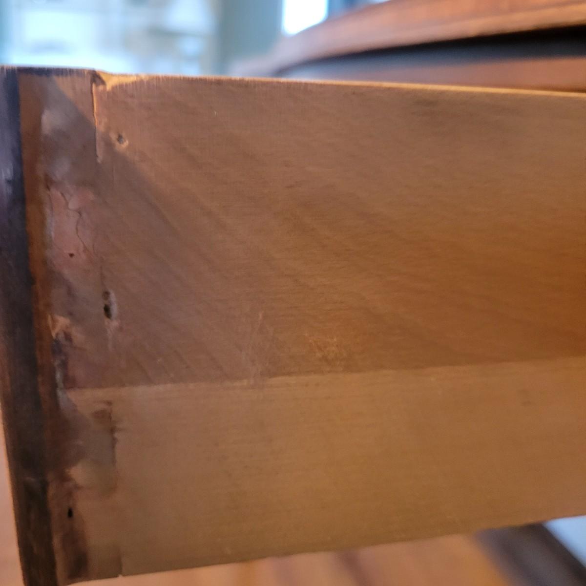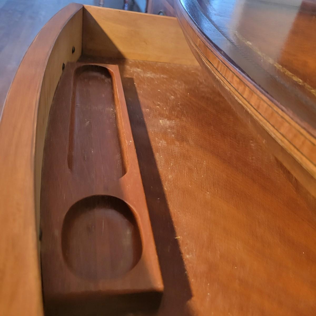 An antique leather top writing desk in good condition with some scratches on the leather, a water mark on its top surface and a few missing pieces of inlay. This beautiful piece features veneered and inlaid wood with brass hardware that has an oak leaf pattern. The smaller drawers are mortise and pin joints and the larger drawers are dovetailed. Measures approximately 42" x 23" x 37.5". Local pickup only