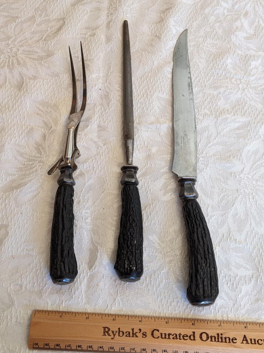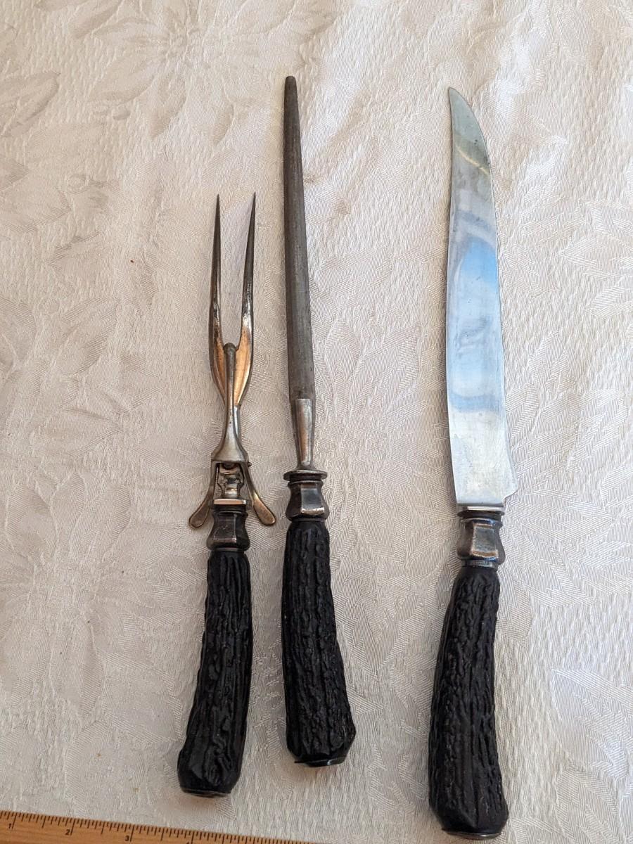 Antique Lee's set of 3 Antler Carving Knife Set with Sterling Silver Overlay