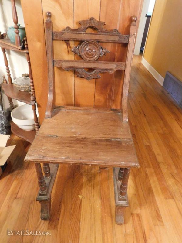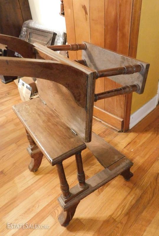 Library chair swivels to make a step stool. Step on reverse needs repair or replacement. All other structural components are sturdy. A nice collector piece.
