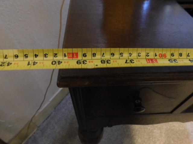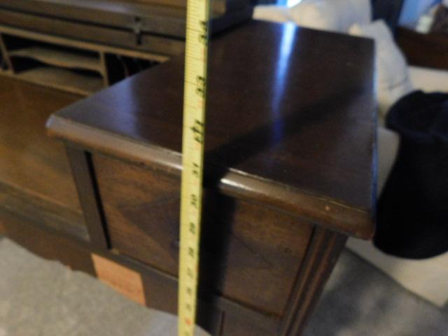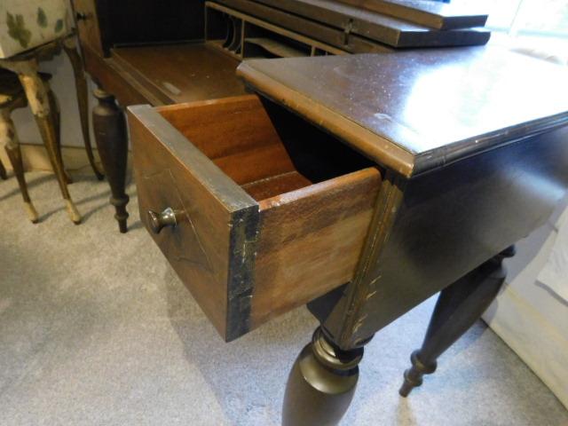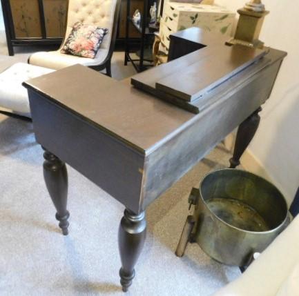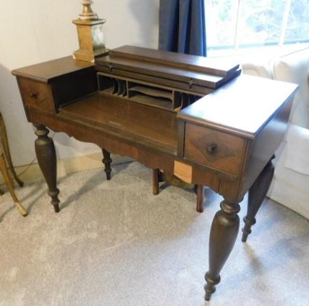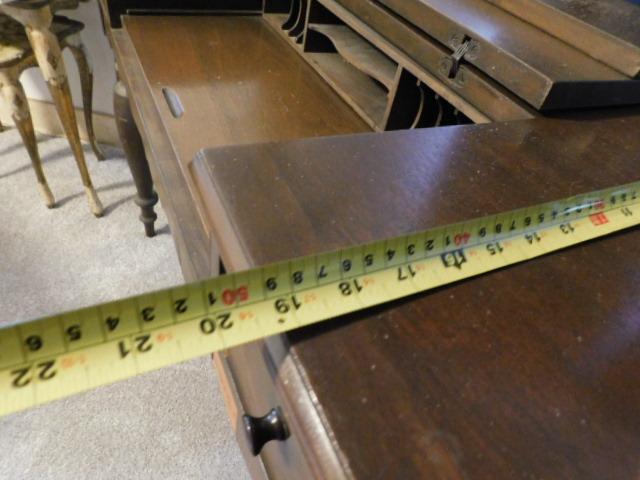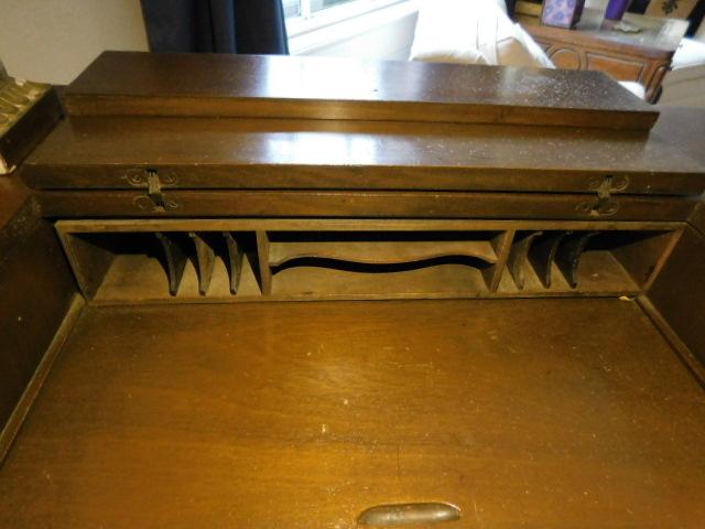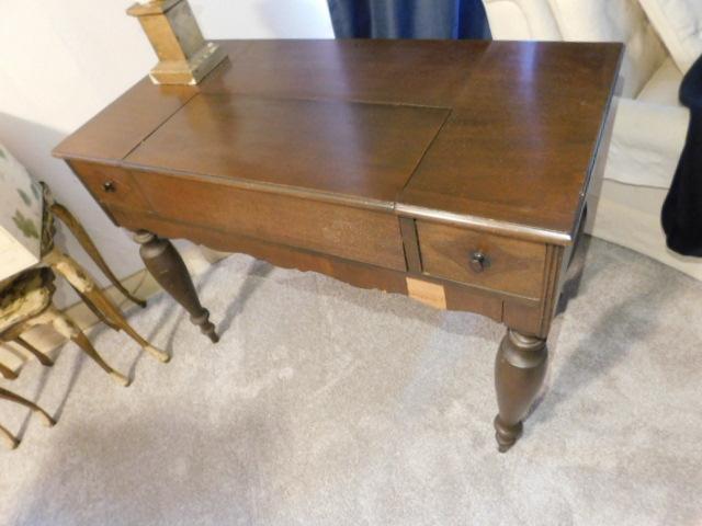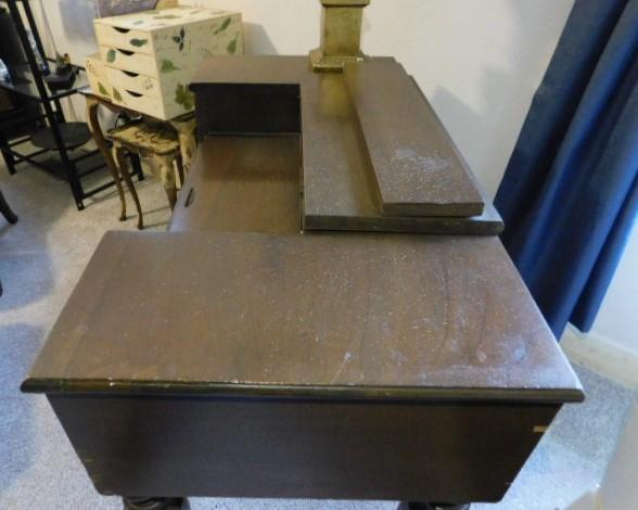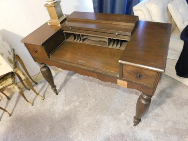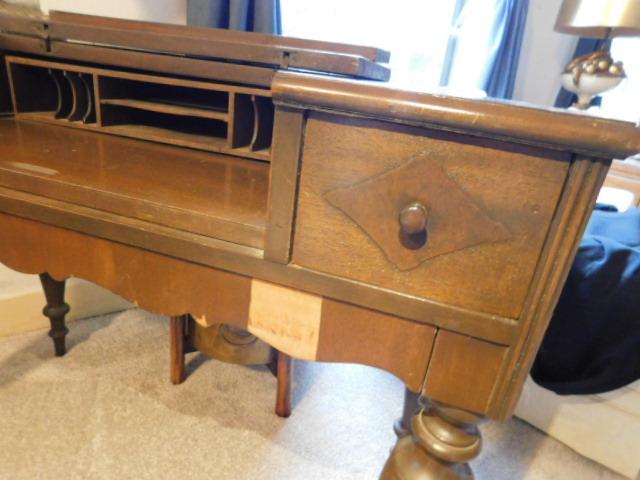 Antique Library Desk with Gallery 40"x19"x31" has some missing veneer and scratches.