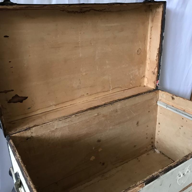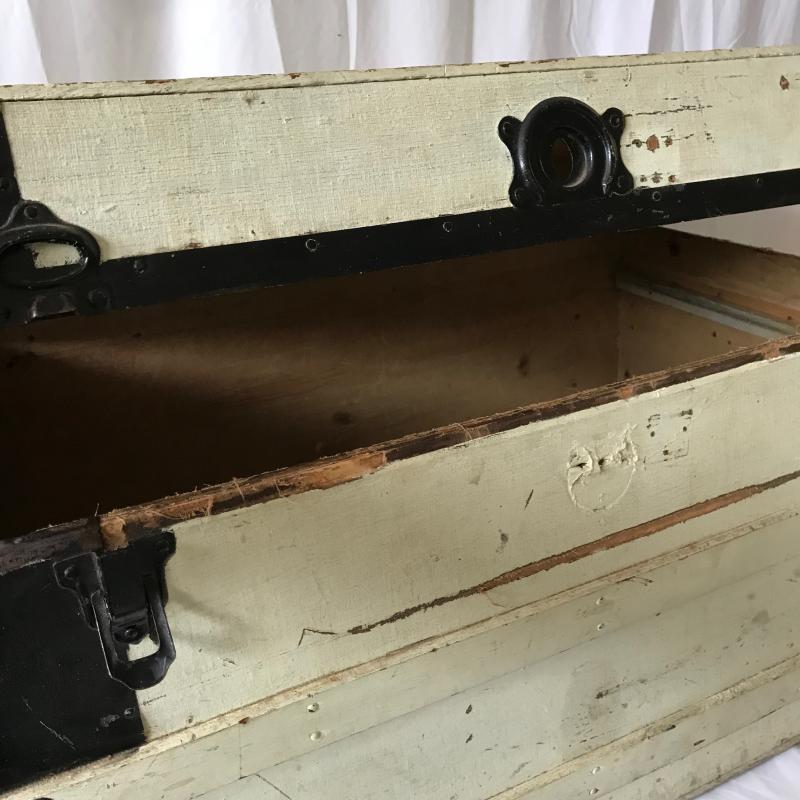 Large mint green trunk with black metal accents. 33” x 18” x 21”. No shipping available. Local pickup only in Hendersonville, NC.