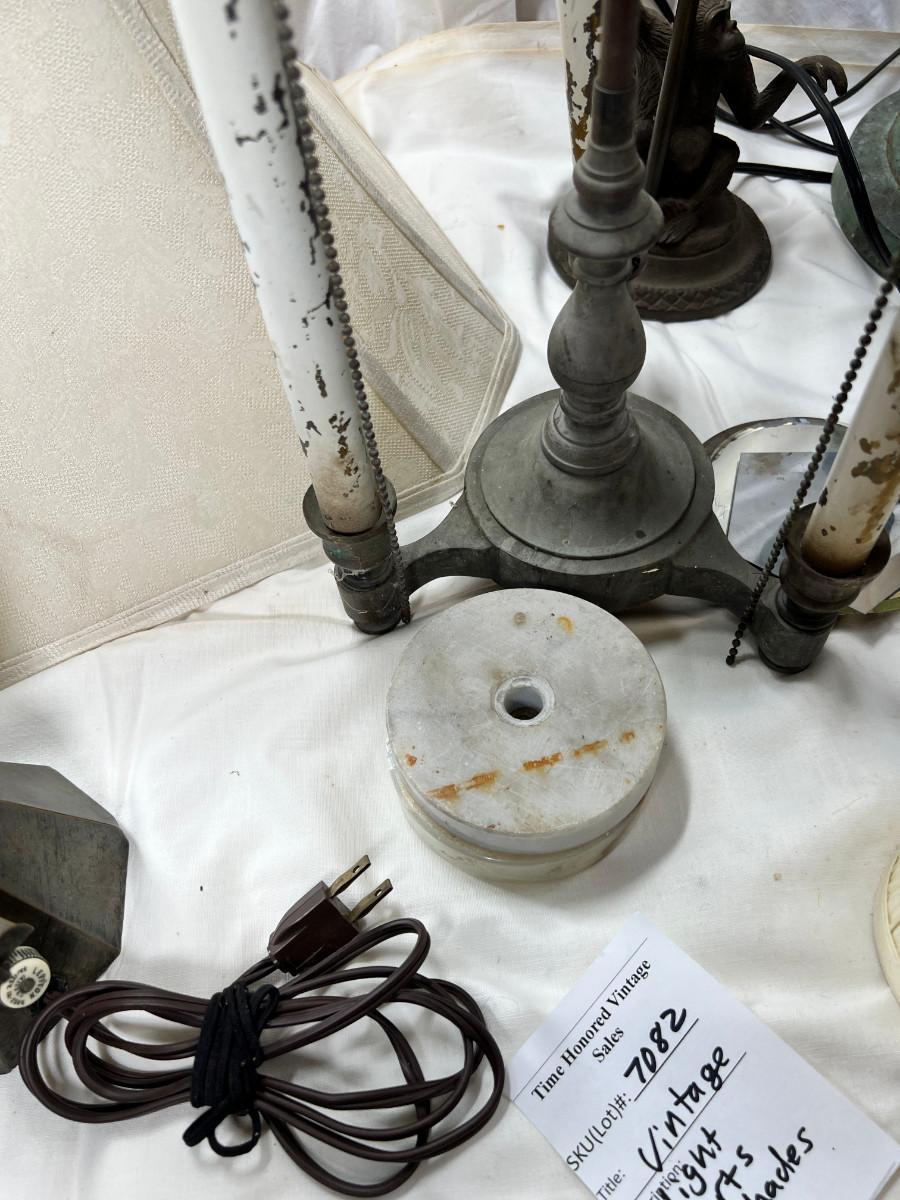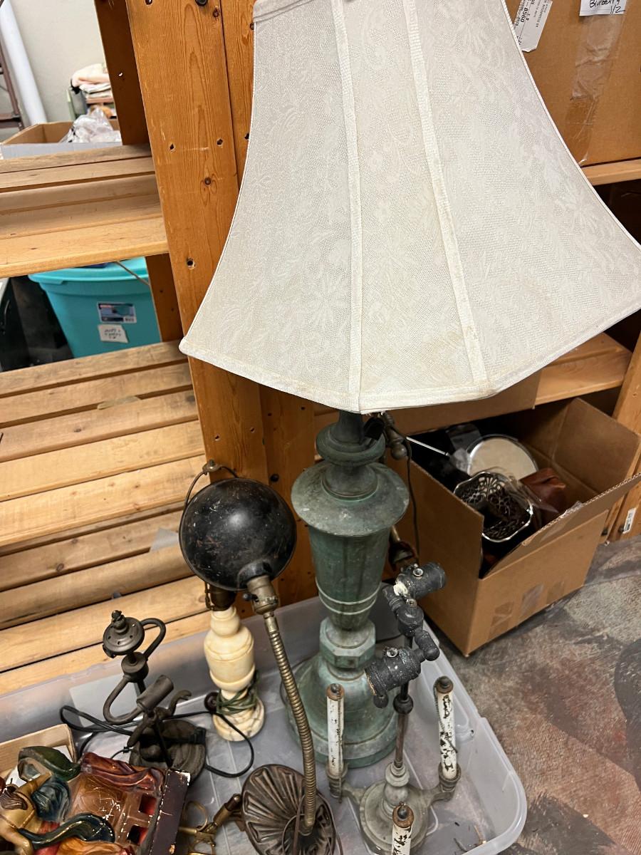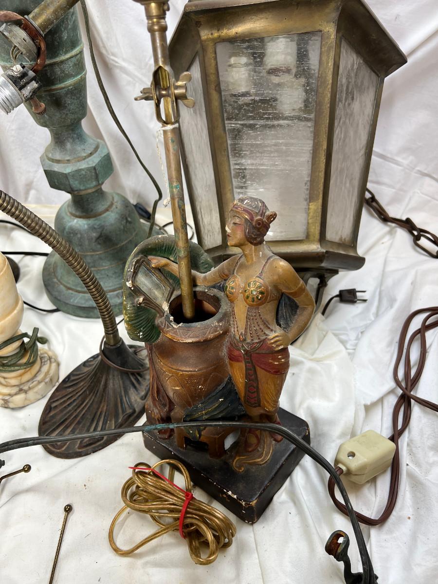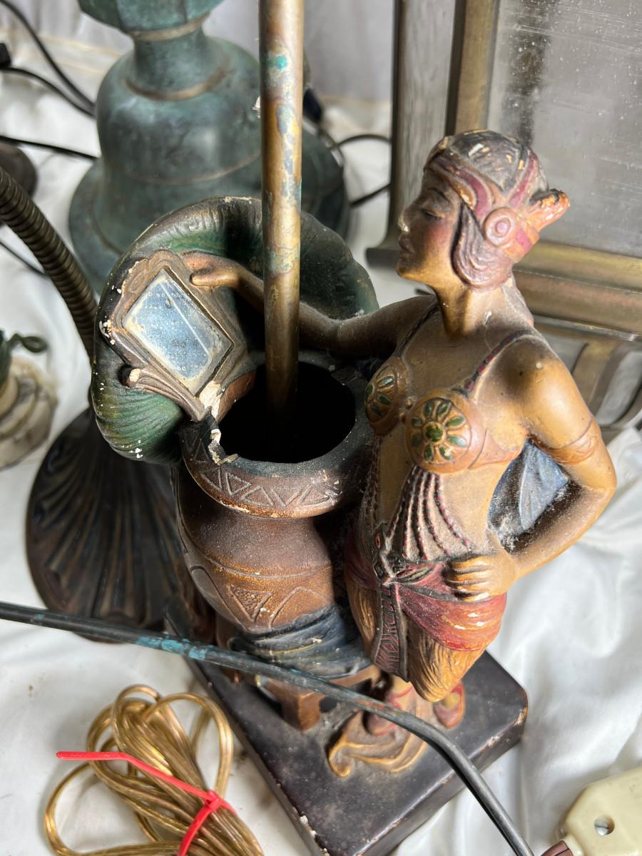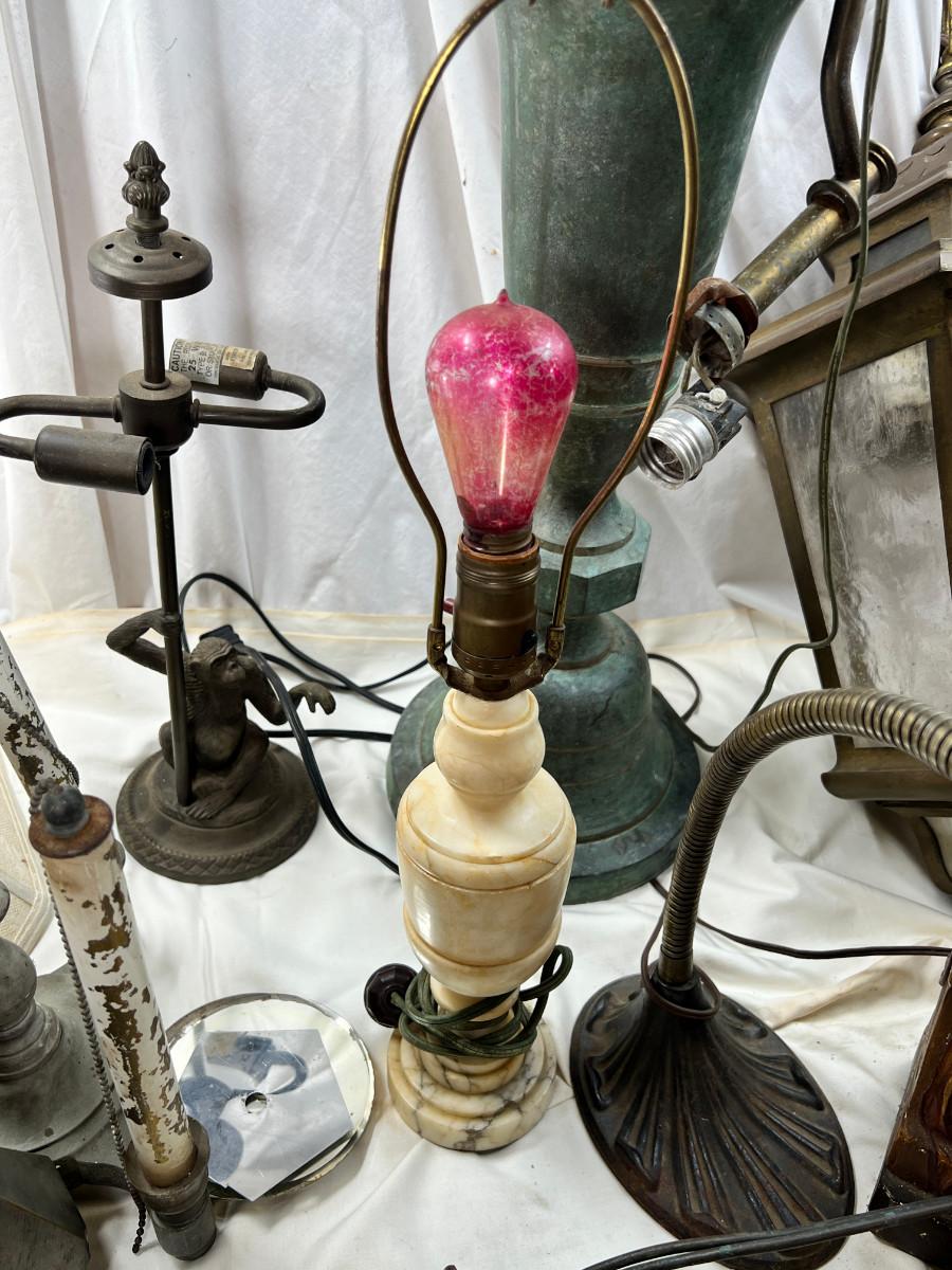 Mostly project lamps. Huge very heavy solid copper cast metal lamp.. Heavy Swag lamp, Industrial desk light. Maiden looking into the mirror lamp base. Cast Monkey light. If lamps are your hobby, or you do metal projects this is a fantastic lot! There is a marble table lamp, and a good lamp shade.. No shipping lots of heavy metal here.