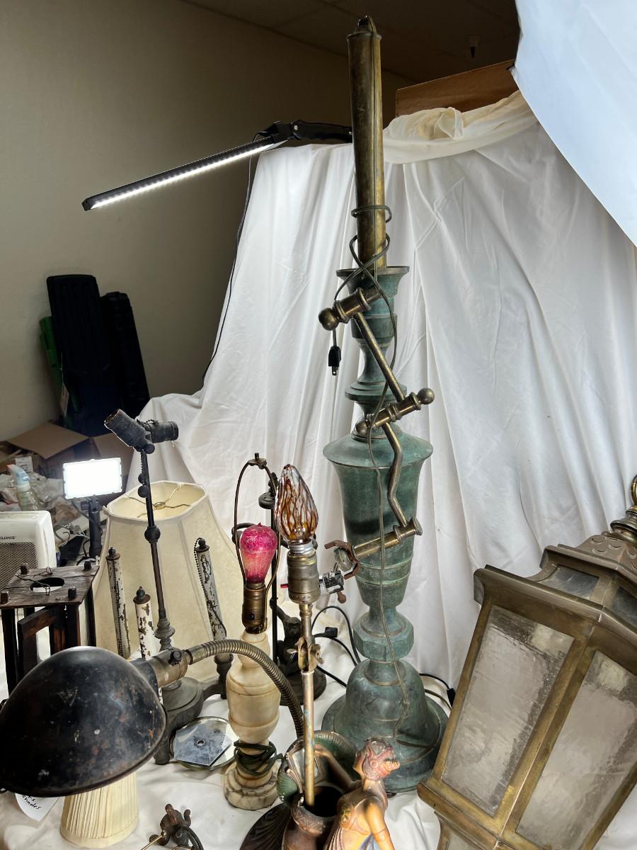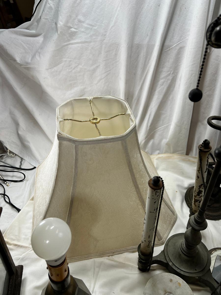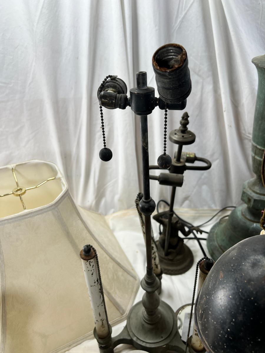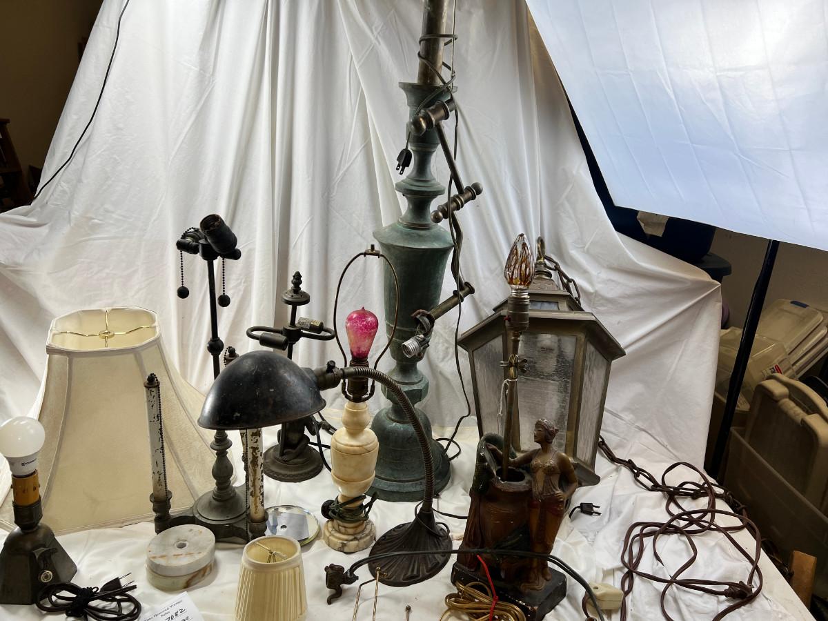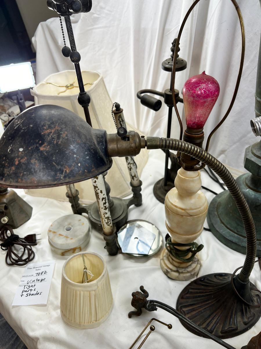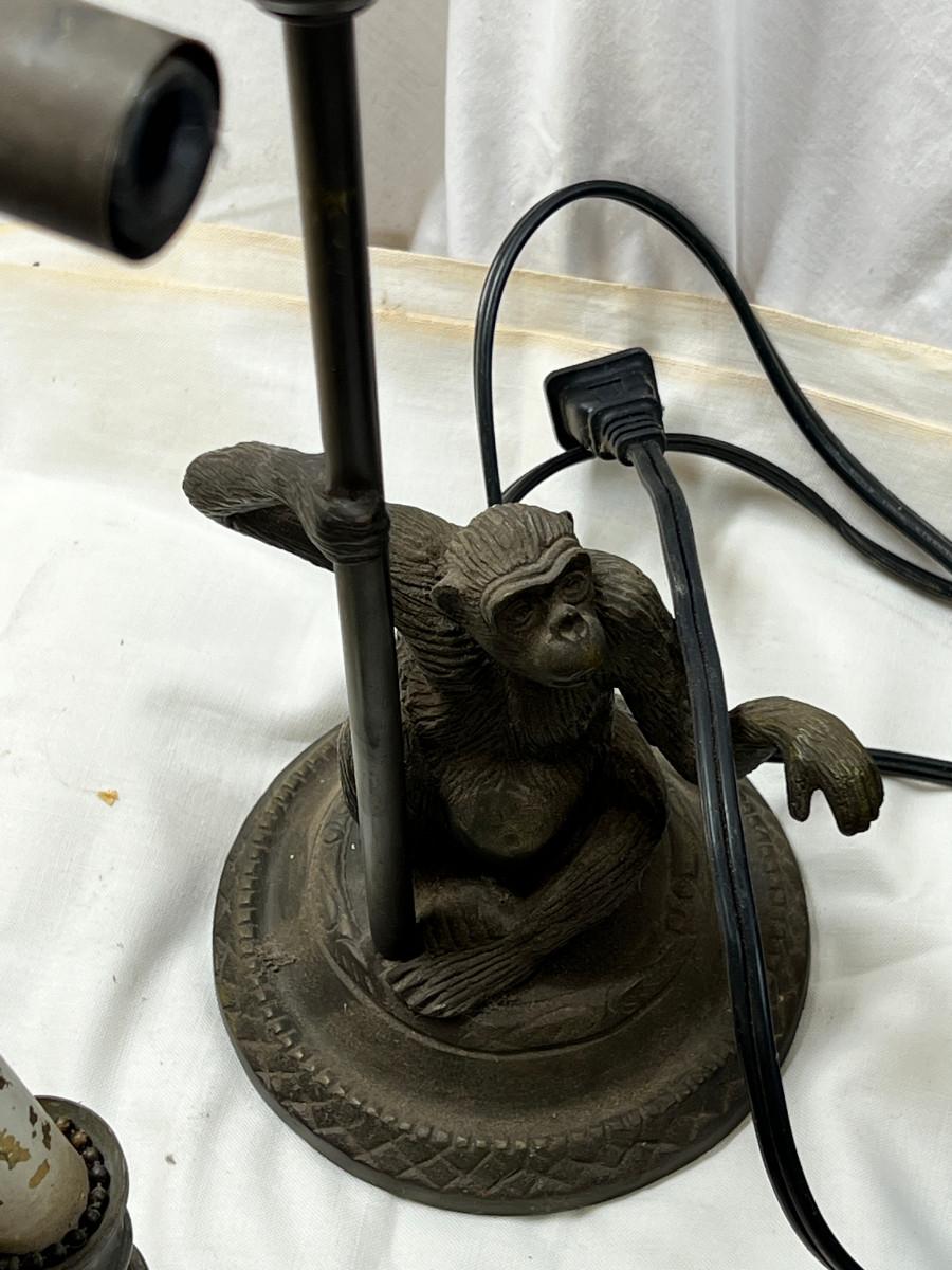 Mostly project lamps. Huge very heavy solid copper cast metal lamp.. Heavy Swag lamp, Industrial desk light. Maiden looking into the mirror lamp base. Cast Monkey light. If lamps are your hobby, or you do metal projects this is a fantastic lot! There is a marble table lamp, and a good lamp shade.. No shipping lots of heavy metal here.