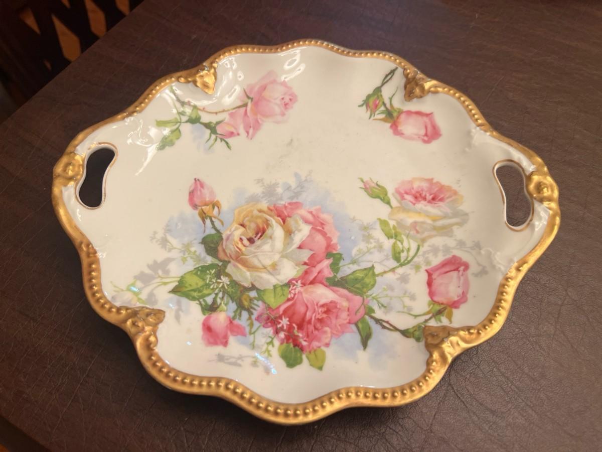 Antique Limoges France Handled Cake Plate – Pink & White Roses with Heavy Gold Trim