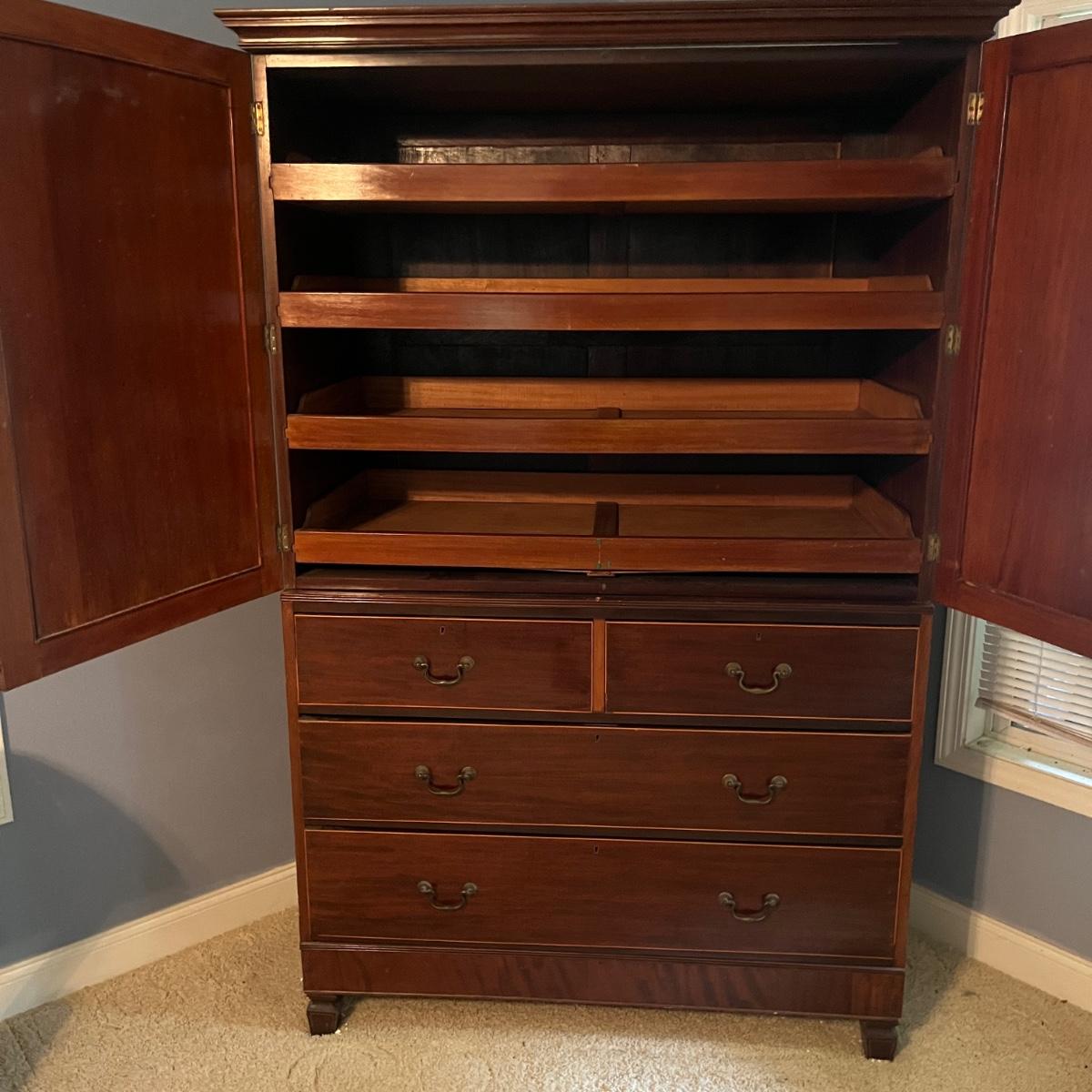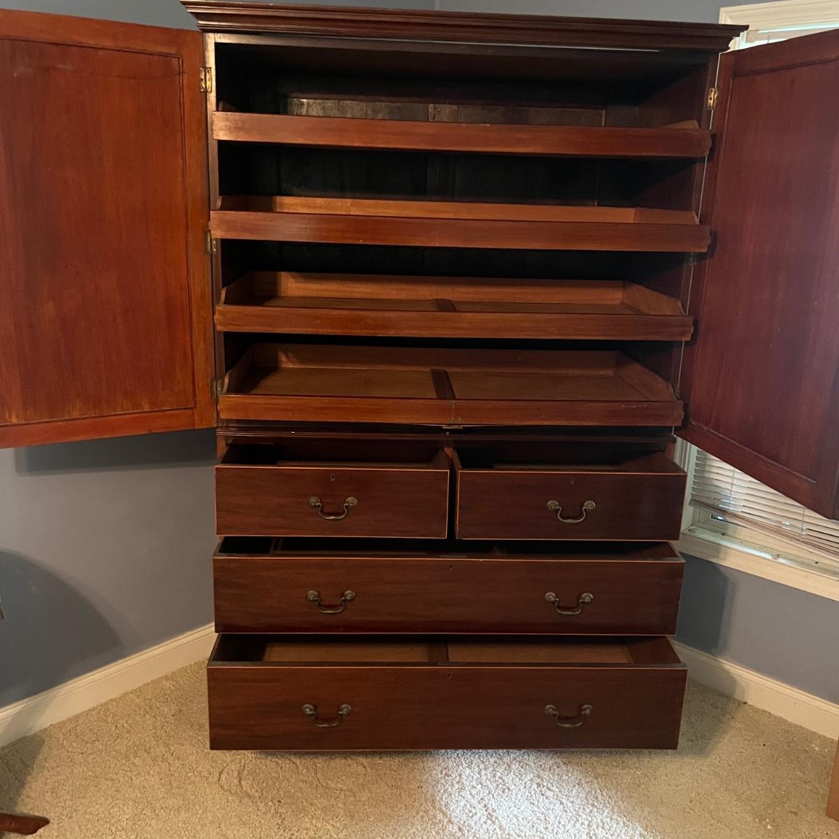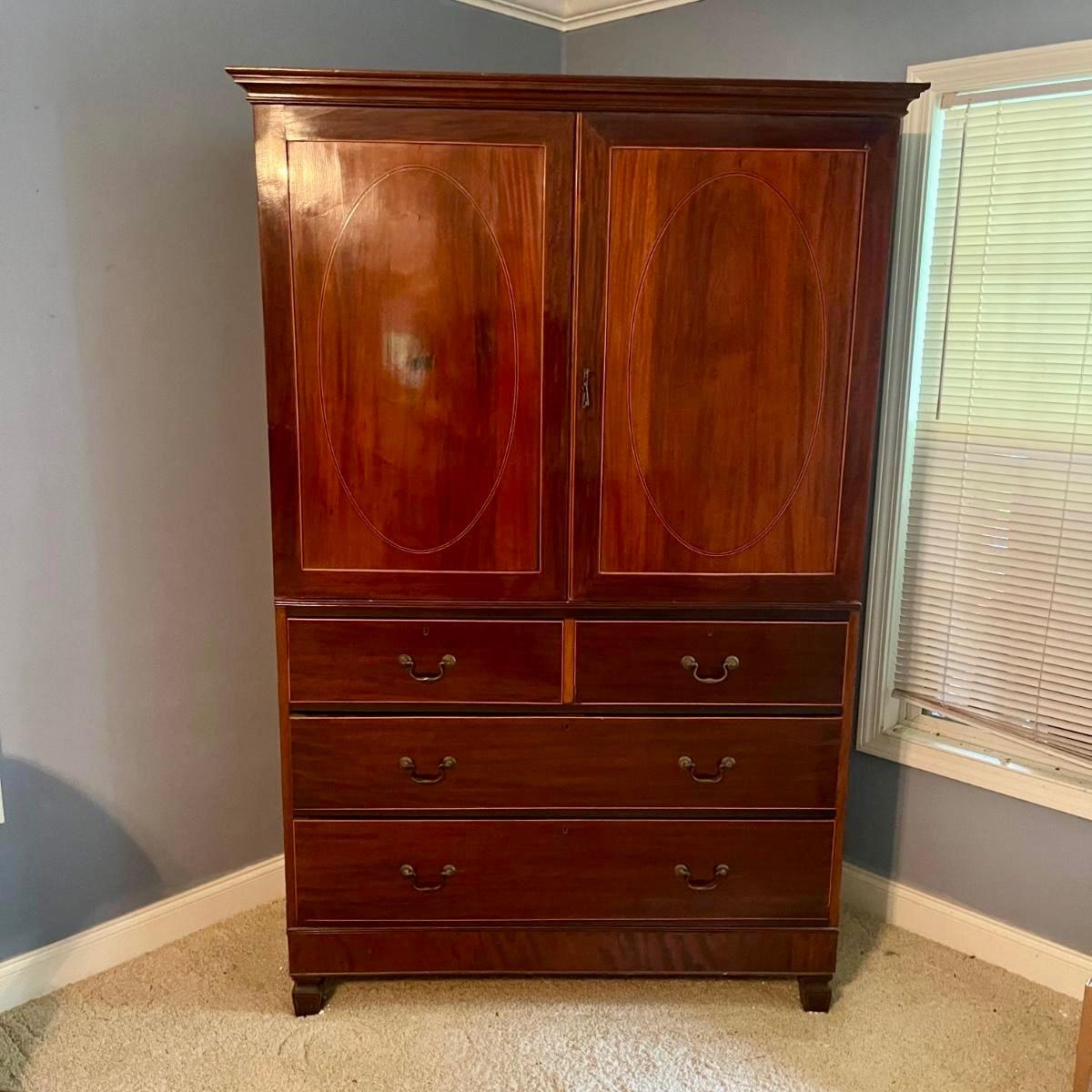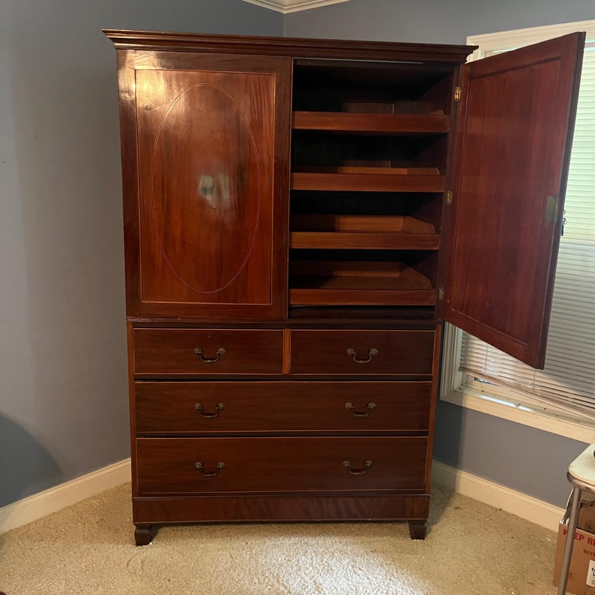 Lot includes an antique linen press that has four dovetailed drawers on the bottom and four drawers behind the cabinet doors. Appears to be a one piece unit. Includes keys. Estate owner states item is from England and over 200 years old but we cannot verify this. Item measures 48” x 24” x 78.5”H. Piece has gouge on side, see pictures and one leg is not attached.