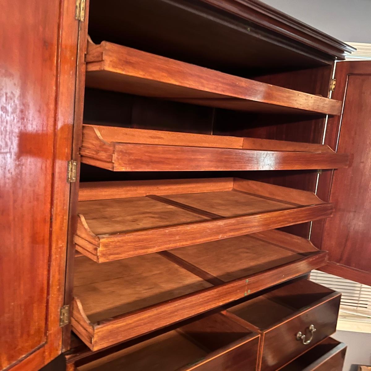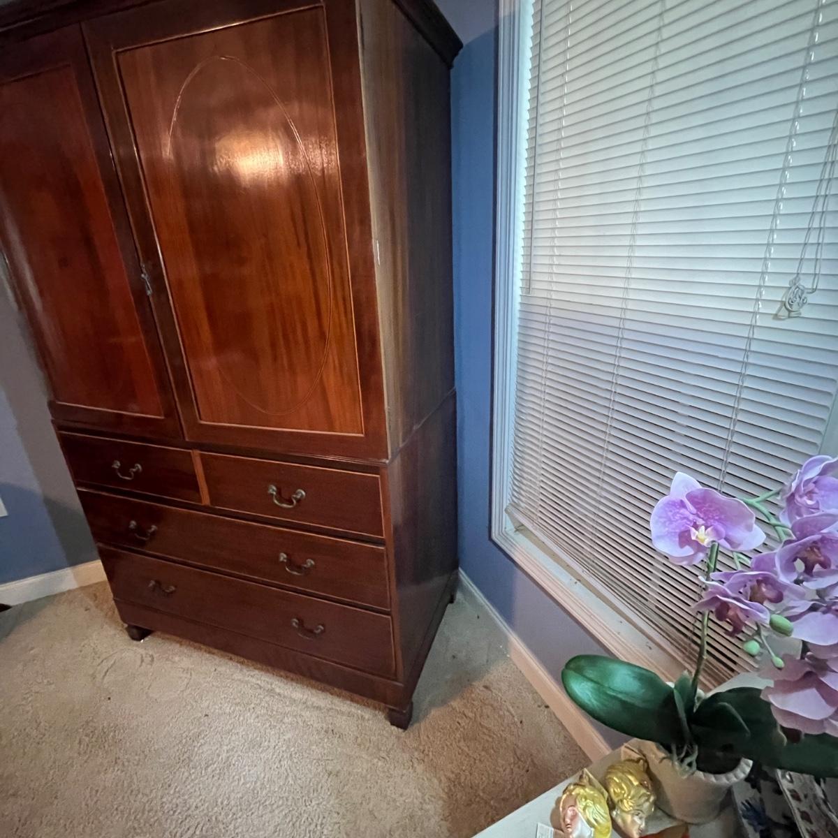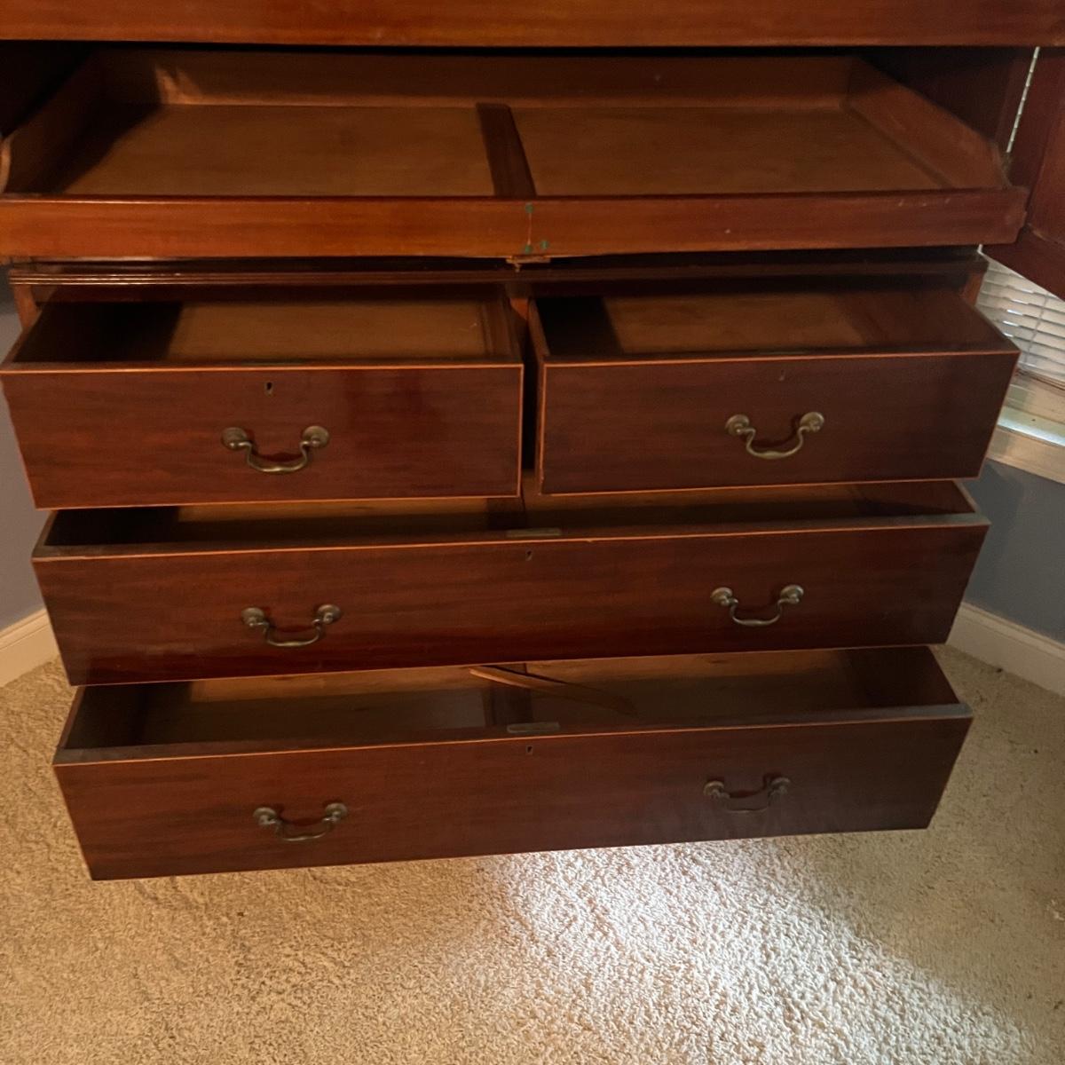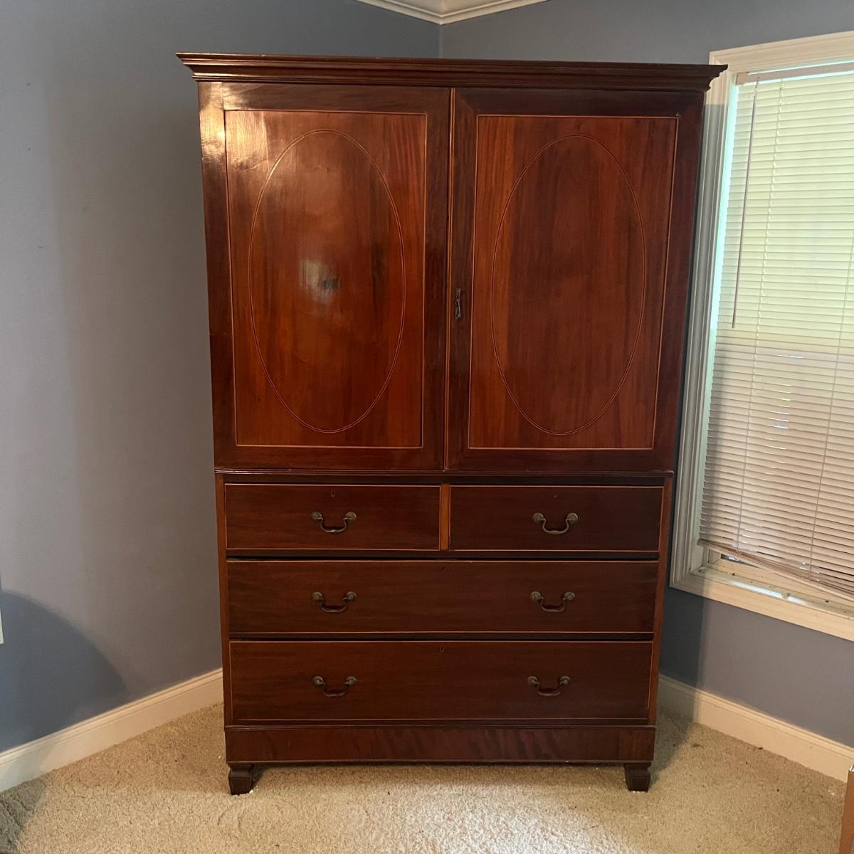 Lot includes an antique linen press that has four dovetailed drawers on the bottom and four drawers behind the cabinet doors. Appears to be a one piece unit. Includes keys. Estate owner states item is from England and over 200 years old but we cannot verify this. Item measures 48” x 24” x 78.5”H. Piece has gouge on side, see pictures and one leg is not attached.