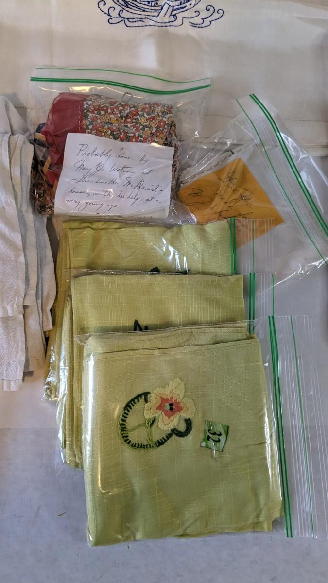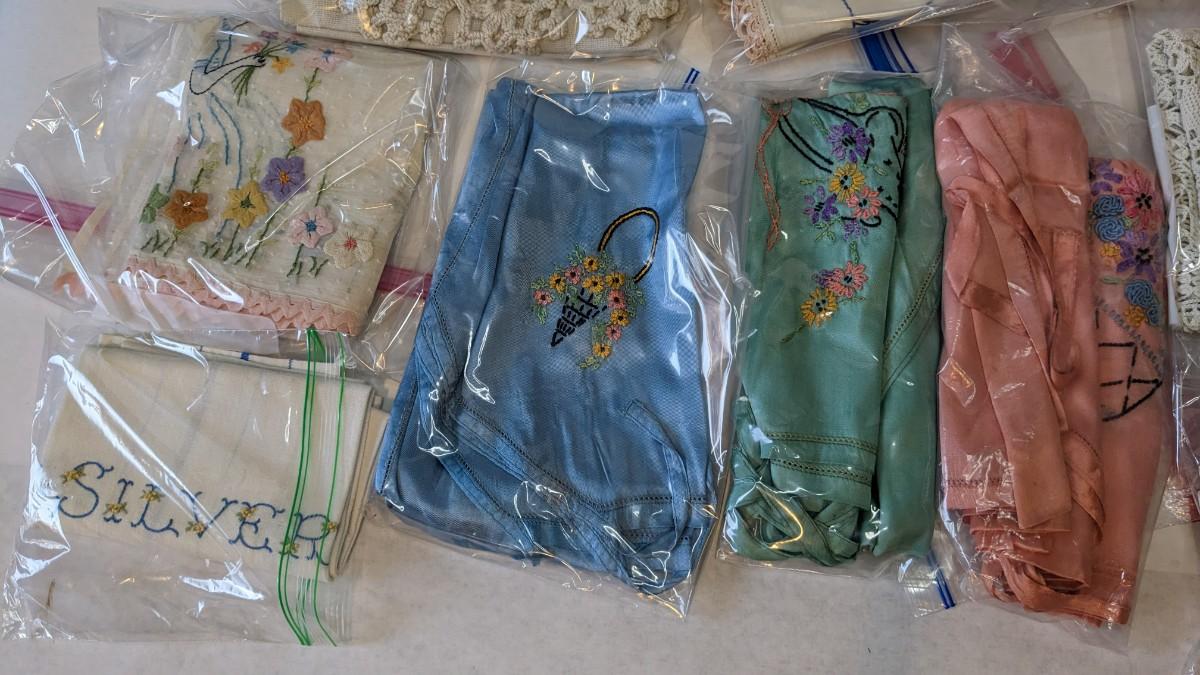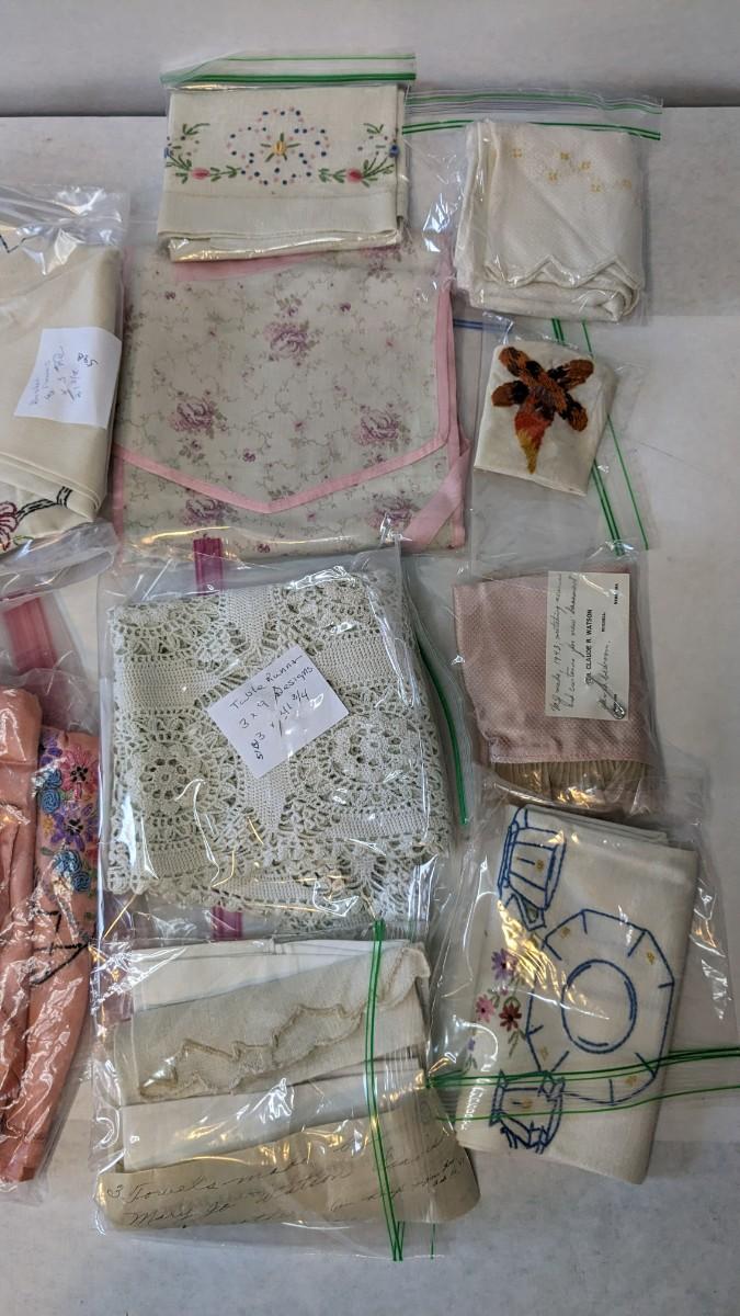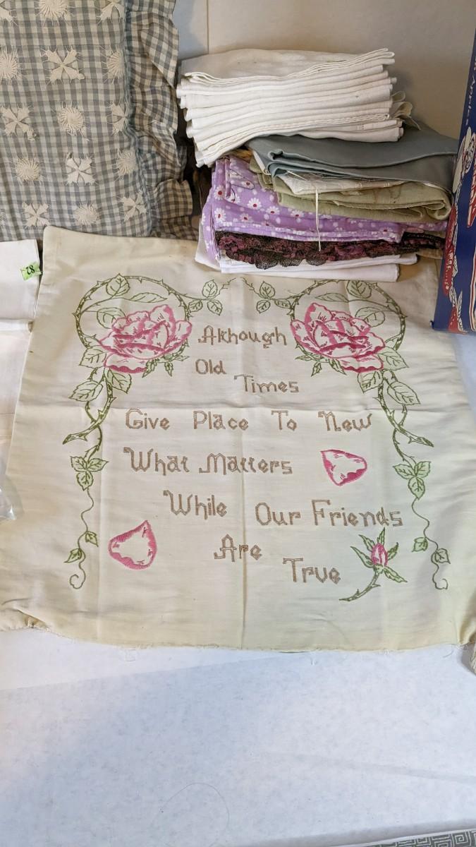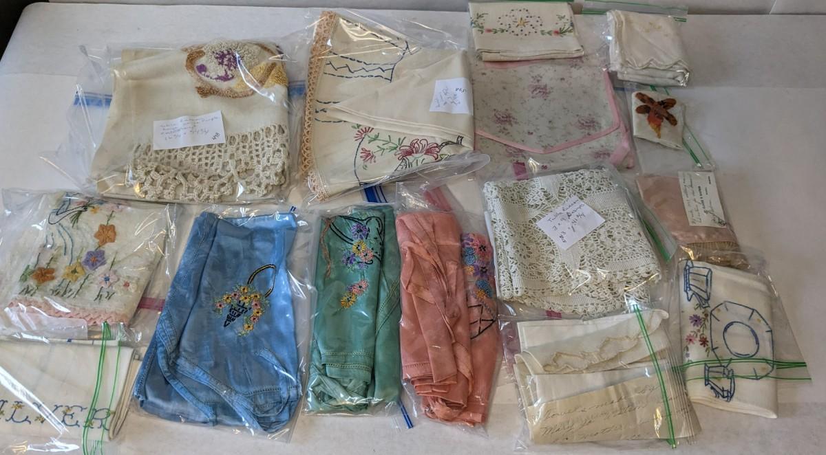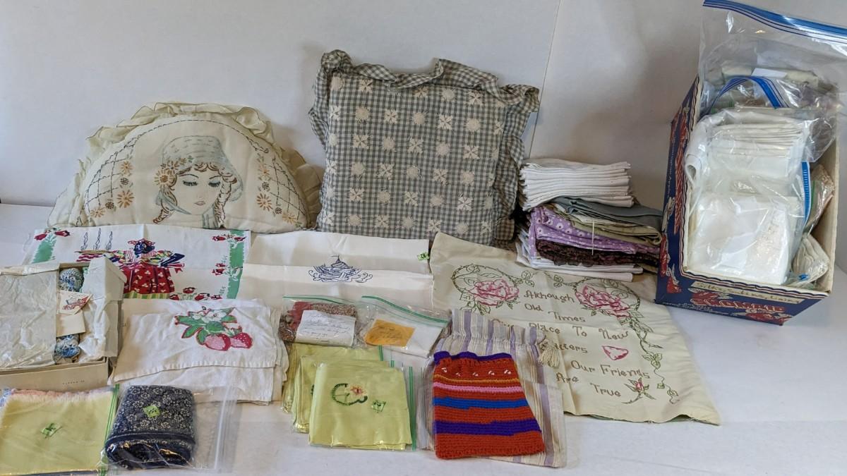 Includes pillows, pillow cases, napkins, tea towels, table clothes, fun little soda koozies, laundry bags, a lovely mix of cotton, satin, silk, and more. Also includes a few lace pieces that appear to be table runners. A really incredible assortment.
