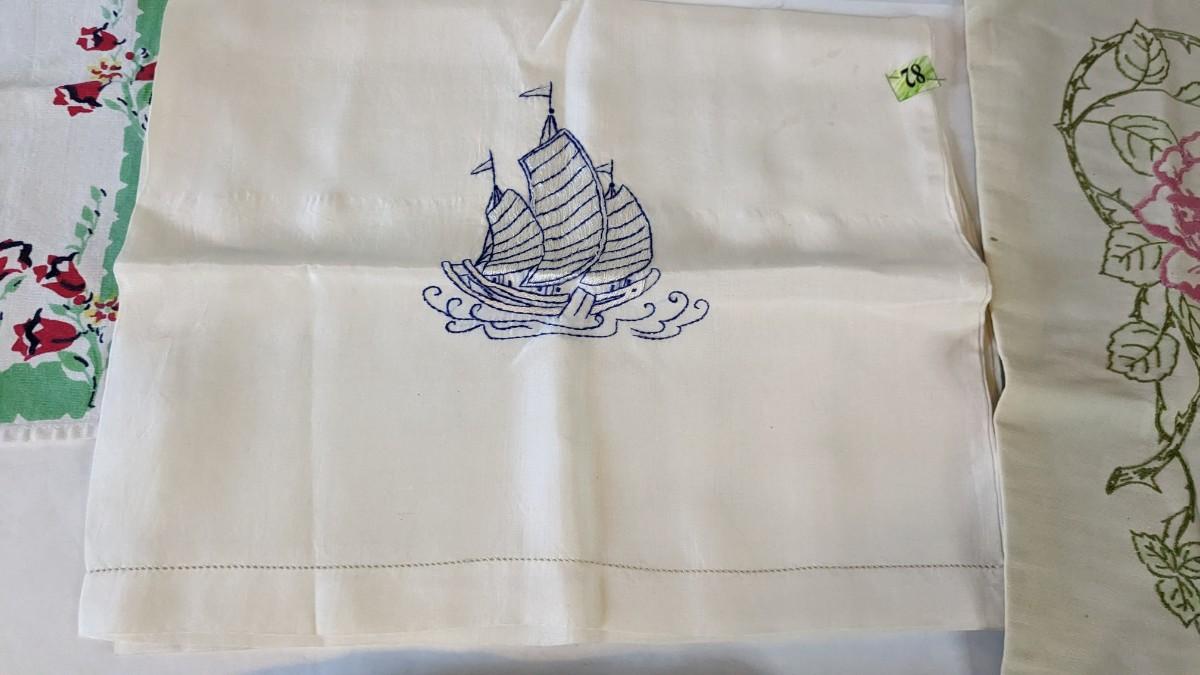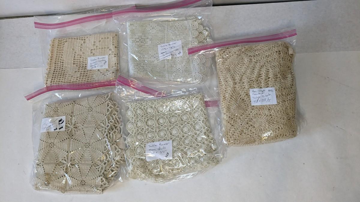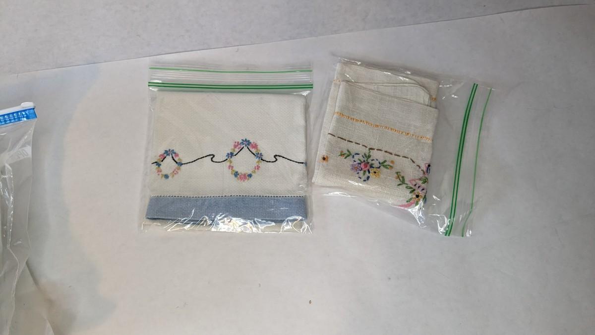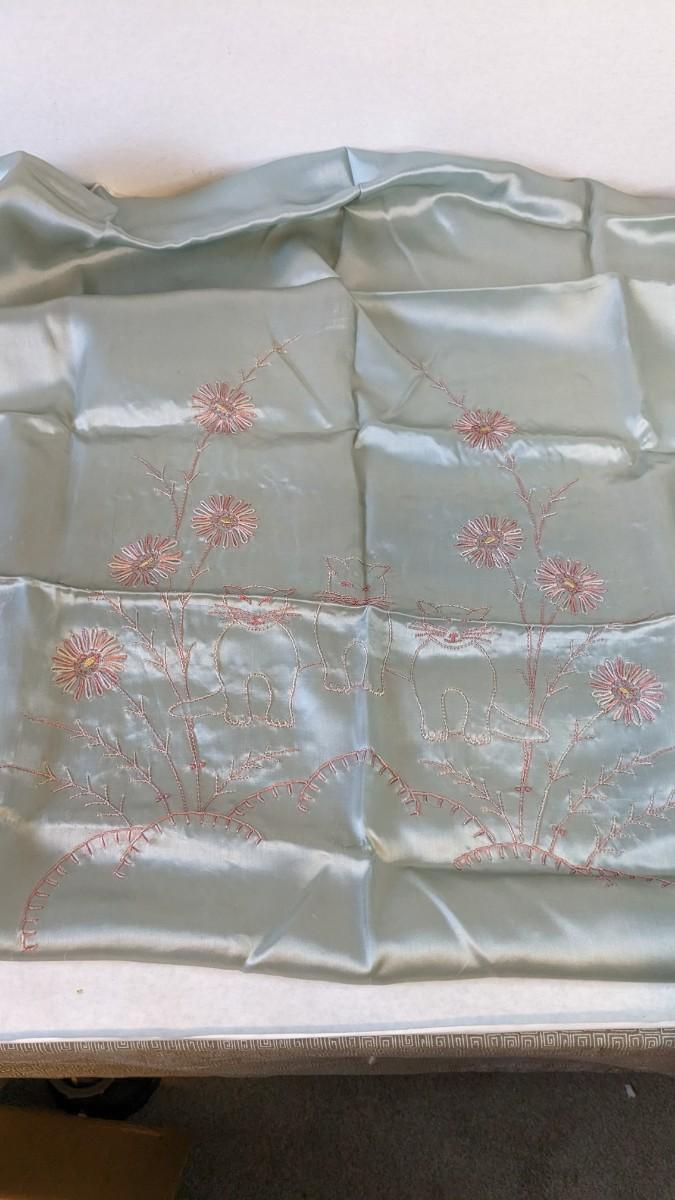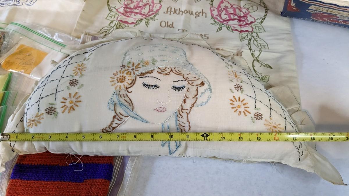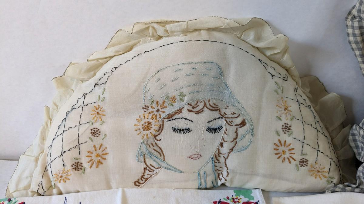 Includes pillows, pillow cases, napkins, tea towels, table clothes, fun little soda koozies, laundry bags, a lovely mix of cotton, satin, silk, and more. Also includes a few lace pieces that appear to be table runners. A really incredible assortment.