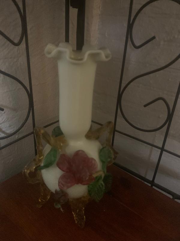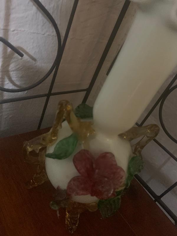 19th Century Loetz style Glass Vase with applied flowers.’ 10” H excellent condition.