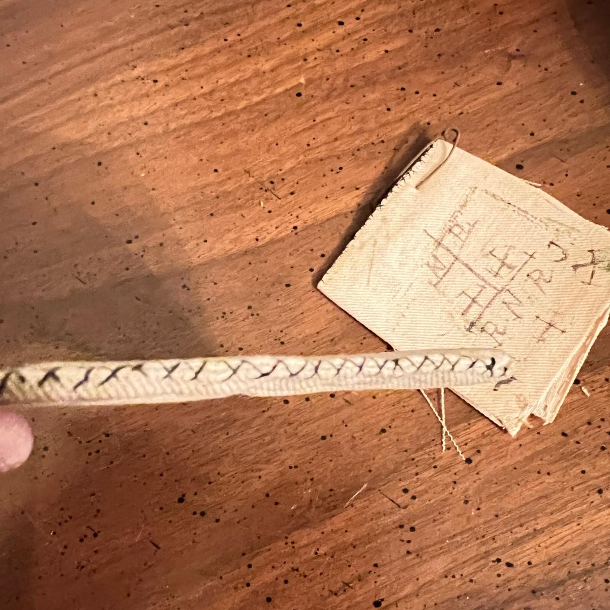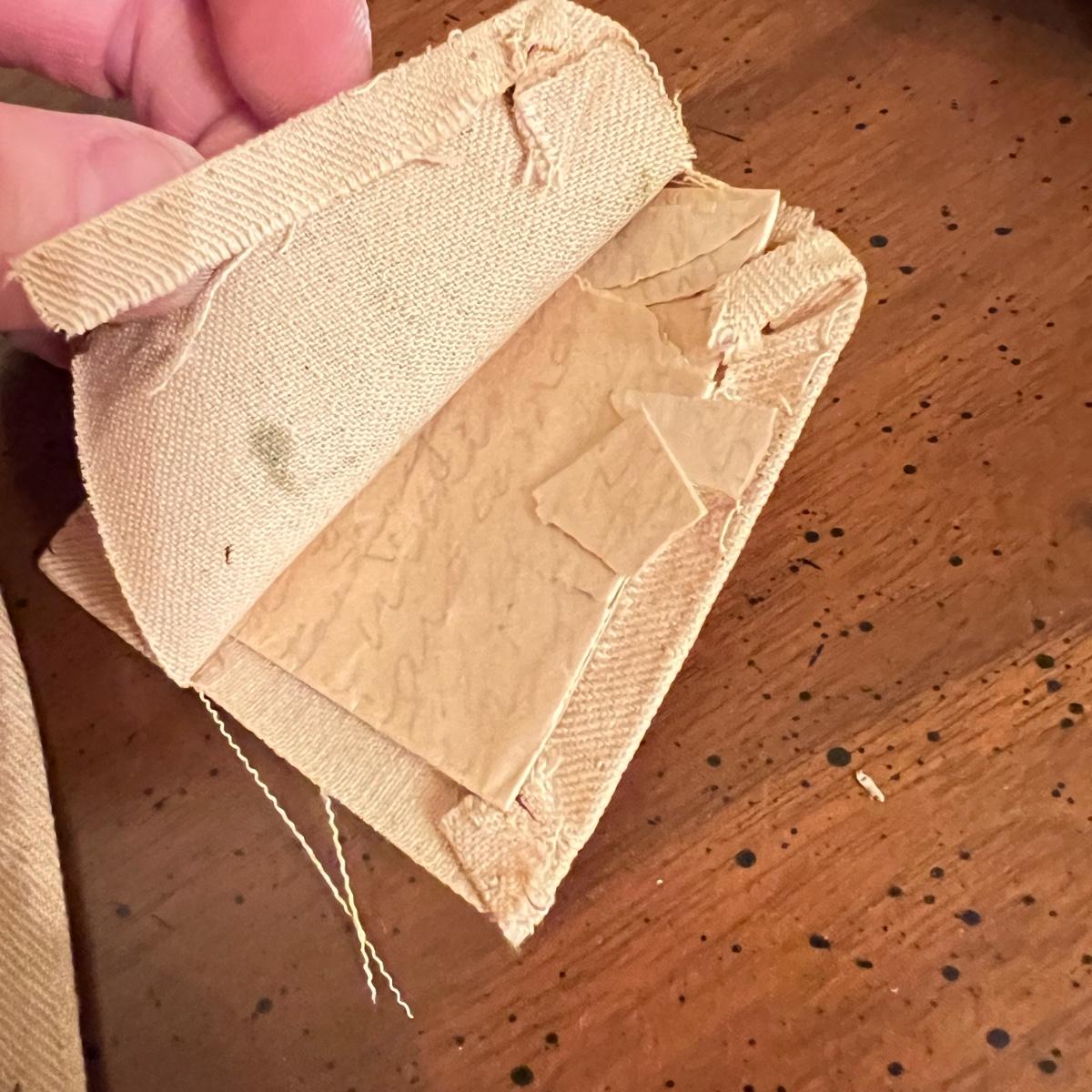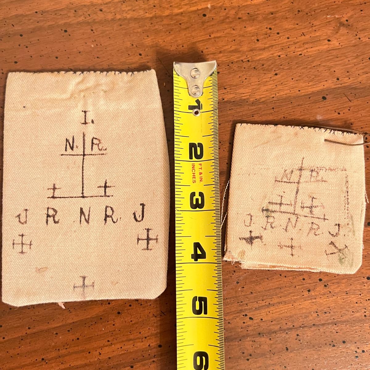 This lot was found together in an envelope. There are 2 small sewn fabric "envelopes". The smaller one has a seam that came undone and has a piece of folded paper in it. The other is completely sewn. All of the items in this lot were stored and found together.
