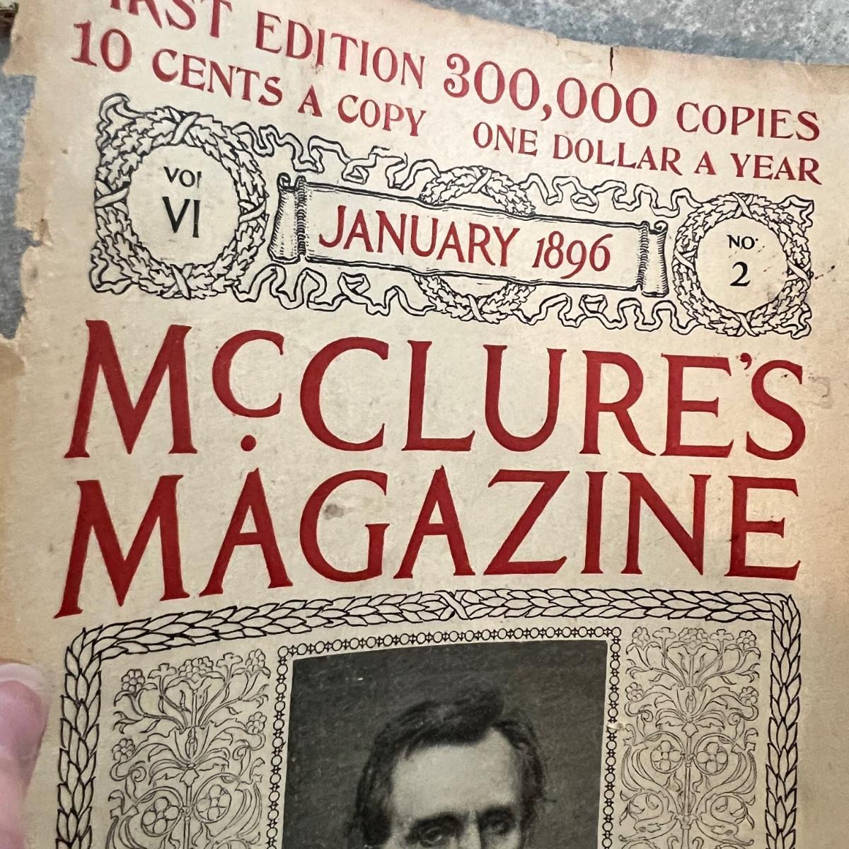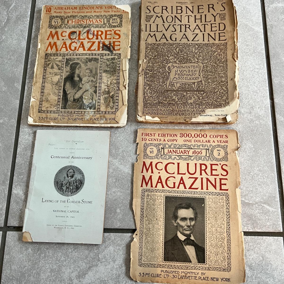 McClures Magazine 1895 and just the cover of one from 1896, Scribners Monthly Illustrated Magazine 1881. Soft cover Centennial Anniversary Laying of the Corner Stone of the National Capitol 1893. See all pics for conditions.