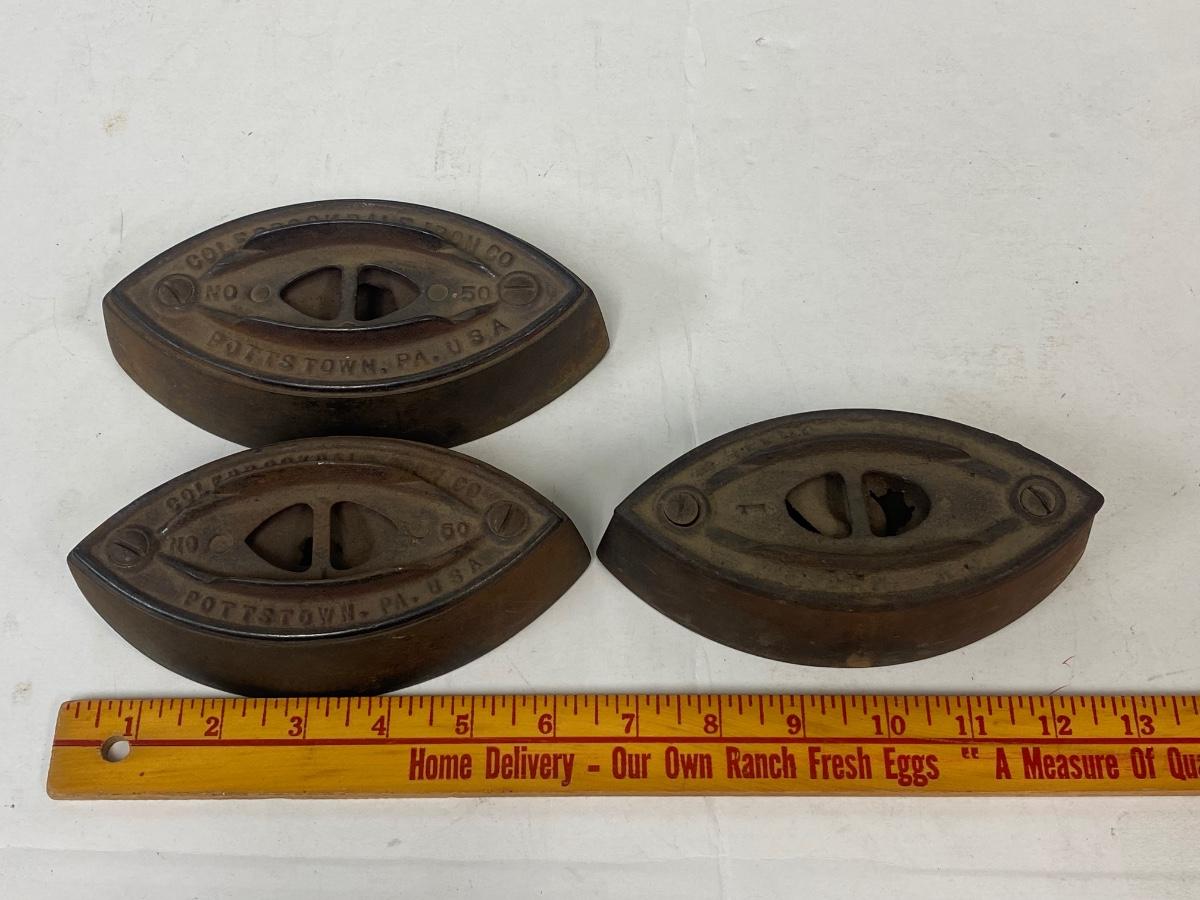 Antique Lot of 3 Cast Metal Sad Irons Colebrookdale Co Pottstown PA. All in good vintage condition. Display great. About the same size.