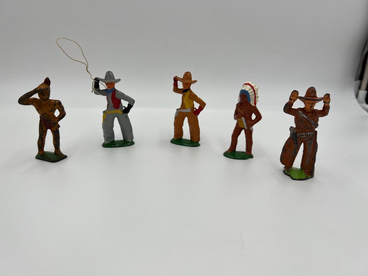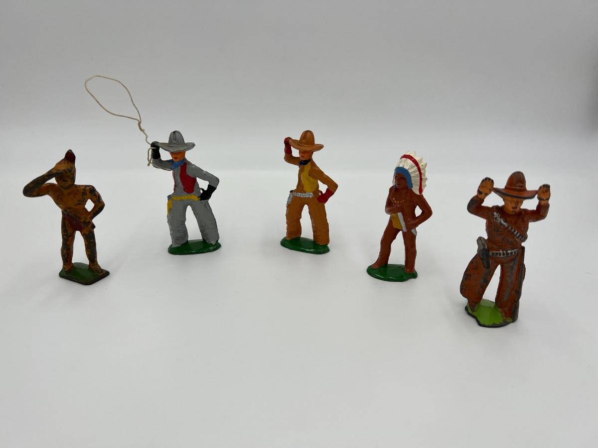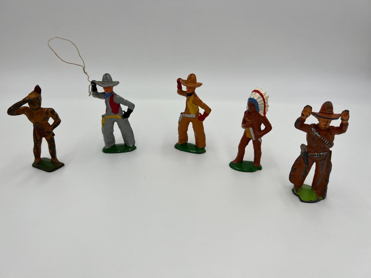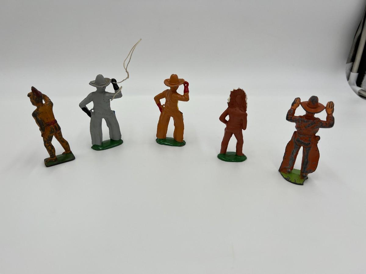 Antique Lot of 5 Cowboy and Indian Dime Store Figurine Toys. Made by Barclay USA. 3 cowboys, including one with a lasso rope, and 2 Indian figurines (Native American). Condition as shown,