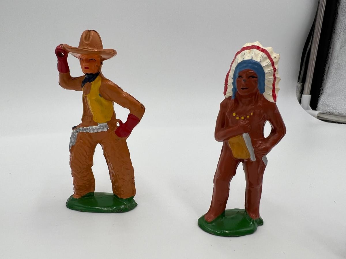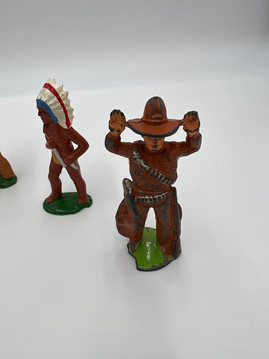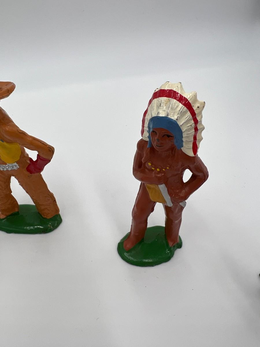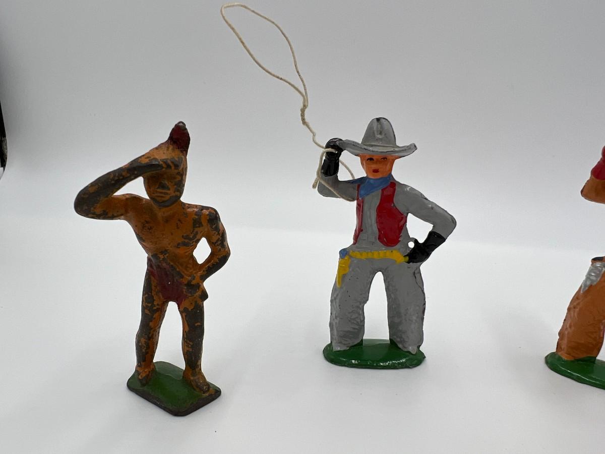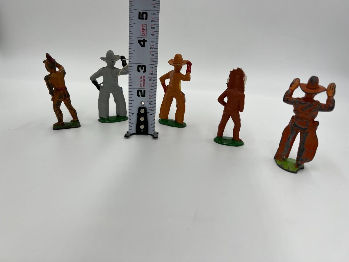 Antique Lot of 5 Cowboy and Indian Dime Store Figurine Toys. Made by Barclay USA. 3 cowboys, including one with a lasso rope, and 2 Indian figurines (Native American). Condition as shown,