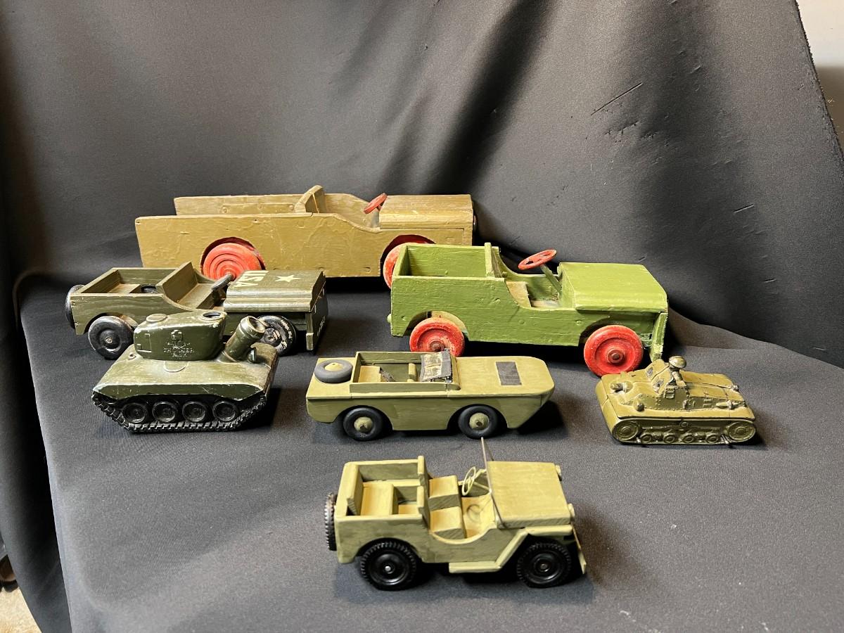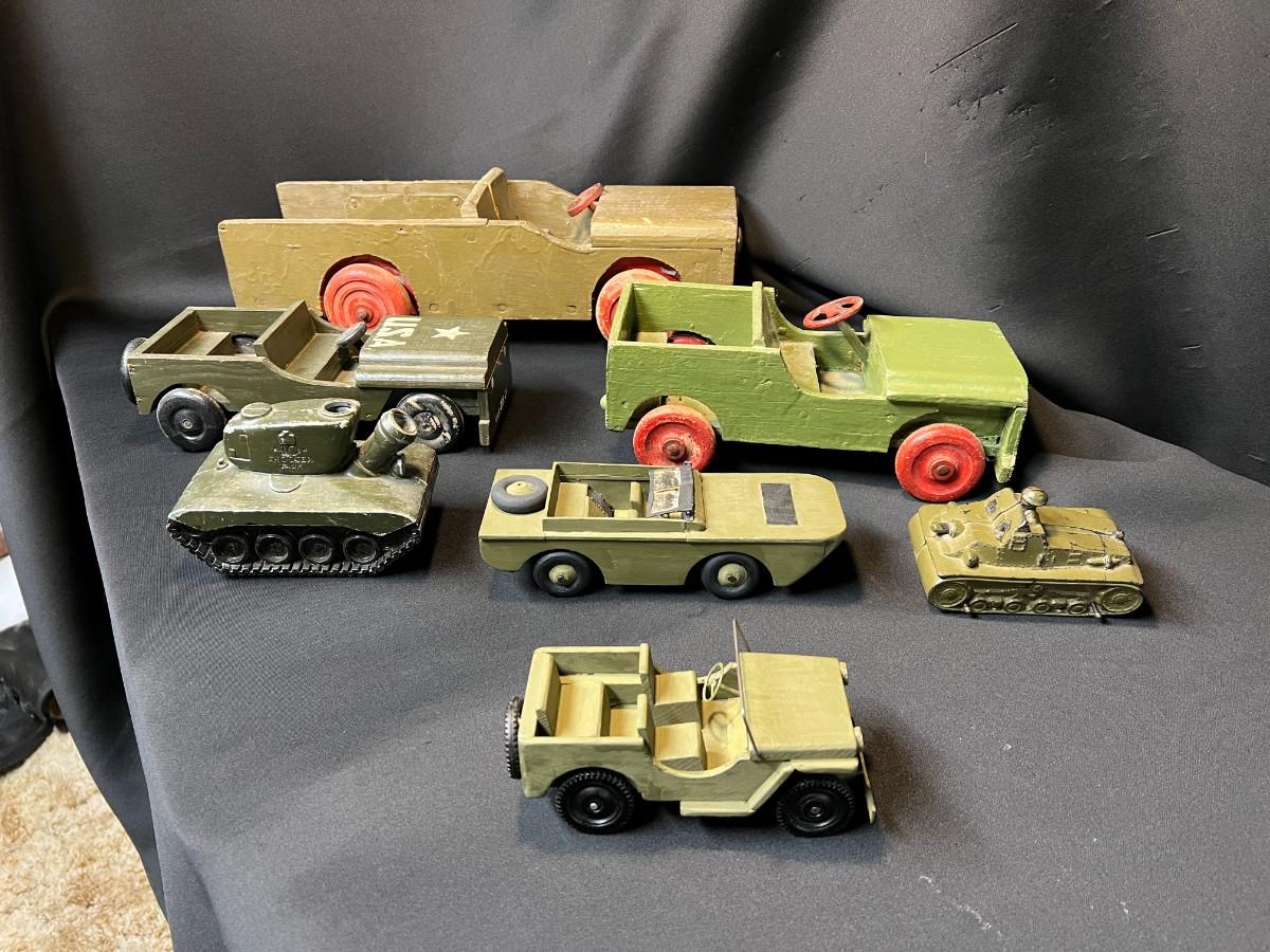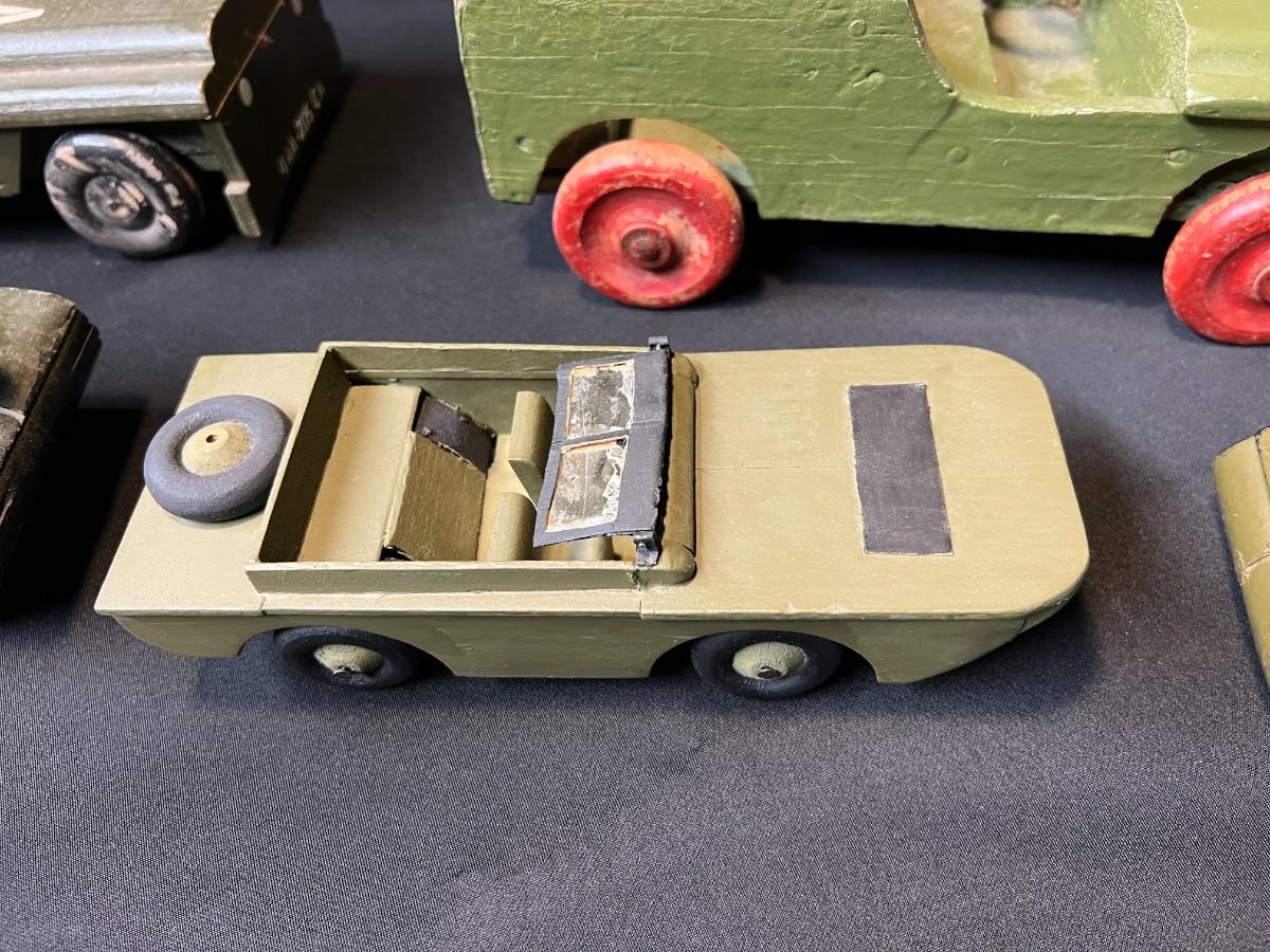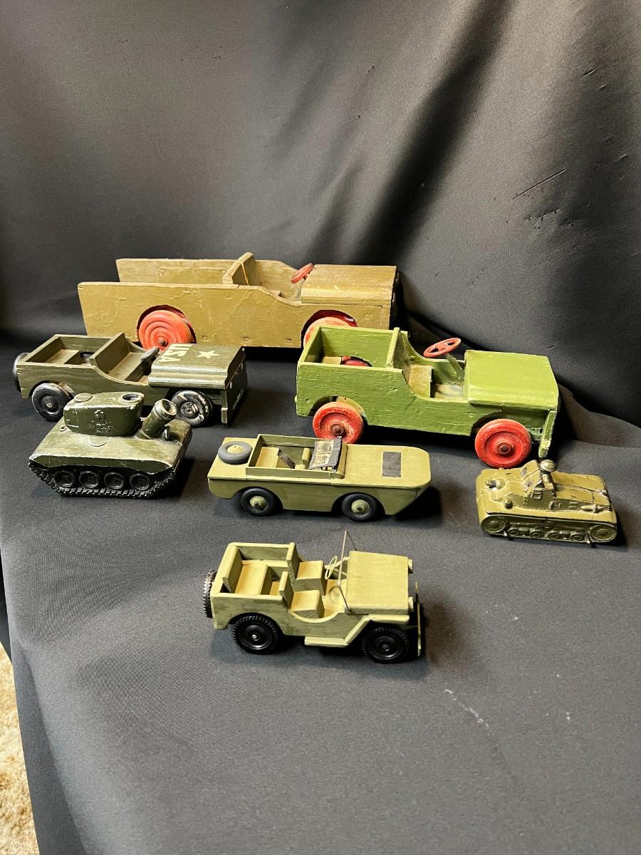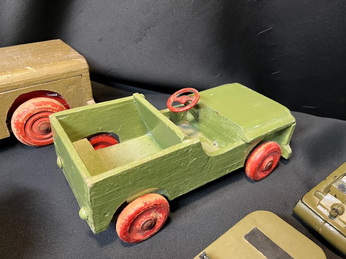 Antique Lot of 7 Military Vehicle Car and Truck Toys. One of the vehicles says "AUB-RUBH, Auburn IND, Made in USA". Condition as shown.