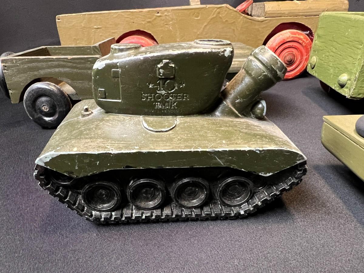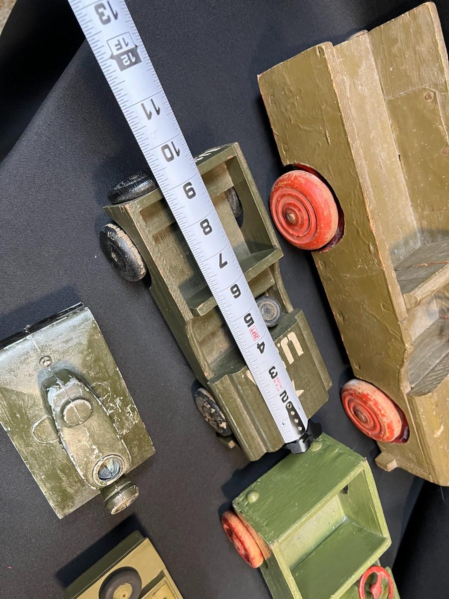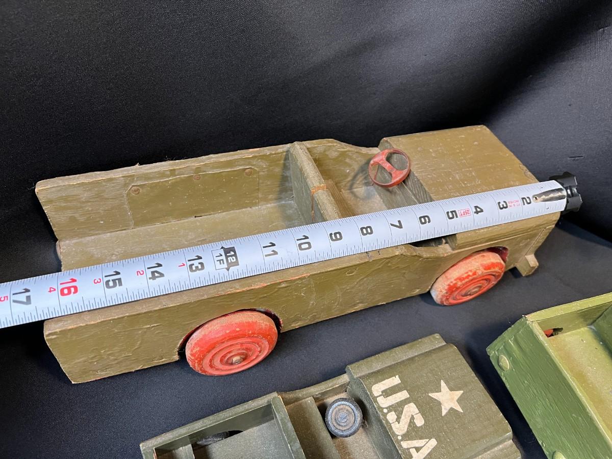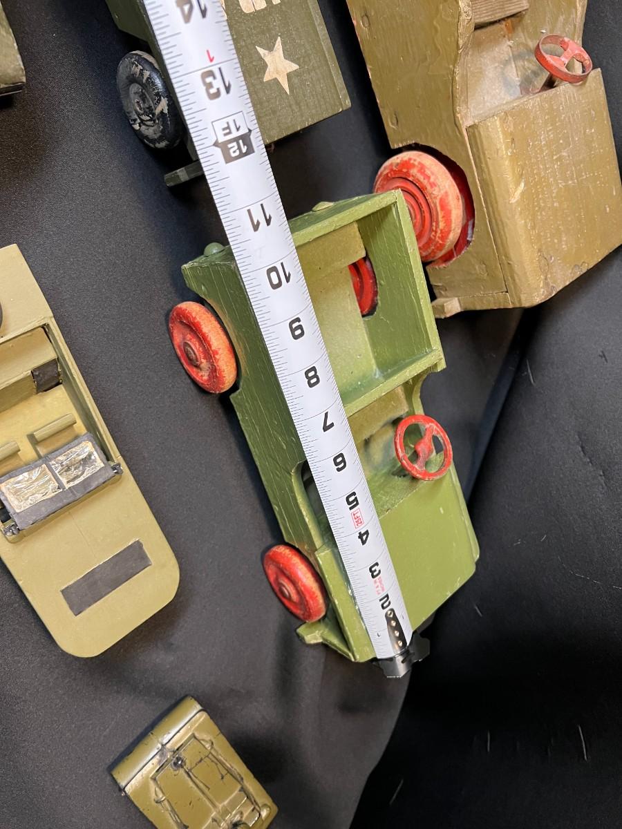 Antique Lot of 7 Military Vehicle Car and Truck Toys. One of the vehicles says "AUB-RUBH, Auburn IND, Made in USA". Condition as shown.