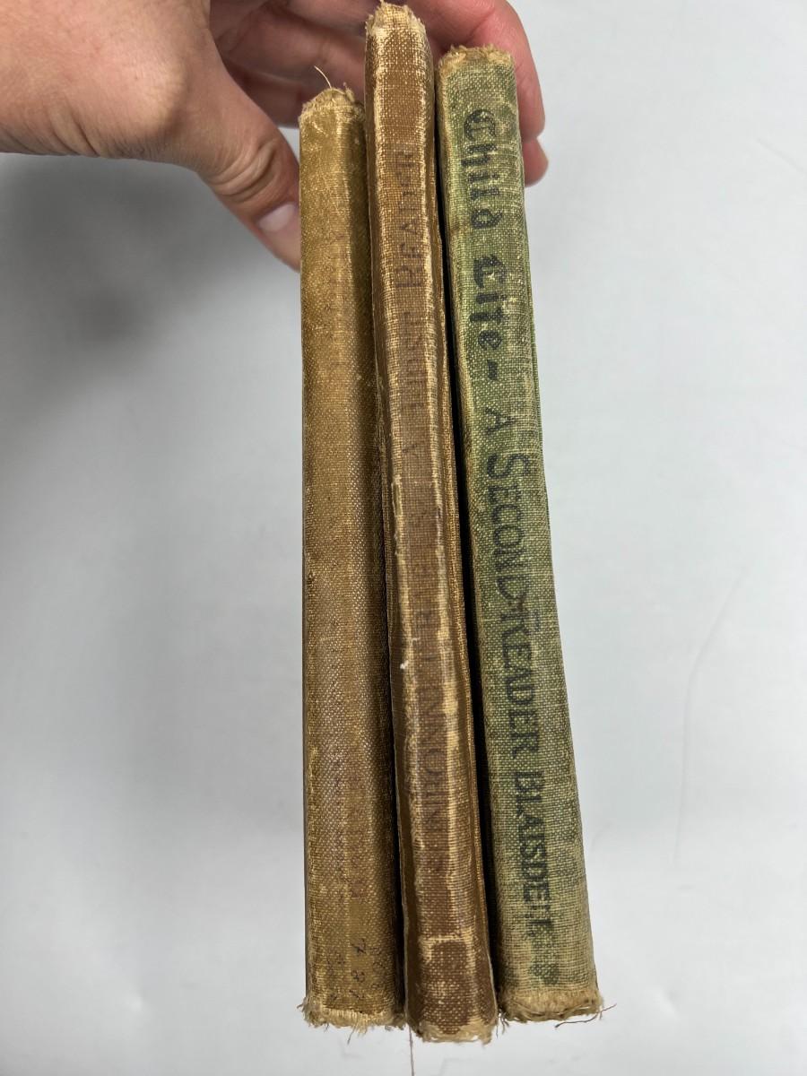 There is antique wear to the books in the lot, but there is no significant damage and is in overall good collectible or readable condition. Check pictures for more details and for sizing.