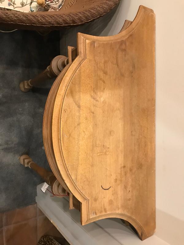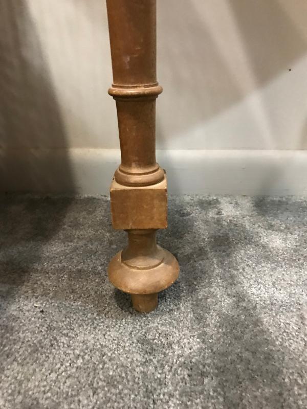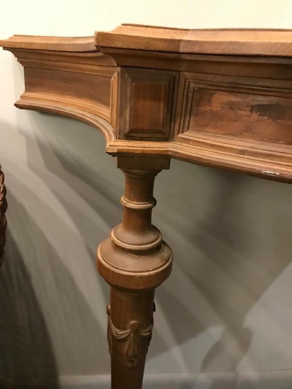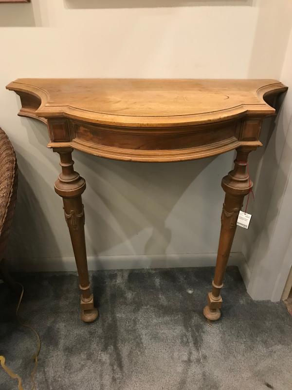 Antique late 18th century or early 19th century French walnur wall mount console table. Serpentine front with moulded skirt. Turned legs with carved swags and jabot. In a clean light walnut waxed finish. Excellent condition. 36" x 17 1/2" x 35" H.
