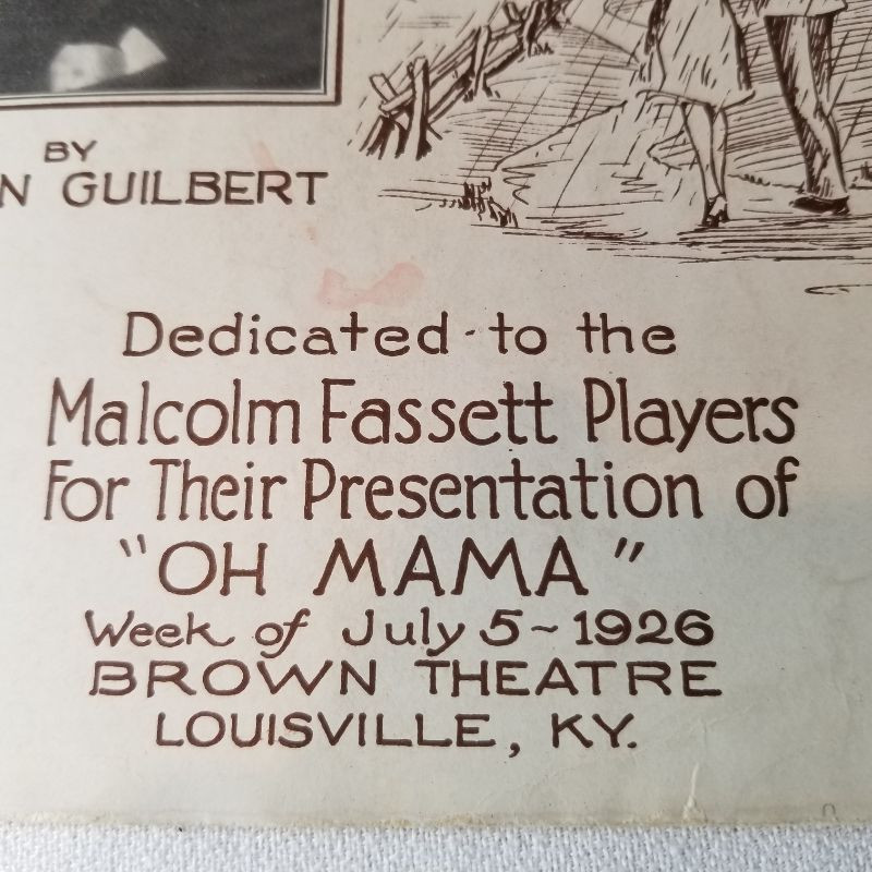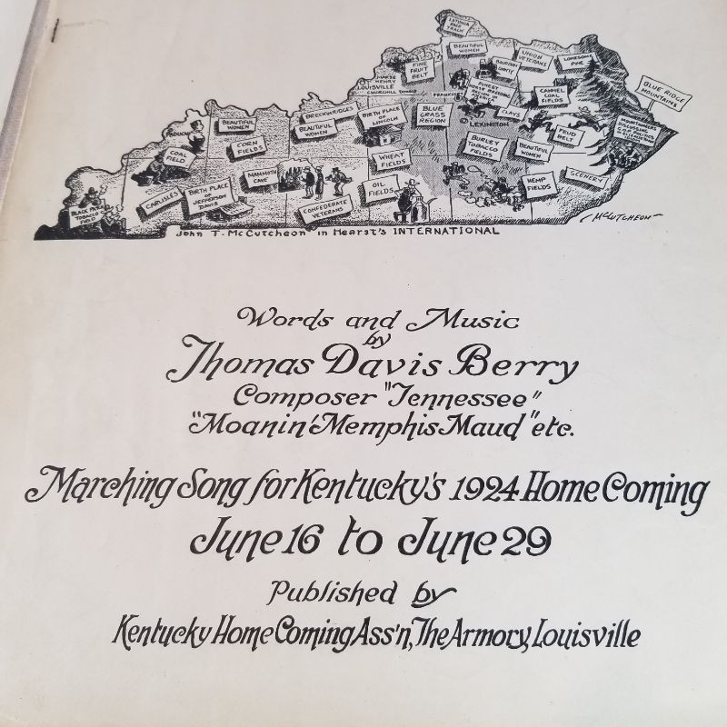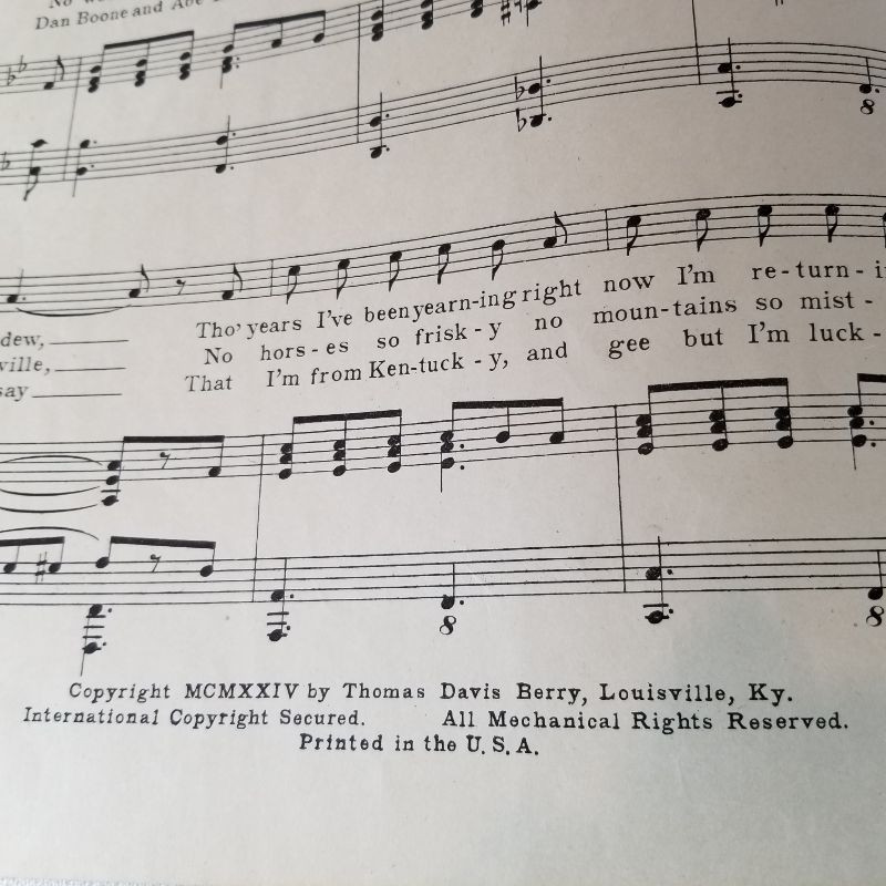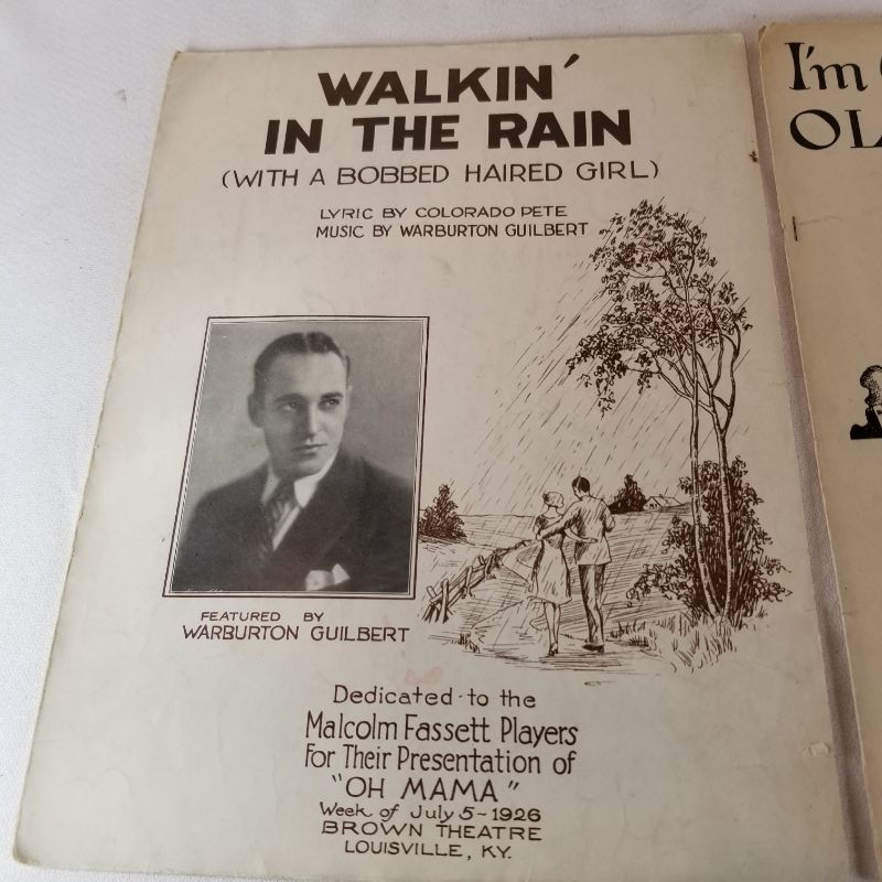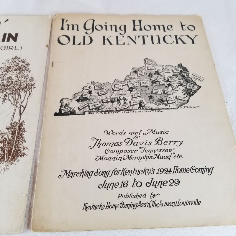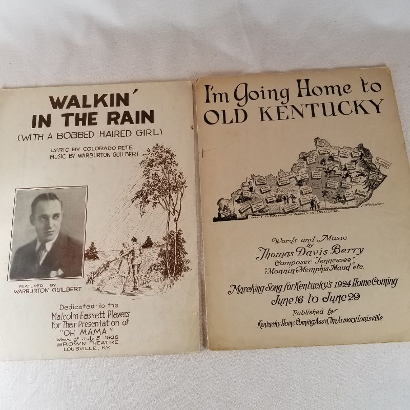"Walkin' in the Rain - performed at the Brown Theater in 1926 and I'm Going Home to Old Kentucky written by Thomas Davis Berry as a Marching Song for Kentucky's 1924 Home Coming. Both paper sheet music sets are in decent shape for their age and use. Some tears, yellowing and a little musty.. Just great pieces of Kentucky/Louisville History.