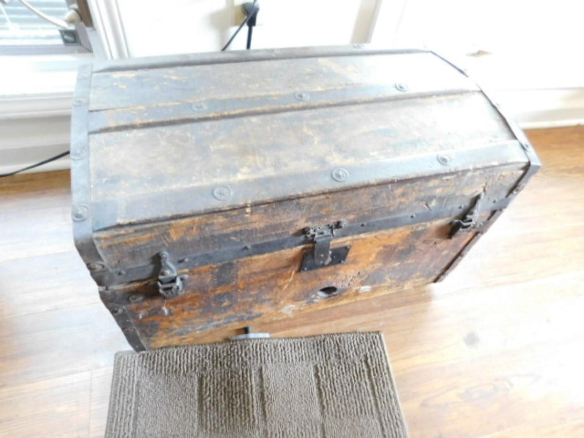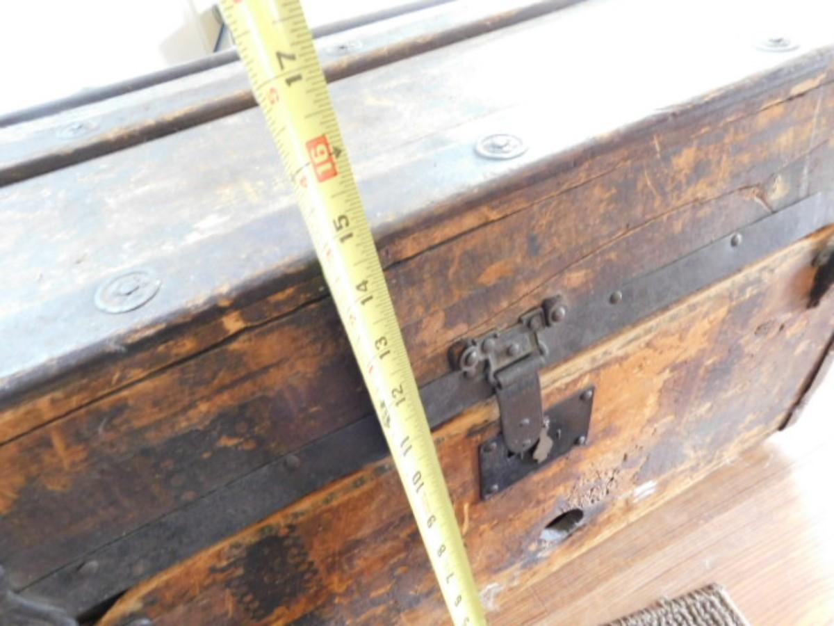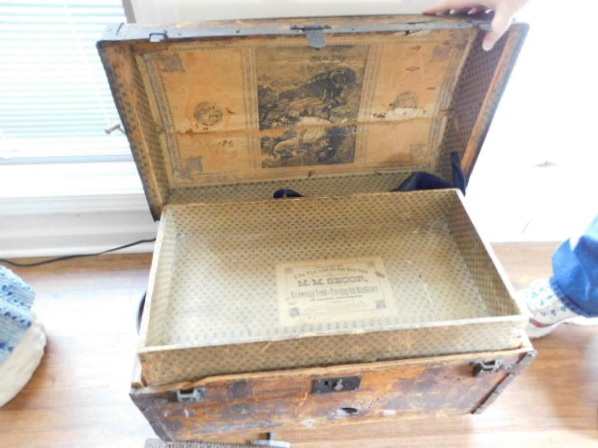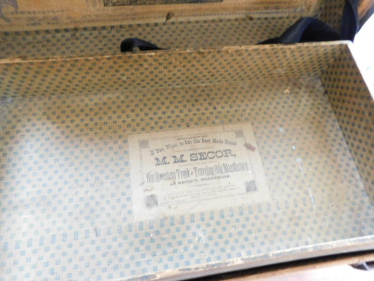 Antique M. M. Secor Wood Slat Travel Trunk with Tray Insert (No Contents) has a loose hinge and will need to be repaired. Great patina