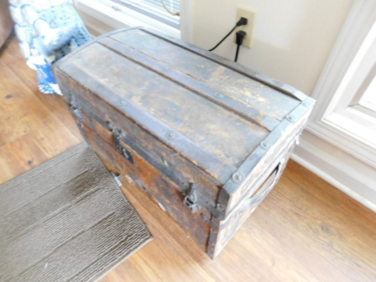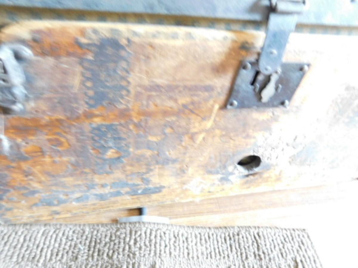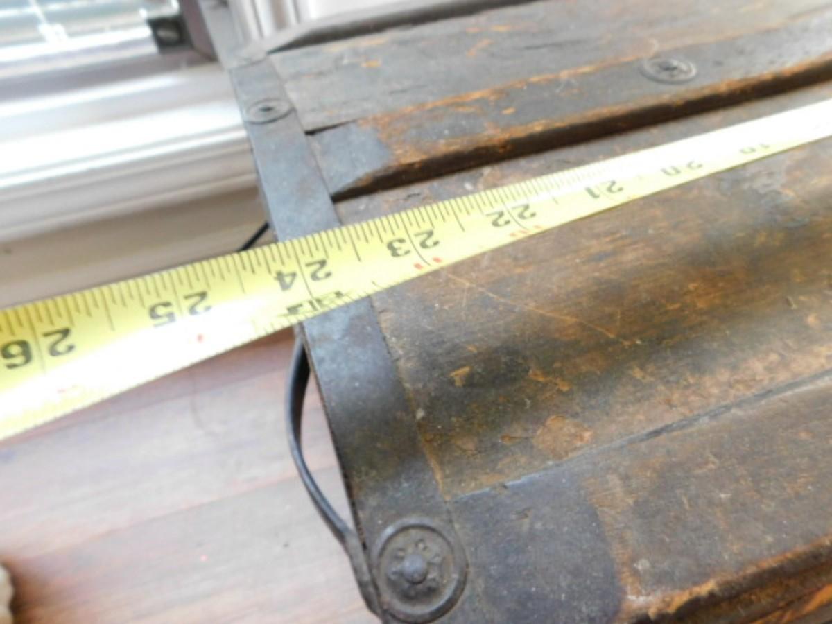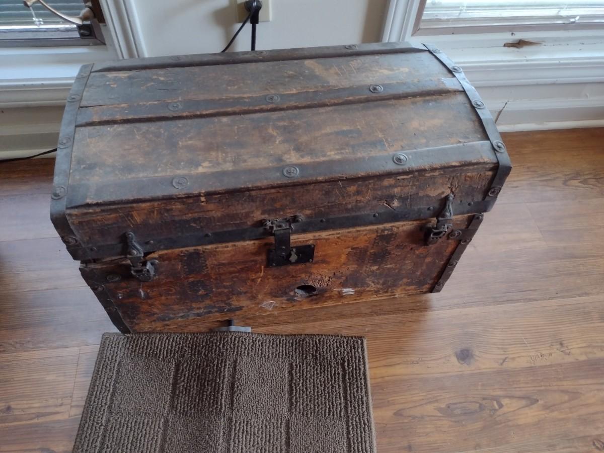 Antique M. M. Secor Wood Slat Travel Trunk with Tray Insert (No Contents) has a loose hinge and will need to be repaired. Great patina