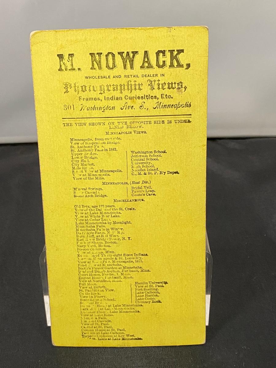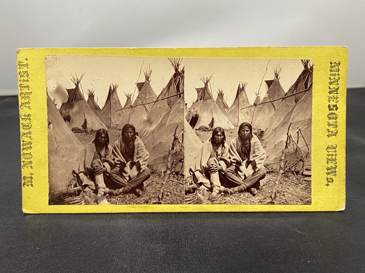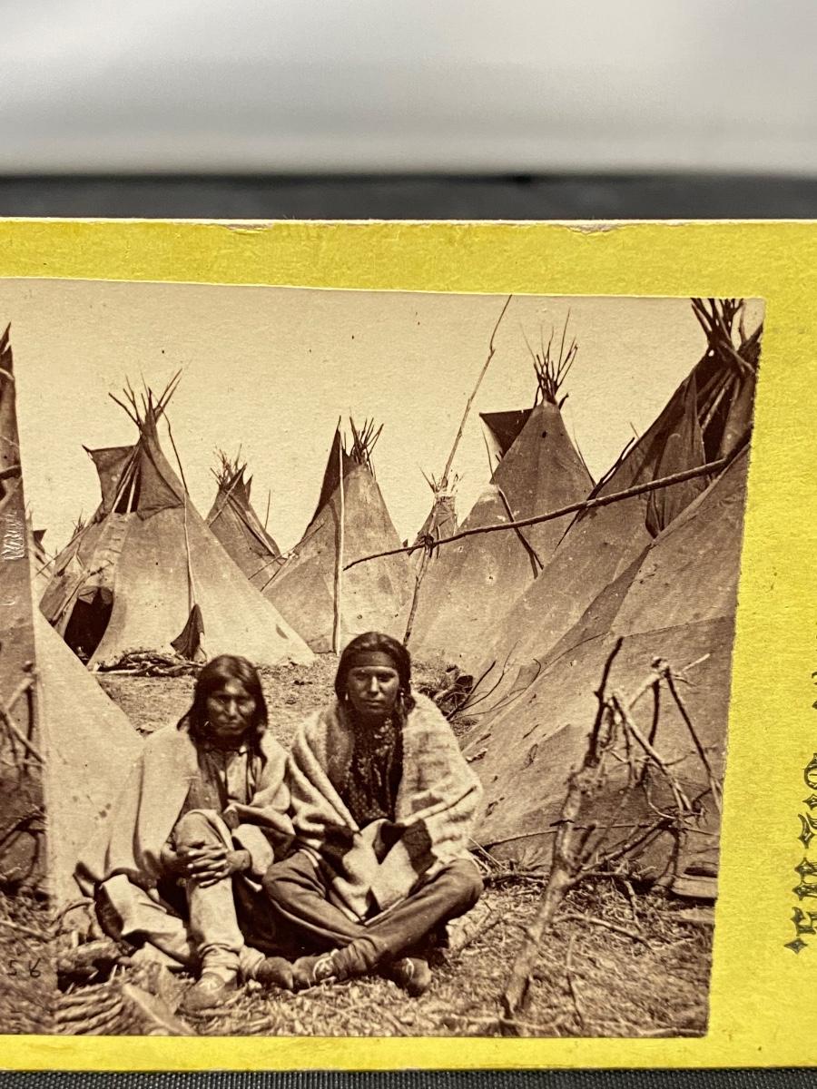 Antique stereoscope picture card of a pair of Native American Indians in front of teepees. From M. Nowack Photographic Views, Frames, Native American Curiosities, etc. Undated, early 1900s late 1800s. Good antique condition.