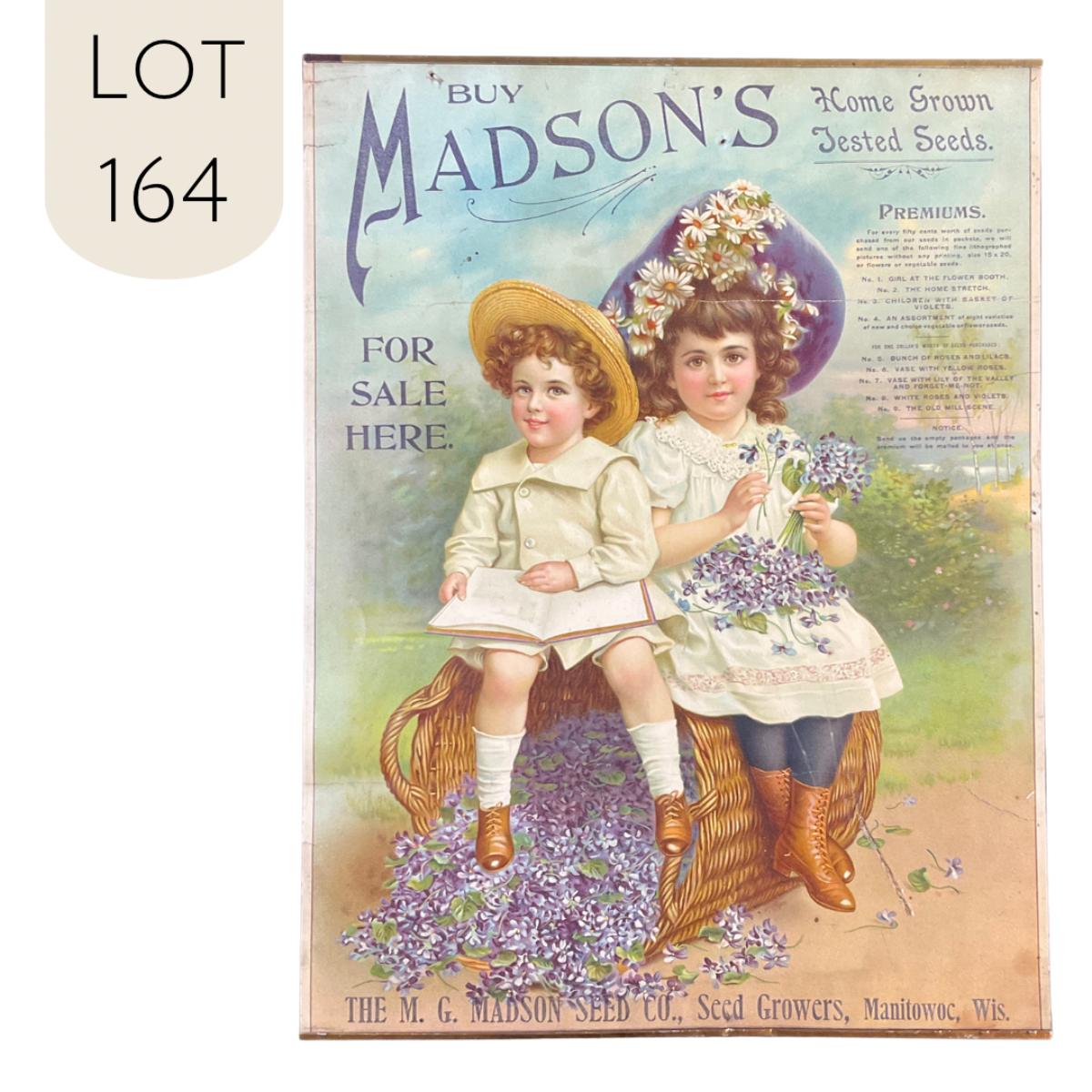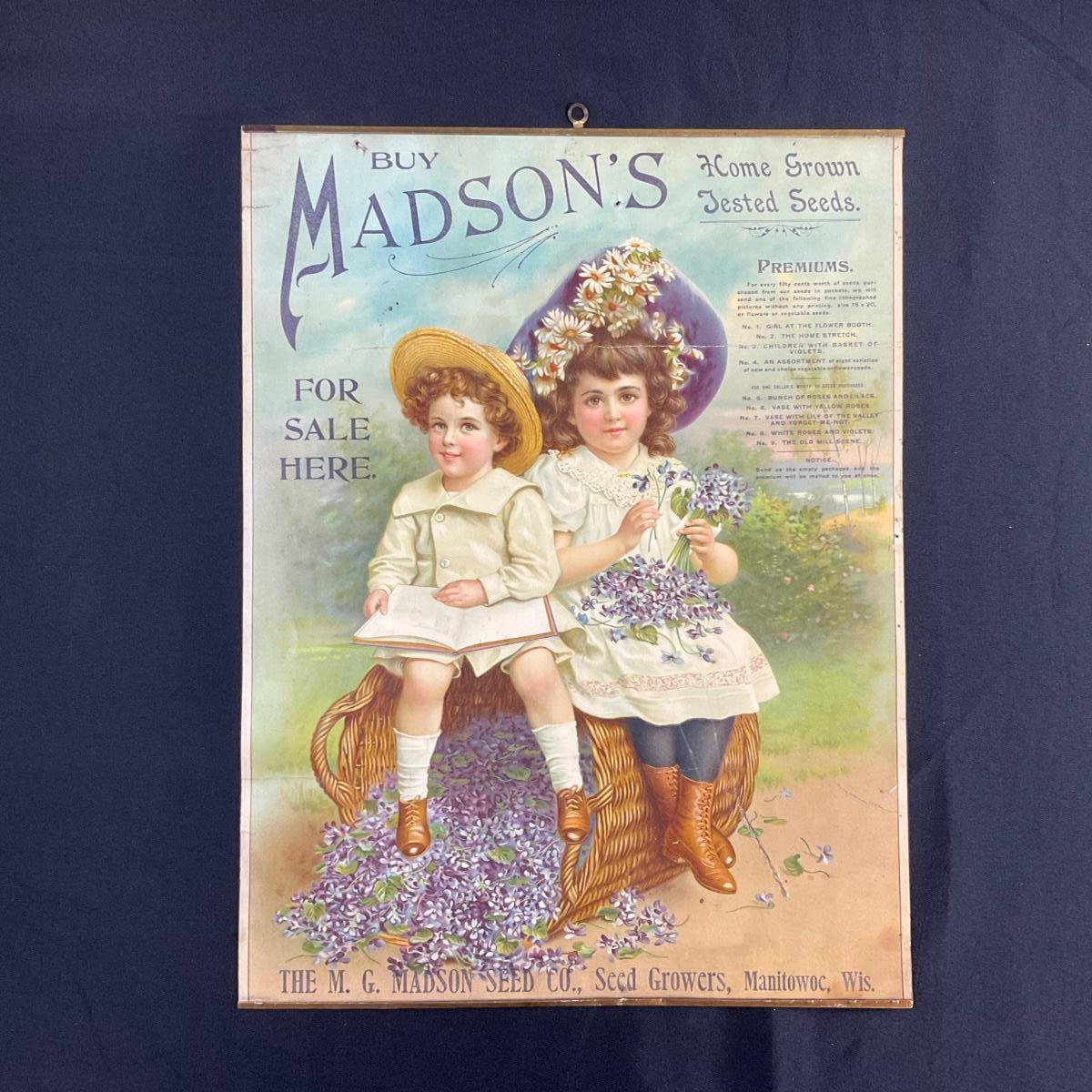 This isn't a calendar - ya got me. This Antique piece of Advertising was produced to promote Madson's Home Grown Tested seeds. Specifically the M G Madson Seed Company and Seed Growers of Manitowoc, Wisconsin. The artwork on this advertisement is of a young boy and girl sitting on a tipped over basket of violets. This piece measures 15" x 19 3/4". The colors on this piece are vibrant and clear. **|** Please see photos for details and condition. ::: Shipping is available on this lot. If you require shipping you must let us know at the close of the auction. We will coordinate with you after the item has been won. Shipping fees will include insurance up to or exceeding the value of all items being mailed. If you have any questions regarding this lot please contact the auctioneer either via this website, by direct email or by phone. PICK UP TIMES and other important information can be found in the TERMS and DESCRIPTION of the auction. Please take a look for pertinent information. Thanks!