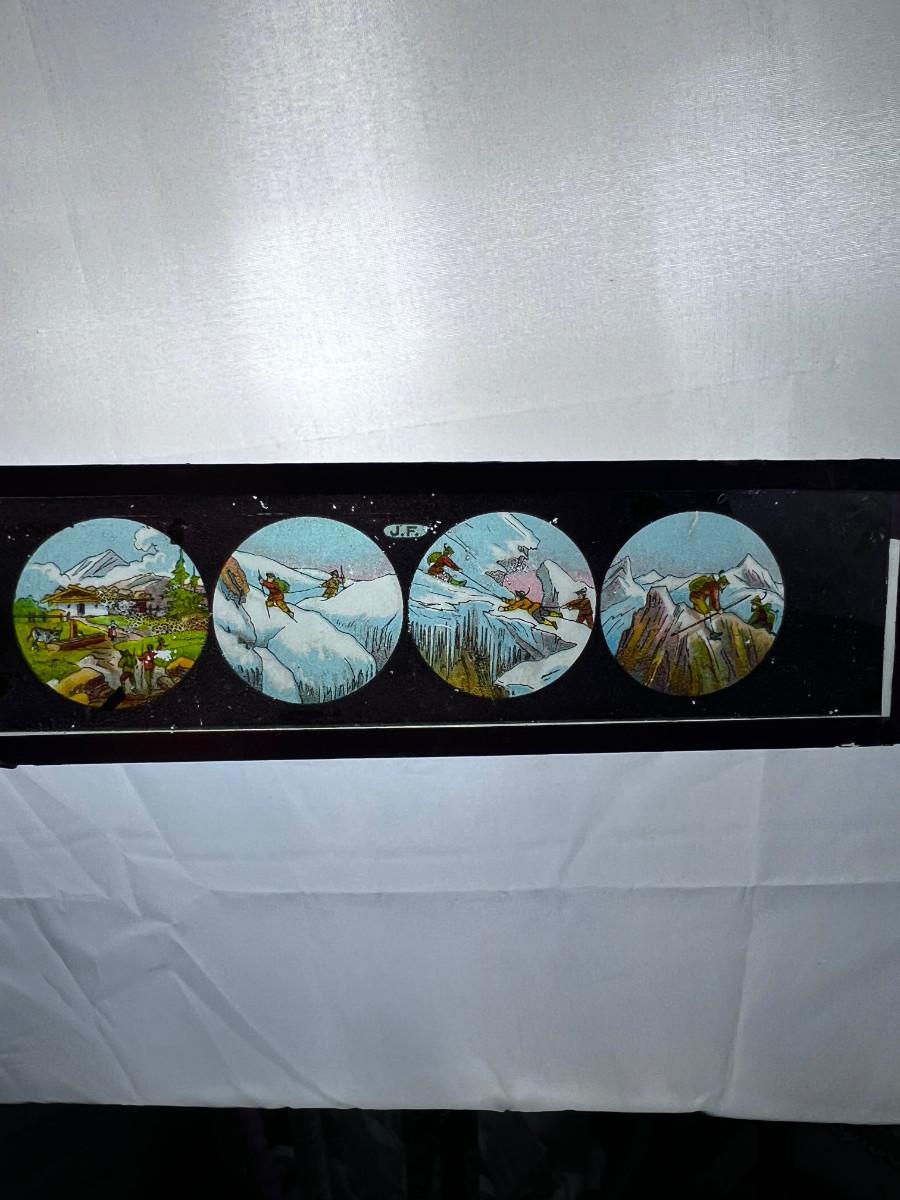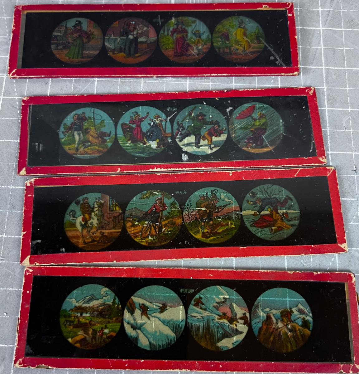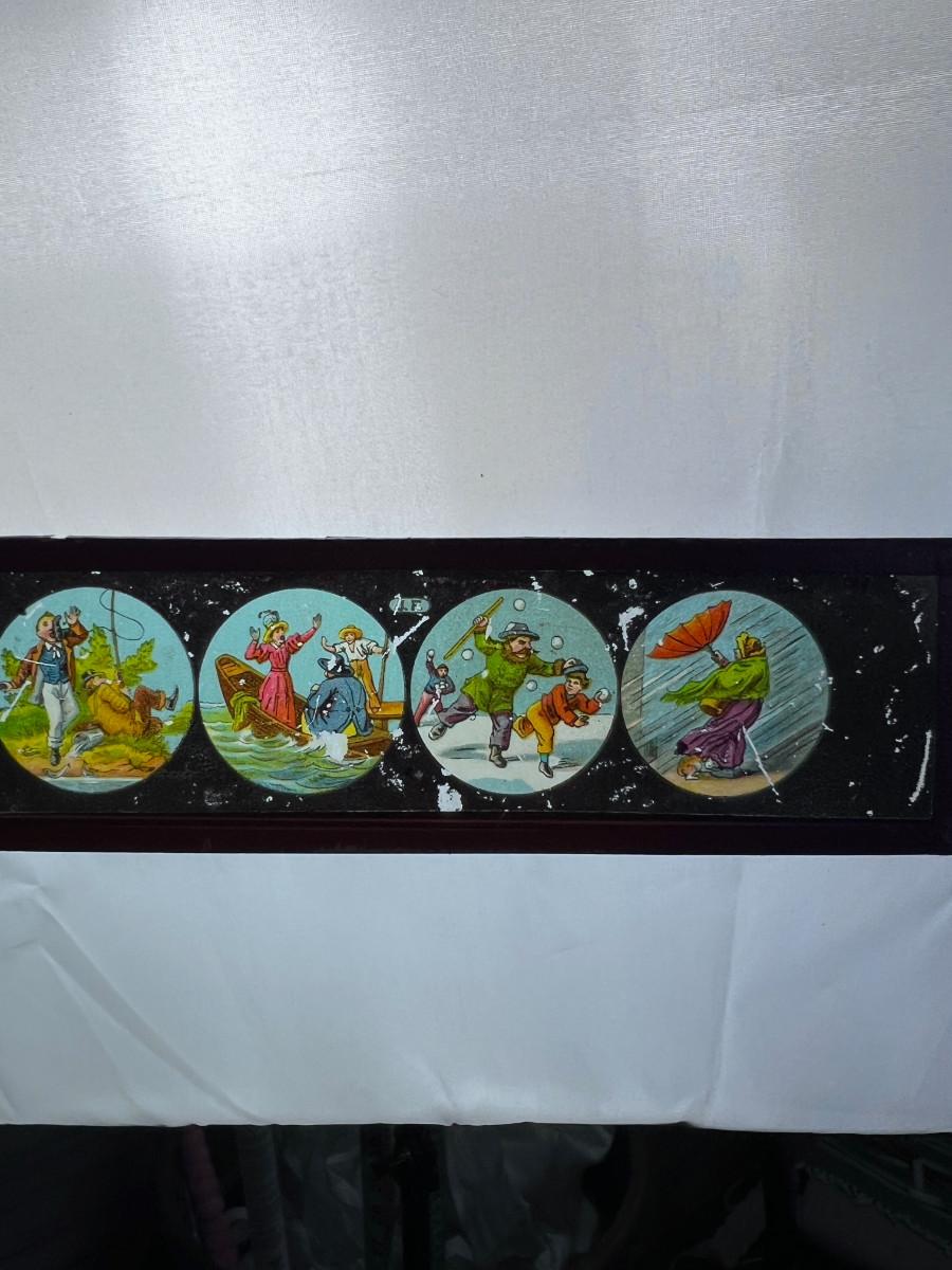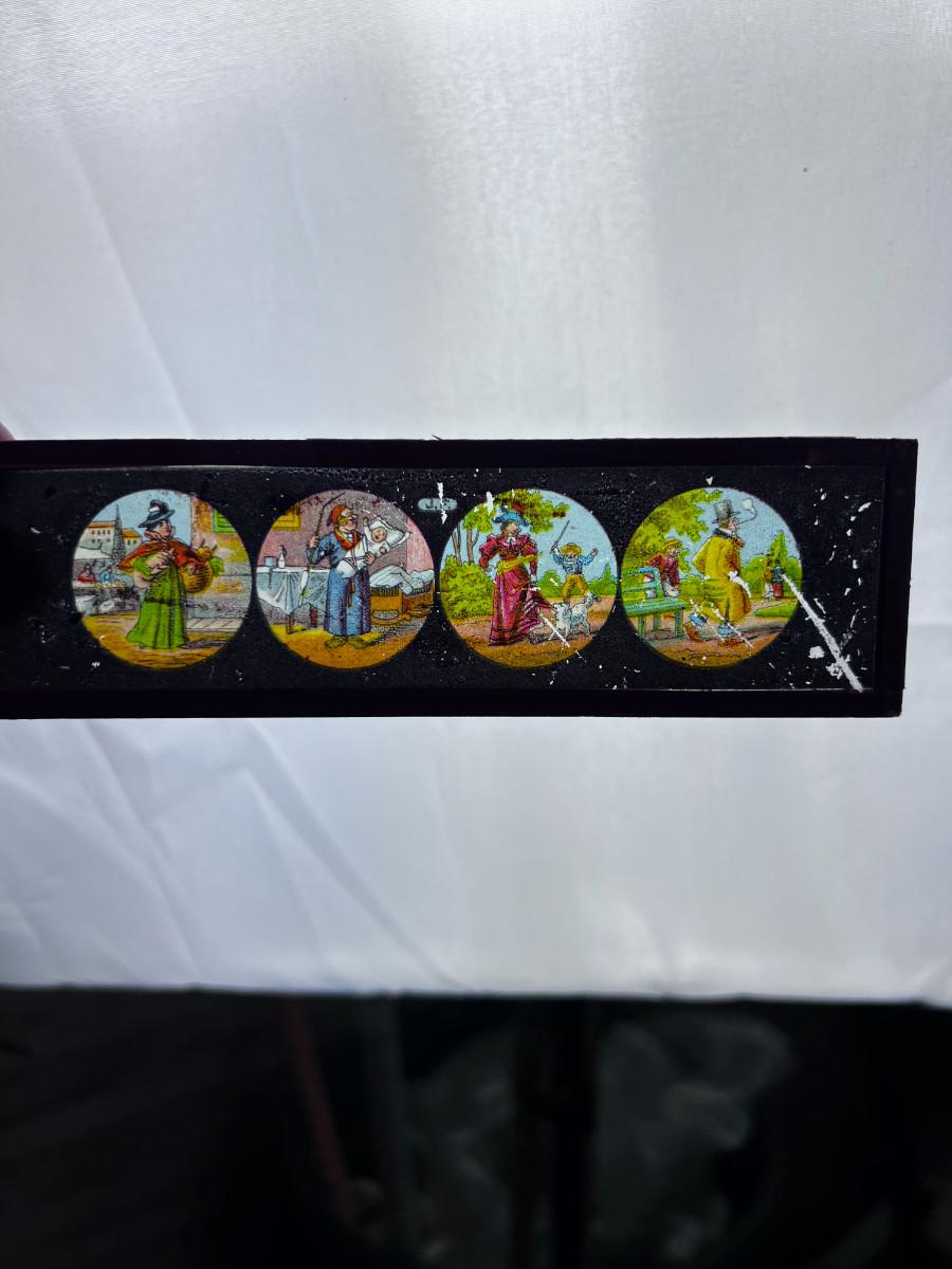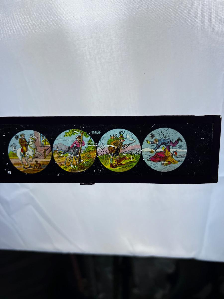 four(4) original long colored magic lantern slides from Johann Falk..a German company that began in 1895...They appear to be children’s toy magic lantern slides...Some wear on the black backgrounds...the images remain bright...6.25" 159mm x 1 13/16 46mm...As shown.